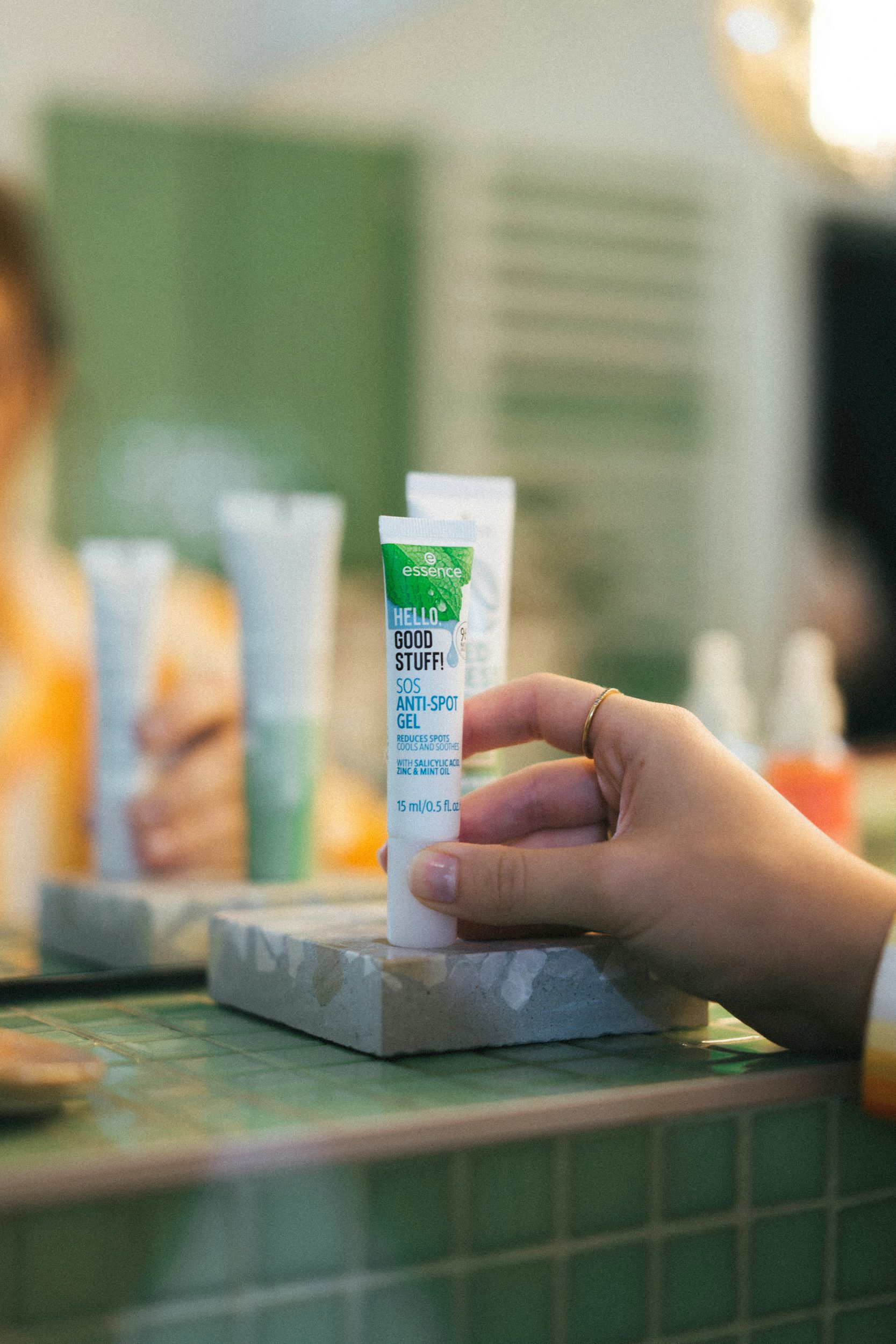 Das HELLO, GOOD STUFF! SOS ANTI-SPOT GEL ist hier ein echter Geheimtipp. Nach der Gesichtsreinigung etwas von dem Gel direkt auf den Pickel auftupfen – es trocknet Unreinheiten schnell aus, kühlt und beruhigt. Ansonsten gilt: Finger weg! Also, nicht am Pickel herumdrücken, sondern ihn in Ruhe abheilen lassen.