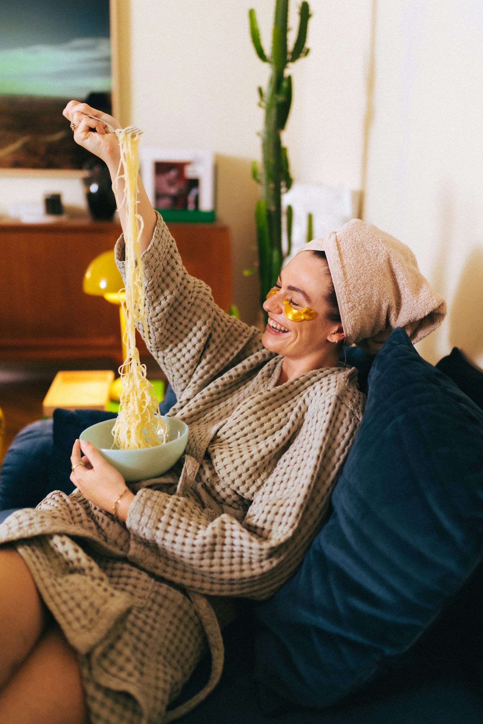 Zeit für mich selbst muss gar nicht spektakulär sein, ich brauche weder Spa-Wochenenden in Luxushotels mit Massagen noch ein Drei-Gänge-Menü, das ich mir stundenlang in meiner Küche zubereite. Ich mag es simpel, ich mag es relaxt, ich bin einfach gerne ich – tanze und singe (zur Freude meiner Nachbar*innen) zum neuen Album von Taylor Swift, esse Spaghetti und schaue Netflix oder probiere neue Beauty-Looks mit bunten Eyelinern, knalligem Rouge und roten Lippen aus. Und vor allem nehme ich mir viel Zeit für meine Hautpflege.