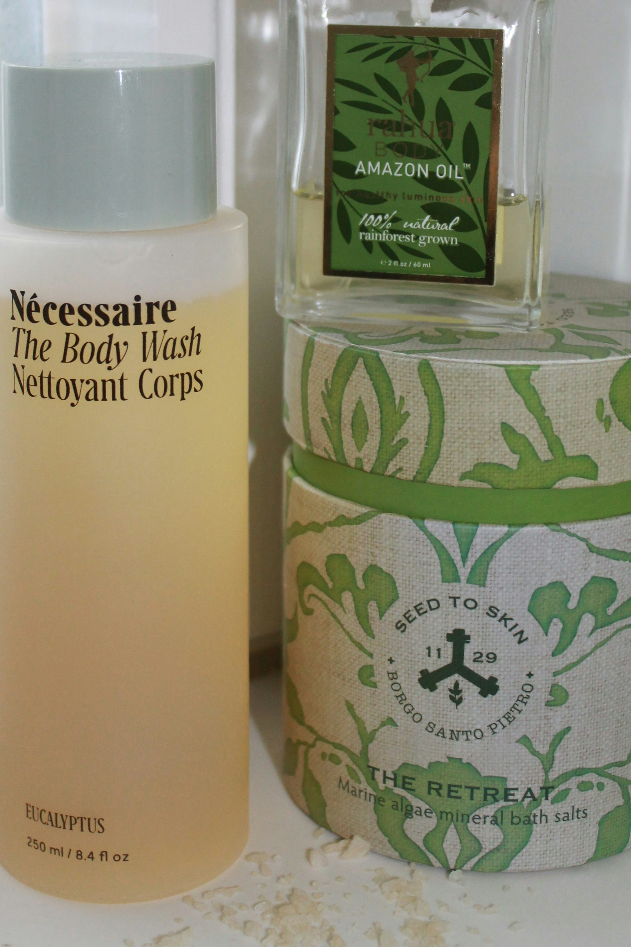 Es muss aber kein heißes Bad sein, um sich selbst oder dem Körper eine ausgiebige Wohlfühleinheit zu bescheren. Manchmal reicht auch ein gutes Körperpeeling, mit dem man die Durchblutung anregt, ein herrliches Körperöl, welches die Körperhaut einhüllt. Denn, wenn wir ehrlich sind, räumen wir unserer Haut südlich unseres Dekolletés wenig Liebe und Zeit ein. Ich tue es definitiv nicht genug. Wenn ich aber mal was mache, dann greife ich sehr gerne zum Rahua Body Oil, dem Badesalz von Seed to Skin und unter der Dusche umhüllt mich der Geruch von Eukalyptus dank dem Nécessaire Body Wash. Eine Wohltat für alle Sinne.