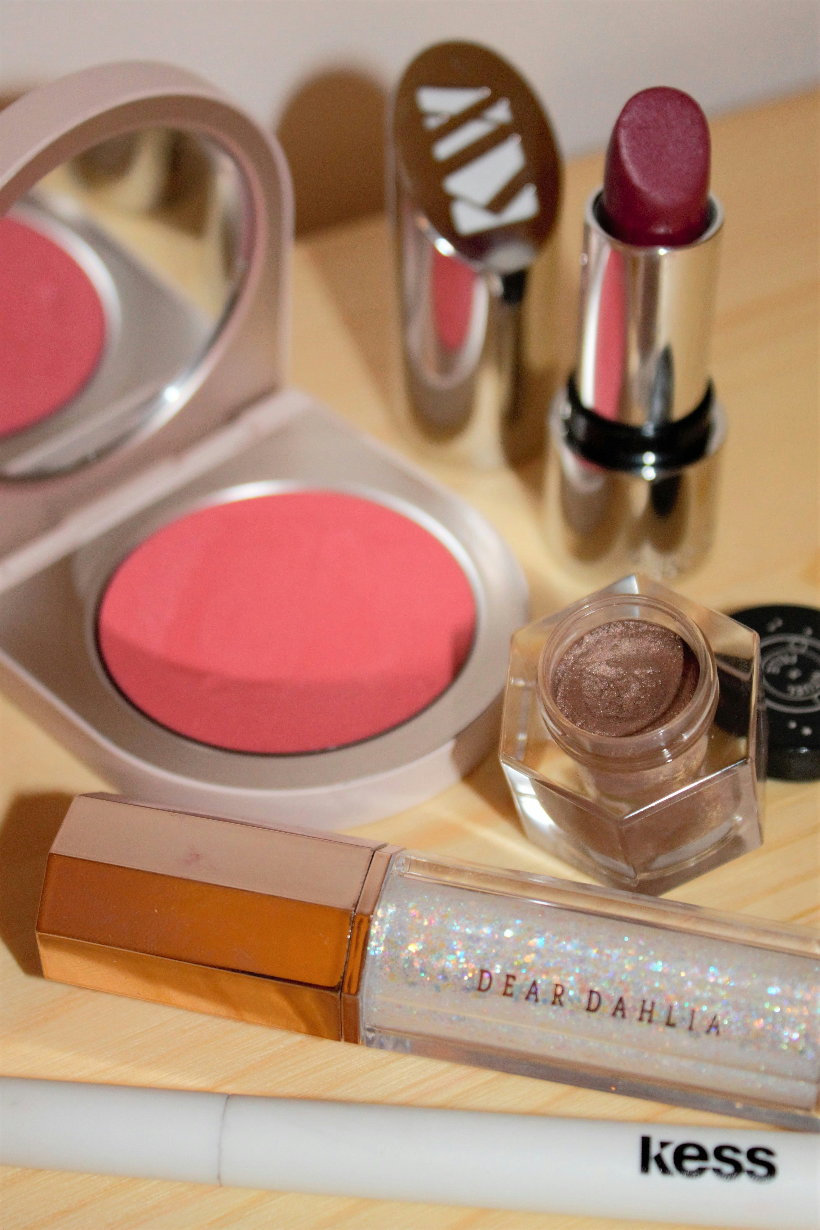 Die Augenlider habe ich in einen Bronzeton mit Satin-Finish gehüllt. Der Cream-to-Powder-Lidschatten von Rituel de Fille in der Farbe Half Light habe ich auf das gesamte Lid aufgetragen und einen natürlichen Schatten an der äußeren Lidfalte mit einem leicht dunkleren Ton kreiert. Ein Mini-Wing mit einem Liquid Liner gemalt, Mascara und fertig…?! Da fehlt doch etwas! Um den sanften Look zu brechen, habe ich die Paradise Shine Eye Sequins von Dear Dahlia in einem kühlen mehrdimensionalen Glitter auf die Mitte des Lids aufgetragen. Das bricht den Look und macht ihn interessant. Etwas pinkes Rouge auf die Wangen et voilà: Soft Glam mit Sternenstaub auf den Lidern.