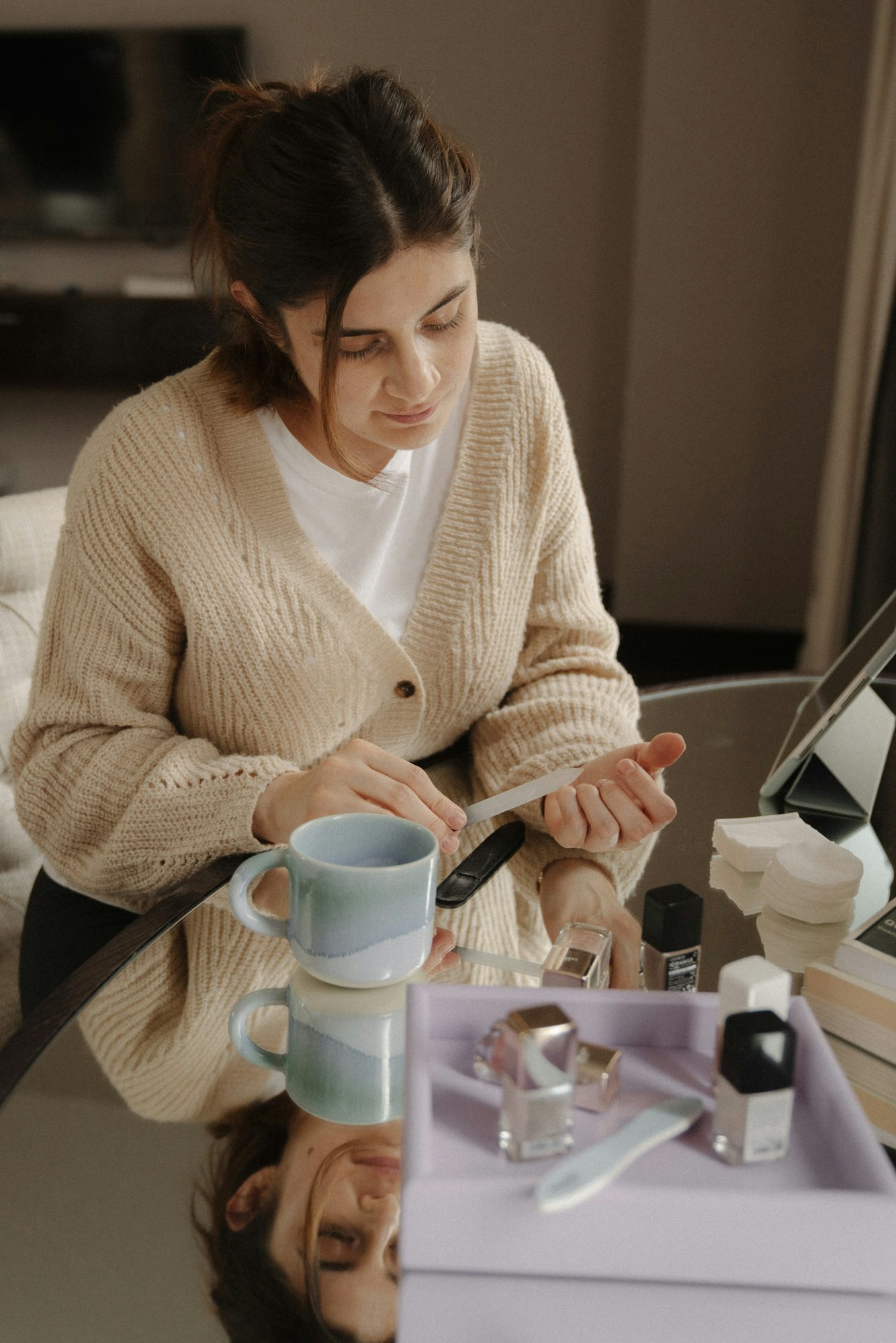 Dann zünde ich eine Duftkerze an, lasse Filmmusik laufen und fange mit der Nagelpflege an. Der Prozess an sich ist gar nichts Aufregendes. Es geht eher darum, sich selbst zu erlauben, ganz bewusst Zeit für sich selbst einzuräumen. Mit den eigenen Gedanken allein zu sein und sich selbst und alles, was wir bewerkstelligen, wertzuschätzen.