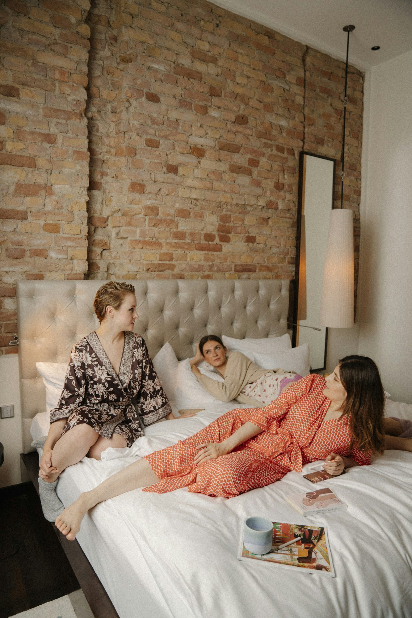 Doch Zuhause sein bedeutet diesen Herbst ja vielleicht nicht mehr die ganze Zeit alleine zu sein. Dank Impfung und Tests können wir in intimer Runde auch gemeinsam Happy Rituale erleben – und vielleicht ja auch neue Traditionen schaffen? Wir, Sarah, Julia und Marie, sind nicht nur beruflich ein gutes Team, sondern auch privat befreundet. Und um zusammen zu sein, brauchen wir weder Clubs, noch Restaurants, sondern nur einen Mädelsabend zu Hause – am liebsten in einem riesigen Bett.