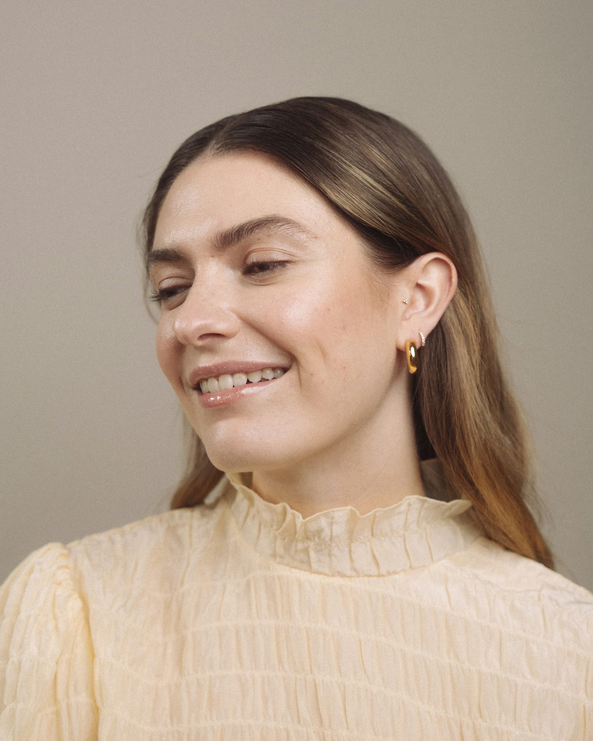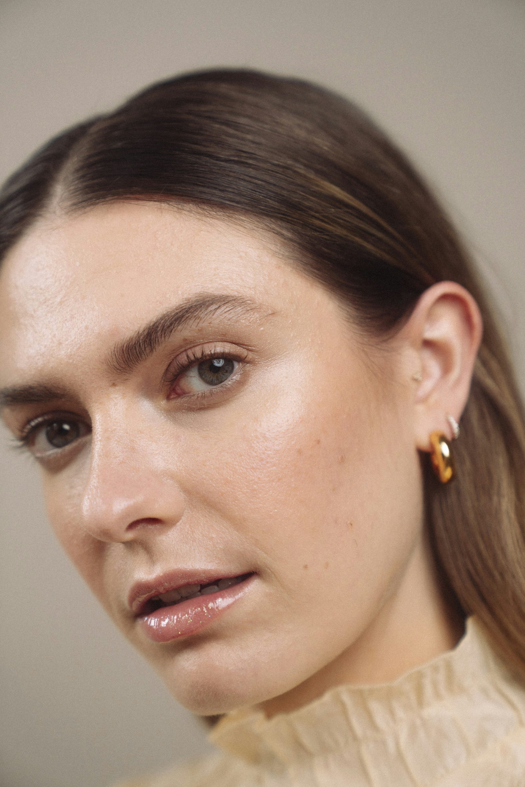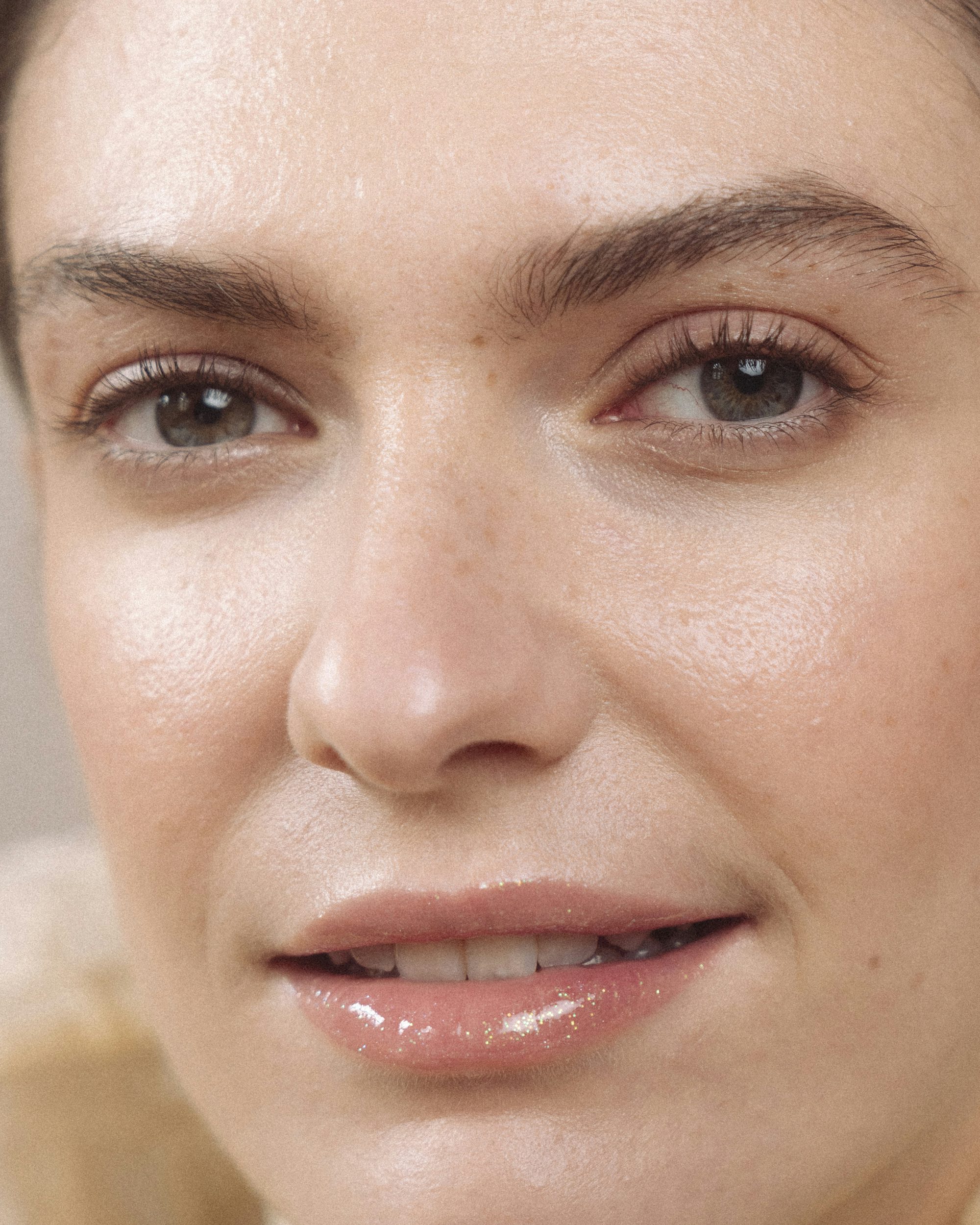 Safe and sound! Der Nude-Look mit Lipgloss gelingt einfach immer. Wichtig hierfür: eine ebenmäßige Base, akzentuierte Augenbrauen und eine gesunde, glowy Hautstruktur. Damit der Look nicht zu Basic ist, greife ich zum Lipgloss mit Schimmer-Effekt in Gold, das passt auch perfekt zu meinem Goldschmuck.