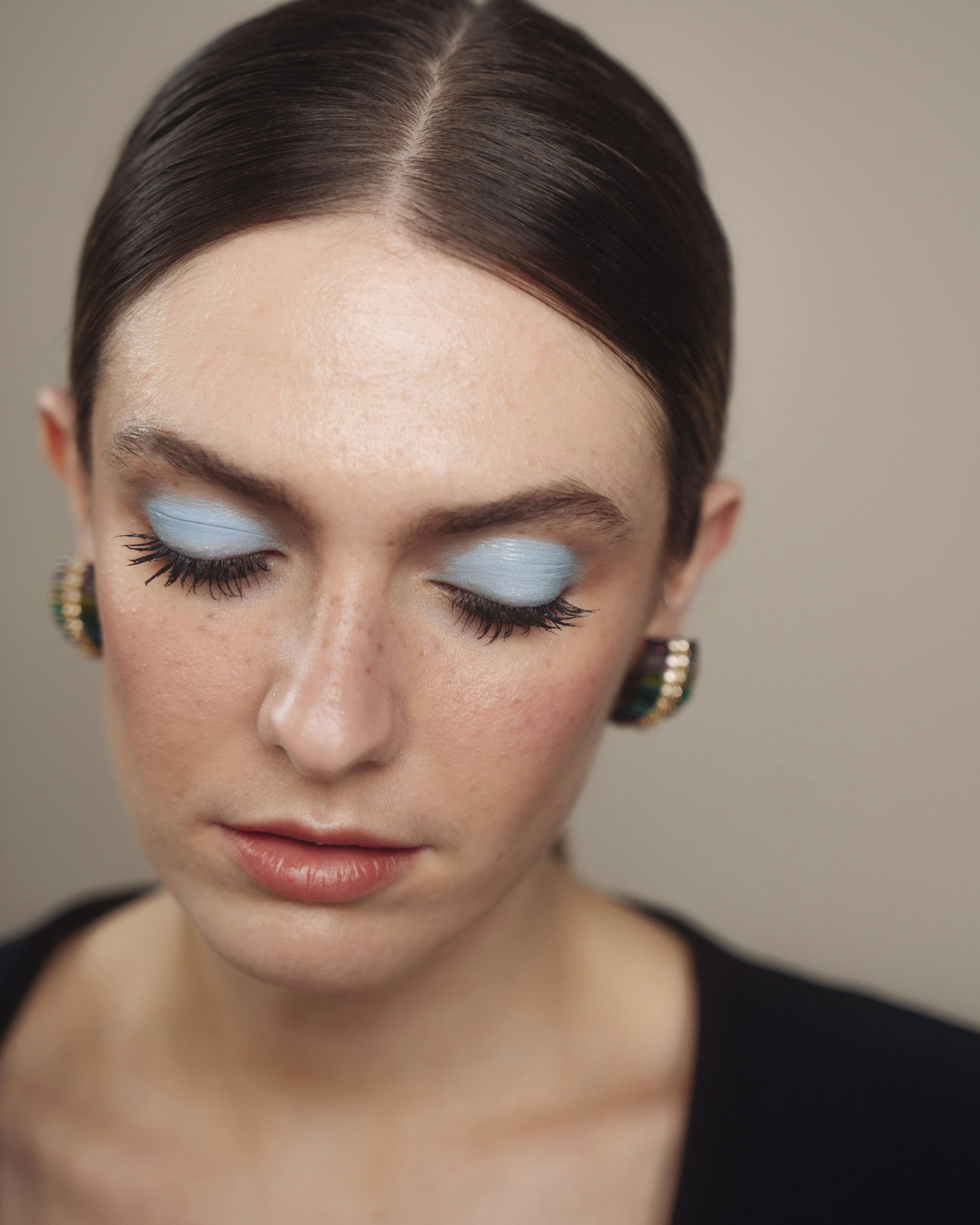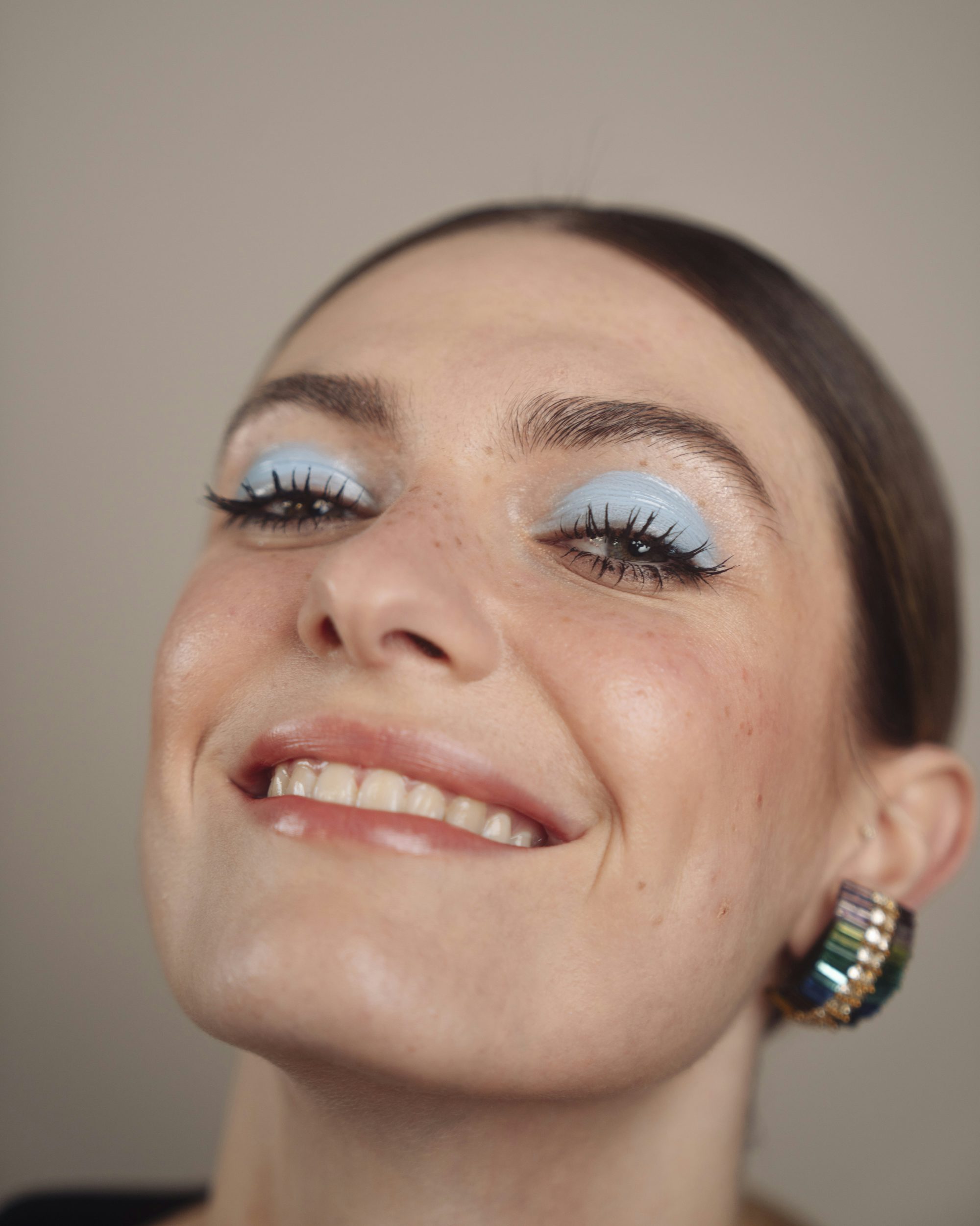 Ich liebe es, in andere Rollen und Jahrzehnte zu schlüpfen und dabei reise ich besonders gerne in die Sixties und Seventies. Blauer Lidschatten ist für mich, ganz anders als blauer Eyeliner auf der unteren Wasserlinie, ein Must-have in meinem persönlichen Make-up-Repertoire. Für essence habe ich meinen Lieblingslook aber nochmal neu interpretiert: nämlich mit glossy Eyelids. Denn ja, die nicht klebende Textur des extreme shine volume lipgloss macht es auch zum ultimativen Multi-use Produkt für Augen und Wangen. Wichtig: Wasserfeste Mascara verwenden, damit mit dem glossy Eyeshadow nichts verwischen kann!