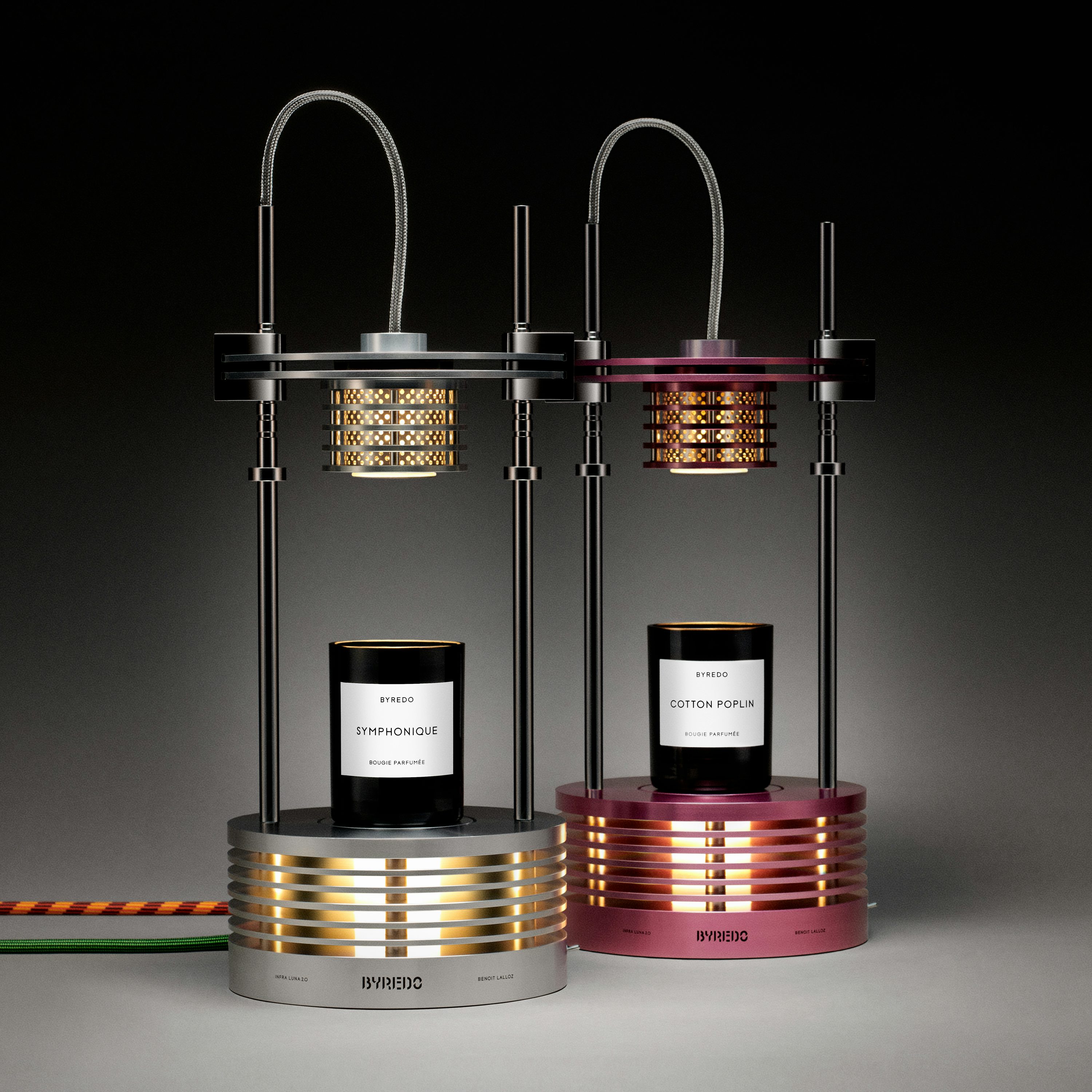 Die Lampe transformiert das Konzept klassischer Duftverbreitung: Ein Halogenlicht erwärmt – ohne Berührung – das Wachs der ikonischen Byredo-Kerzen, verflüssigt es sanft und verströmt den Duft in einem leuchtenden, unsichtbaren Halo. Eine funktionale Skulptur, die Räume nicht nur mit Licht, sondern auch mit Stimmung erfüllt.