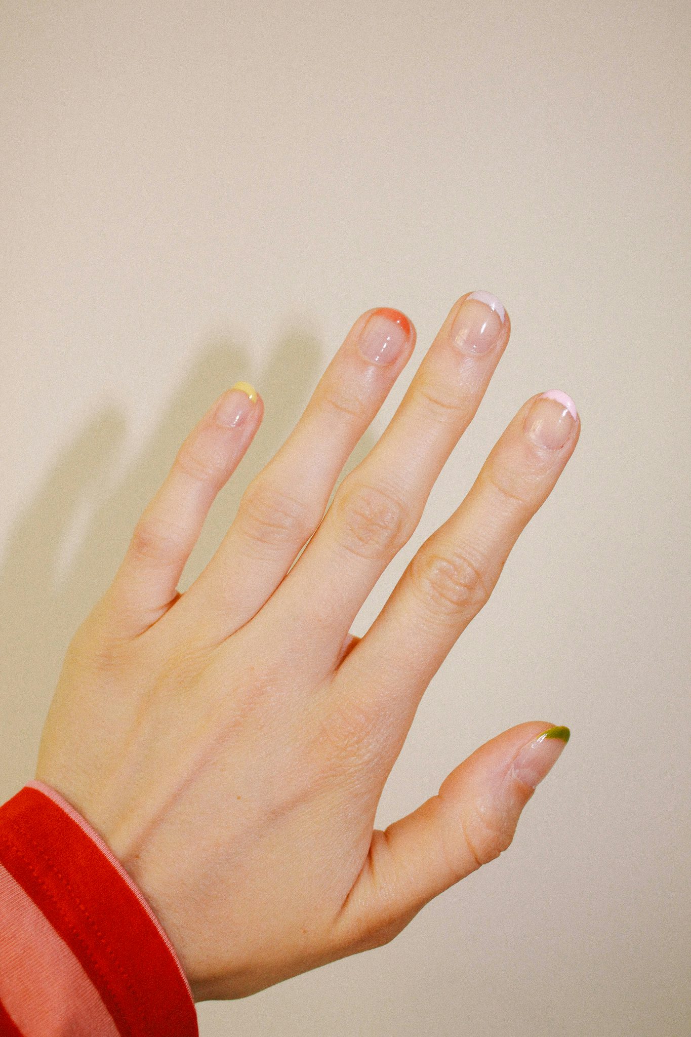 Wer kennt noch die eckigen French Tips aus den Nuller-Jahren? Die 2022-Interpretation ersetzt die eckig gefeilten Nägel mit einer Mandelform und hüllt die Spitzen in alle Farben des Regenbogens. Gerne greife ich da zu verschiedenen Pastelltönen. Eine Möglichkeit, etwas Fun und Farbe auf eine dezente Art und Weise in den Alltag zu bringen.