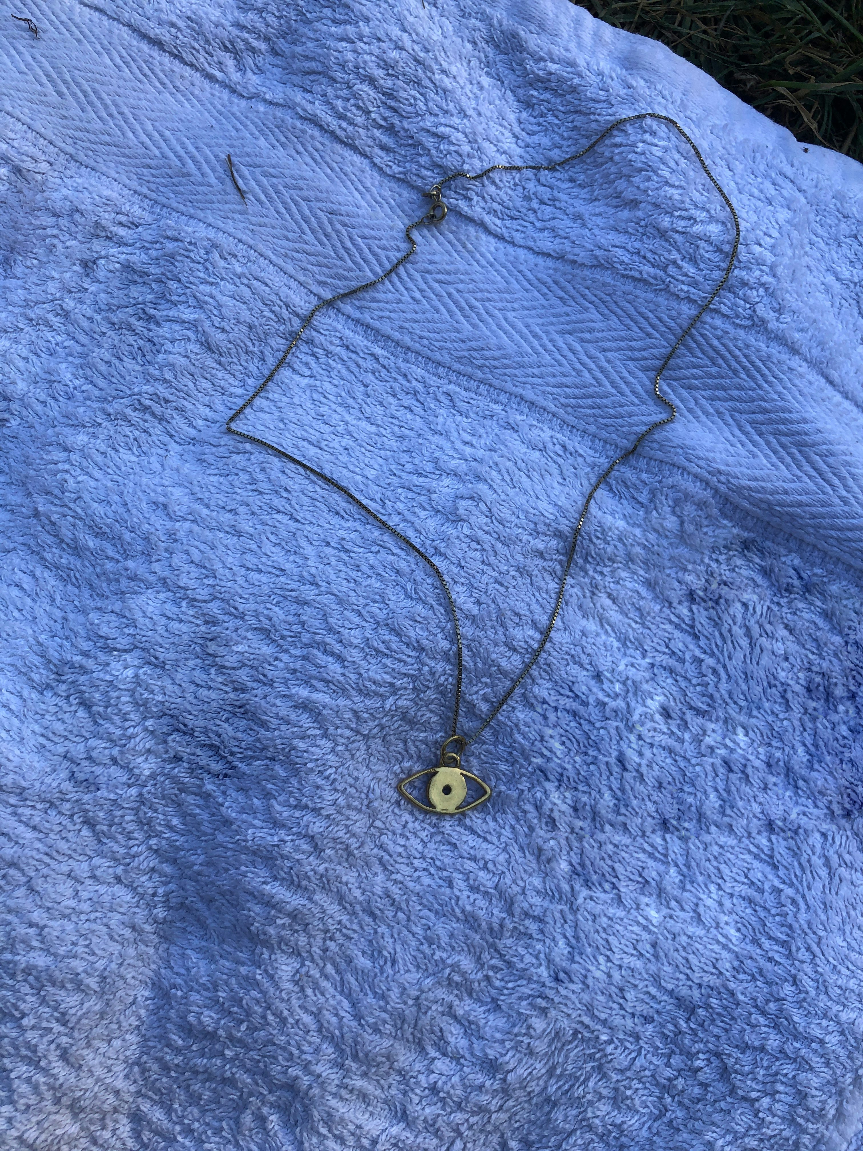 Und nun zur Kette! Die habe ich als den schönsten Ersatz erstanden, den man sich wünschen kann. Denn eigentlich wollte ich bei Nandi ein Batikkleid kaufen. Da die jedoch alle ausverkauft waren, stöberte ich durch den Schmuck und verliebte mich direkt in diesen vergoldeten Augen-Aufhänger. Er begleitet und beschützt mich seitdem und tröstet mich über die Wartezeit hinweg, bis Nandi wieder das Batik-Game aufstockt!