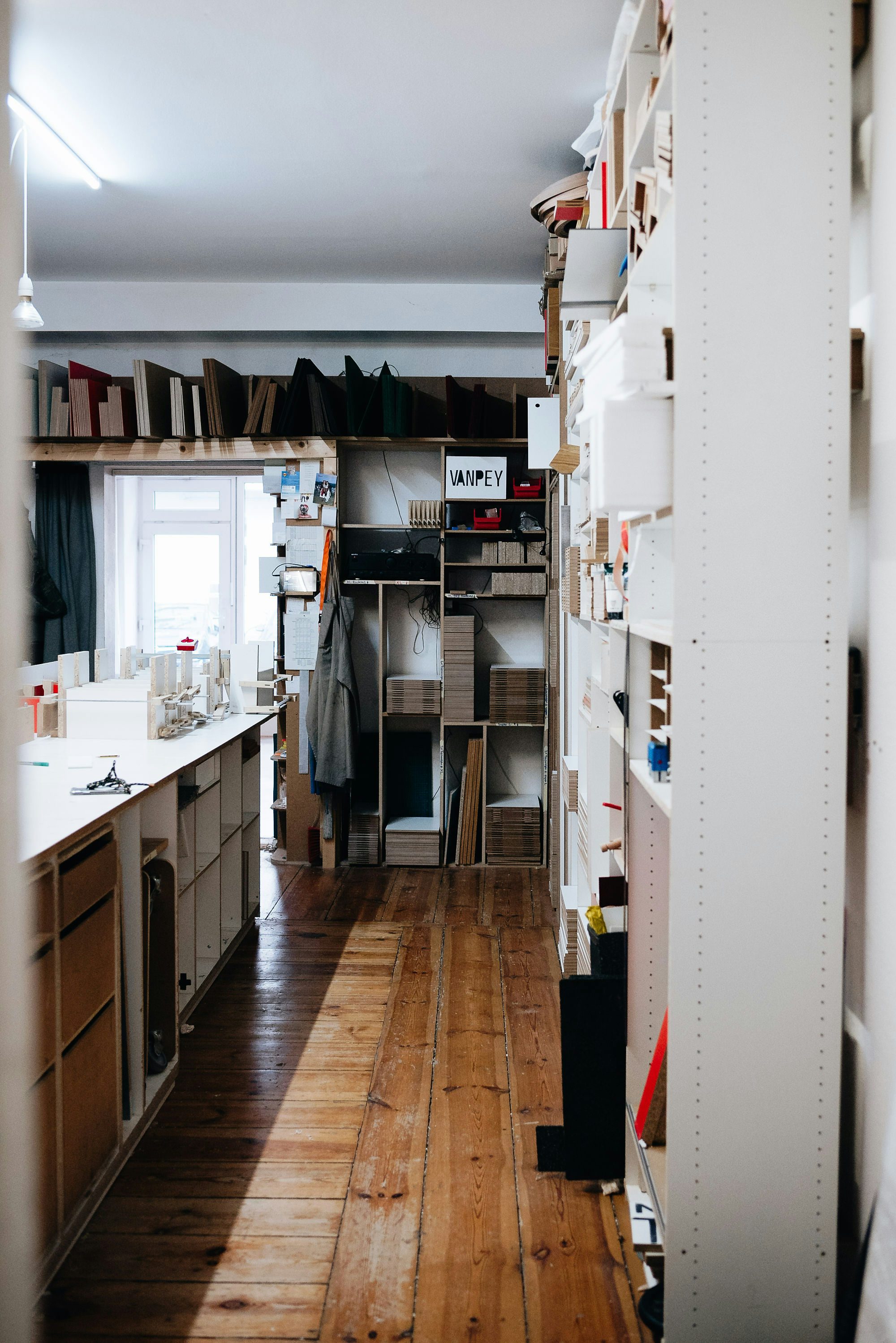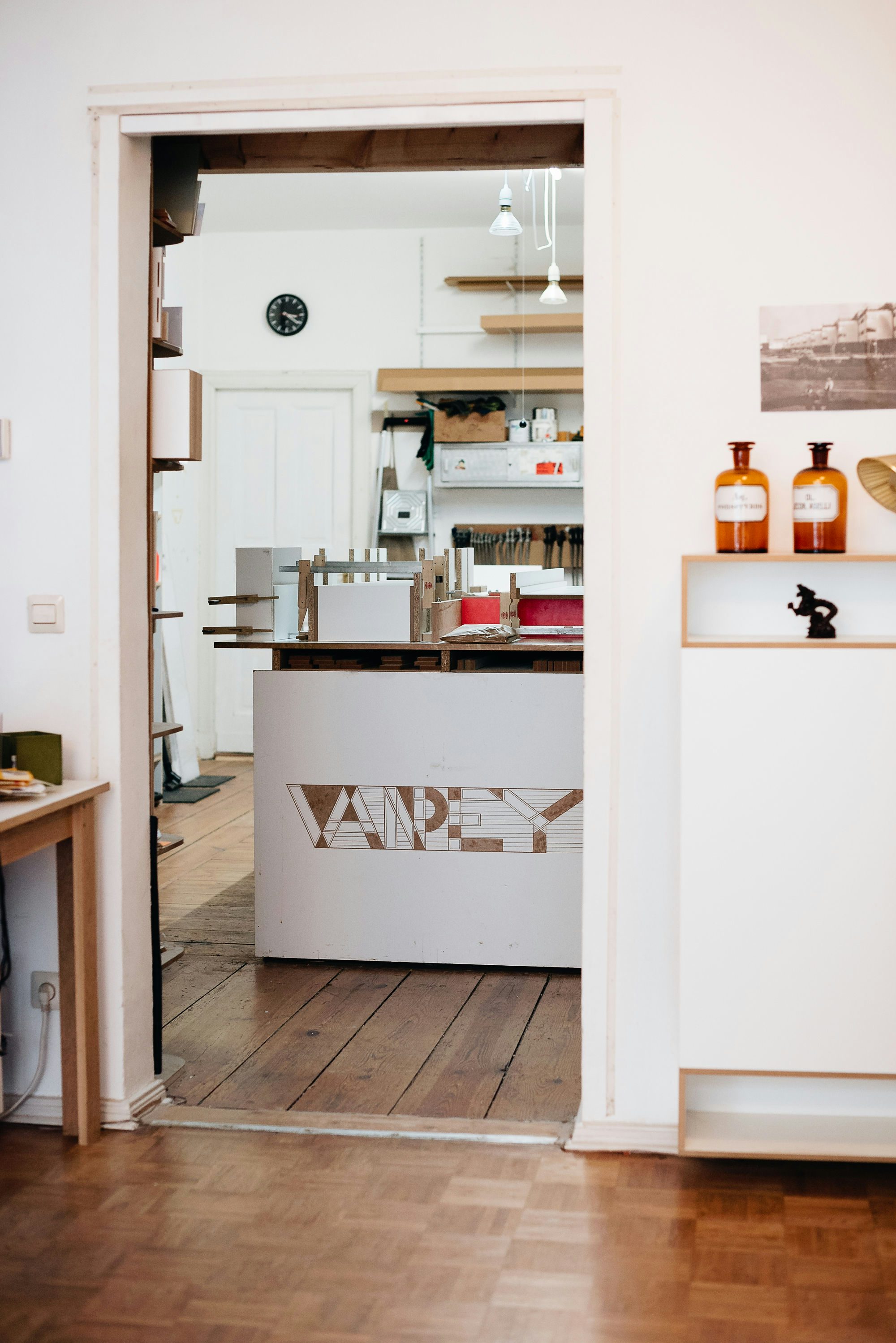 Wir treffen Ralf Schmitz an einem sonnigen Februartag im Prenzlauer Berg. Dort sitzt seine Firma Vanpey in einem dieser kleinen Altbau-Ateliers, die in Berlin mehr und mehr zur Rarität werden. Vorne ein kleines Ladengeschäft / Büro / Showräumchen. Der Blick durch die Tür lässt die Besucher dann direkt ins sprichwörtliche Herz der Firma schauen. Ein großer Arbeitstisch steht dort in der Mitte, die Wände sind eingenommen von perfekt angepassten Regalen, in denen sich die Teile für die Möbel von Vanpey stapeln. Alles schlicht, alles in Weiß.