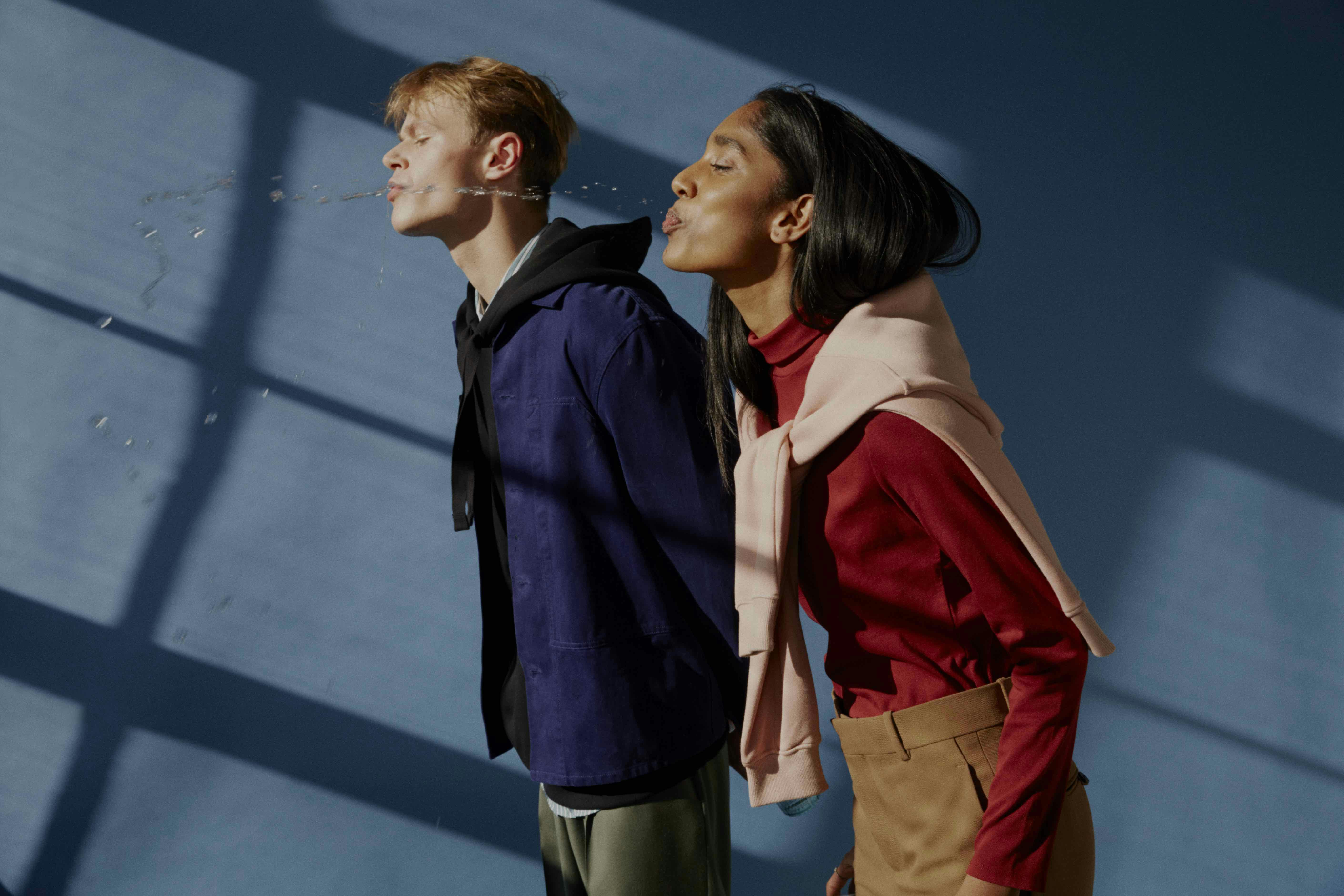 Wir sind Amira, Ali, und Hans und stecken hinter dem Water-First Modelabel Kind of Blau. Bei uns beginnt der Entwicklungsprozess bei der Auswahl besonders wassersparender Materialien, denn ein möglichst niedriger Wasserfußabdruck ist unser Ziel. Dafür entwickeln wir in Portugal eigene Stoffe, die auch andere Labels nutzen können, um Wasser einzusparen. Wir verwenden ausschließlich biologisch abbaubares Elastan und bleiben zu 100 Prozent in der EU – selbst die Baumwolle für unsere neuen Teile kommt aus Griechenland. Um die immense Wasserverschmutzung in den üblichen Produktionsländern wie Bangladesch nicht zu ignorieren, zahlen wir über unsere eigene NGO Drip by Drip Reparationen an lokale Partner, die das Geld in Wasseraufbereitungsprojekte für die Bevölkerung investieren. Gestartet sind wir, damals noch als Blue Ben, im Frühjahr. Mittlerweile haben wir ein kleines Büro mit Showroom in unserer Heimatstadt Berlin und mit Hans das dritte Teammitglied in unserem kleinen Familienunternehmen.