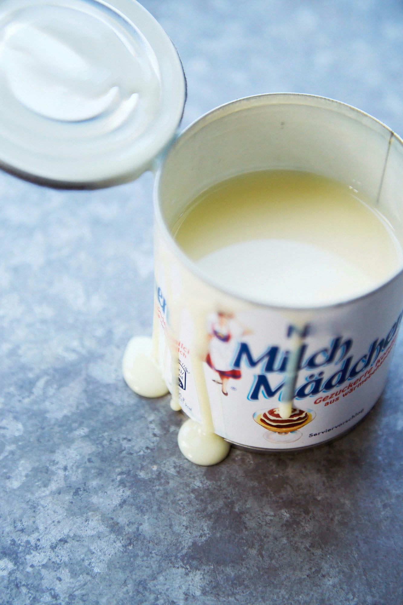 Das Grundrezept besteht aus drei einfachen Zutaten, deren Mengenverhältnis nicht verändert werden darf. Der Zucker in der Kondensmilch in Kombi mit dem hohen Fettgehalt der Sahne ist wichtig, damit das Eis richtig cremig wird, auch wenn man es ohne Eismaschine zubereitet. Der Zucker verhindert nämlich die Bildung von Eiskristallen, indem er sich an das Wasser bindet. Kauft also unbedingt die gezuckerte Kondensmilch.