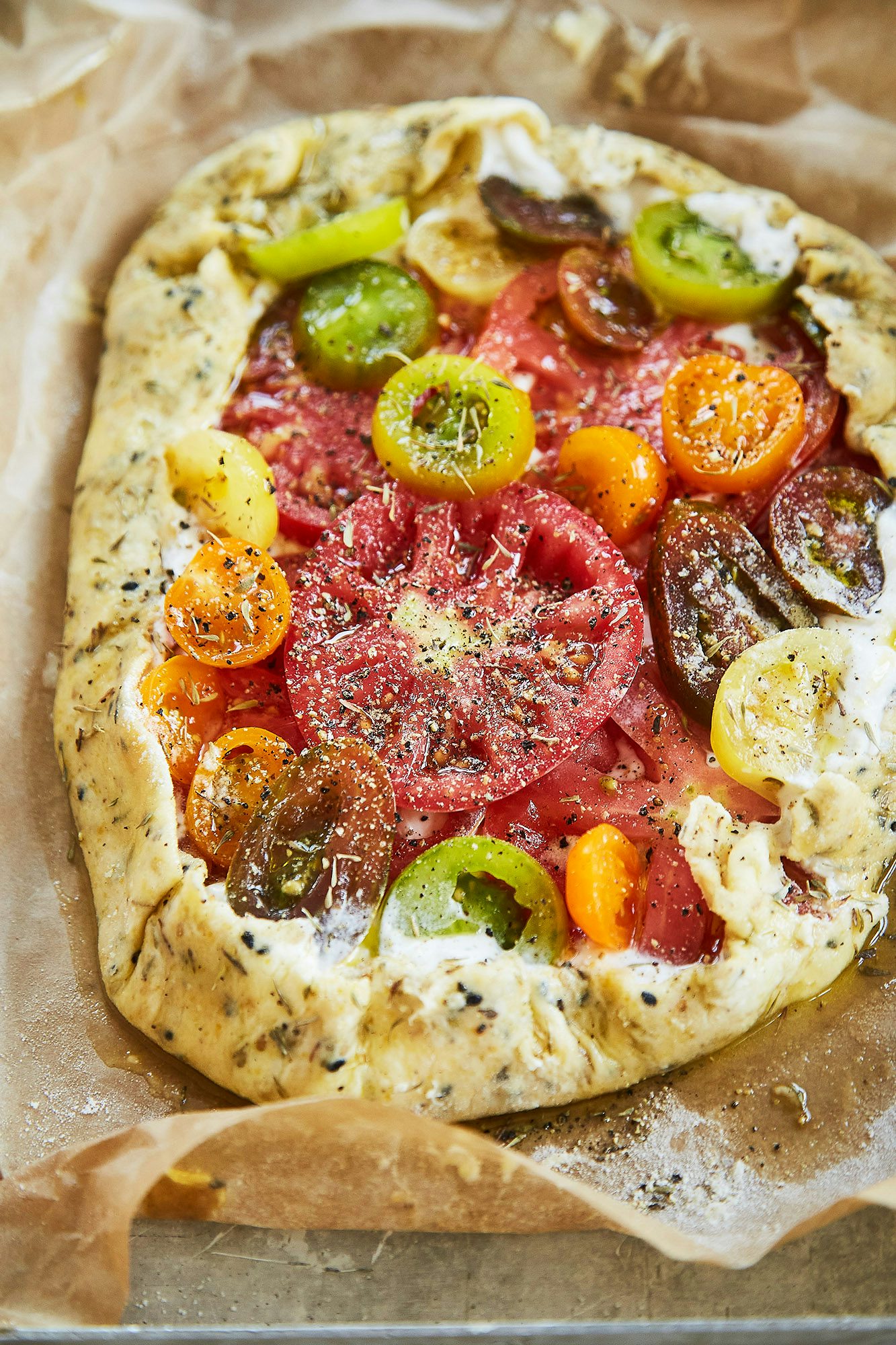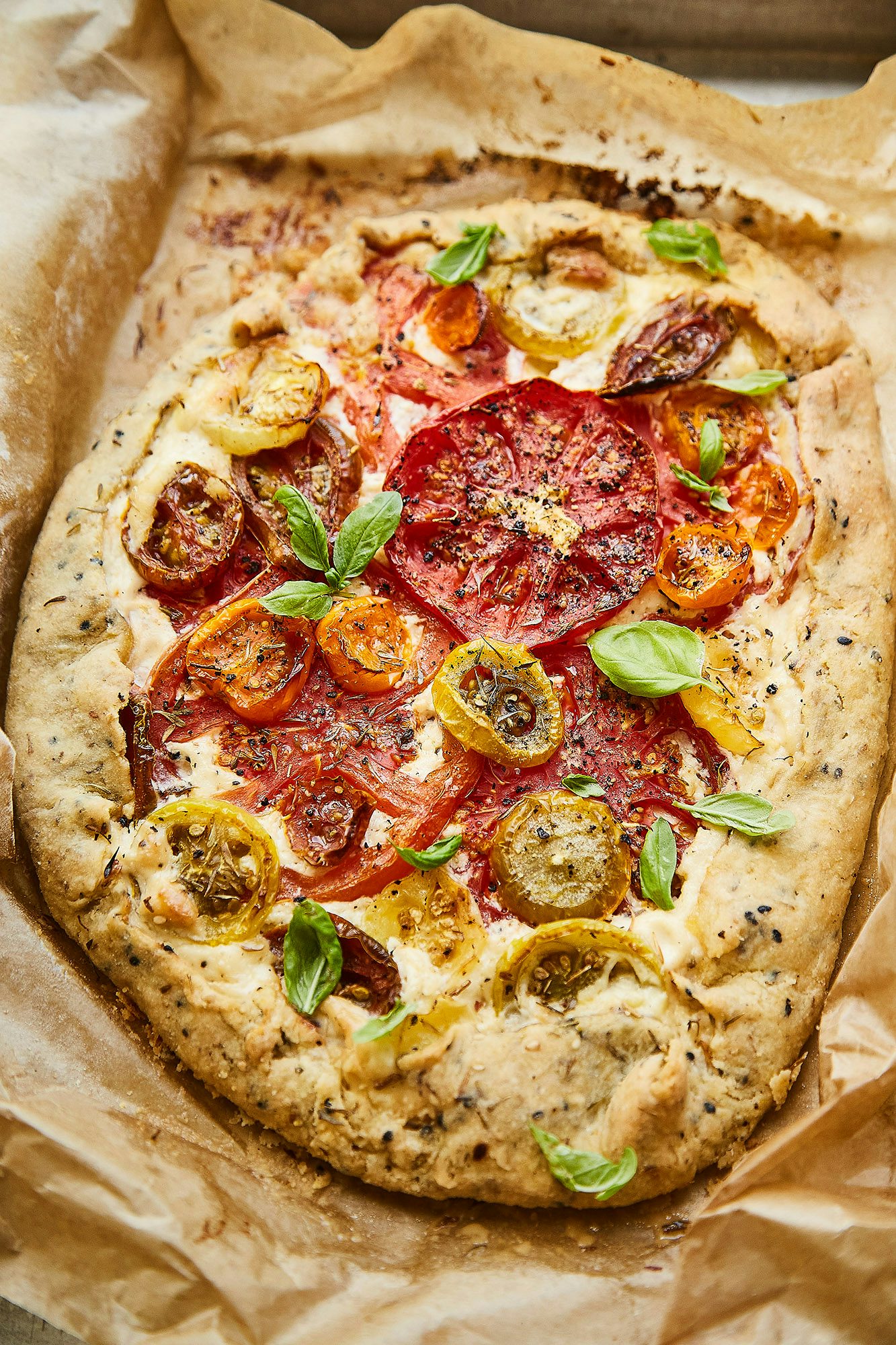 Damit der Teig schön kross und „flaky“ wird, darf er nicht so lange geknetet werden und die Margarine (oder Butter) muss kalt aus dem Kühlschrank kommen. Was Tomaten angeht, ist alles erlaubt: klein, groß, dick, lang. Einziger Tipp: Spart nicht an den Tomaten, sie können und sollen sich großzügig überlappen, denn sie werden beim Backen schrumpfen.