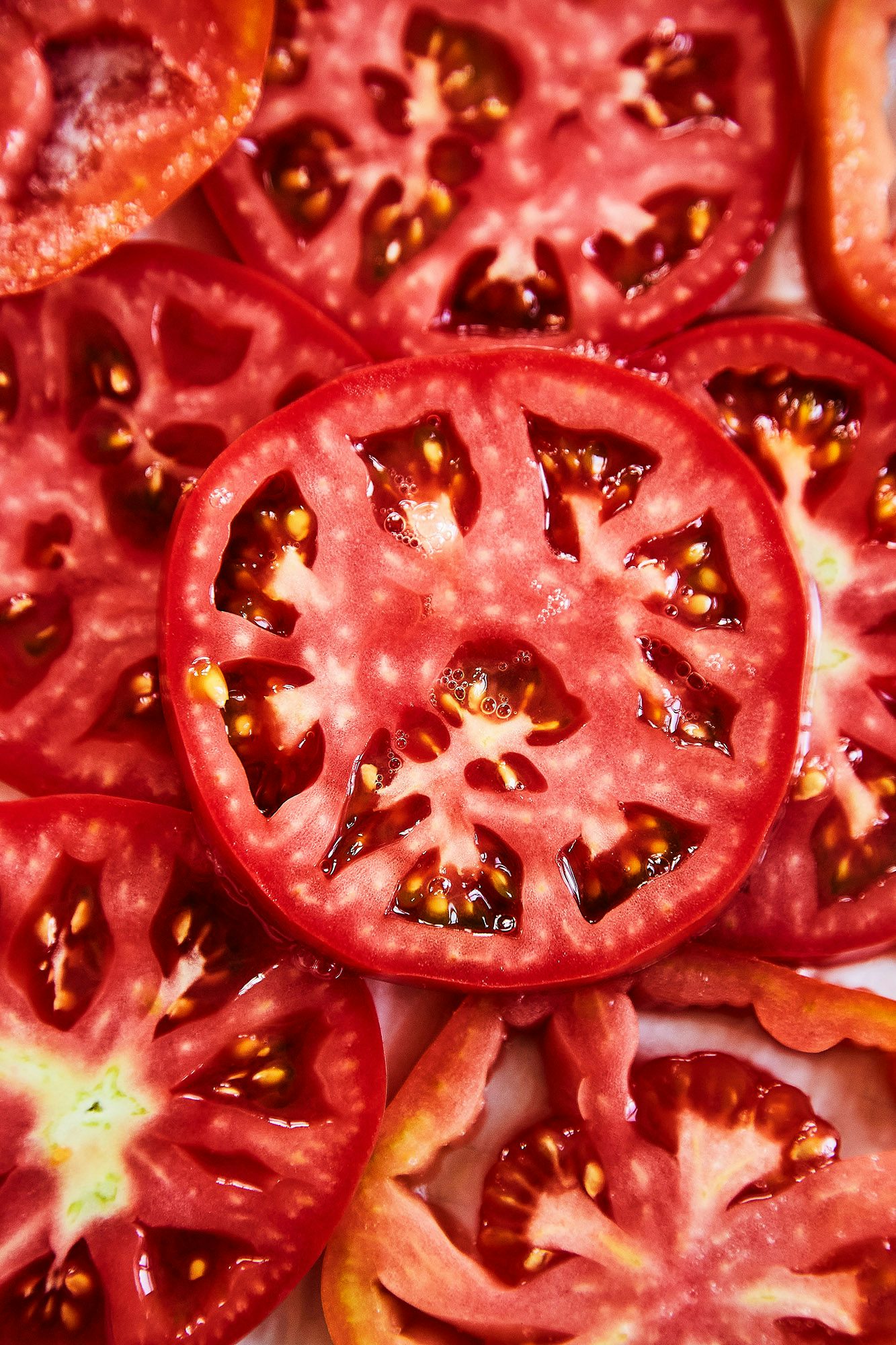 - Tomaten waschen und in dünne Scheiben schneiden. Reichlich salzen und ca. 20 Minuten schwitzen lassen. Die Flüssigkeit, die entsteht, entsorgen und kurz mit kaltem Wasser abbrausen. In einem Küchentuch vorsichtig trocken tupfen.