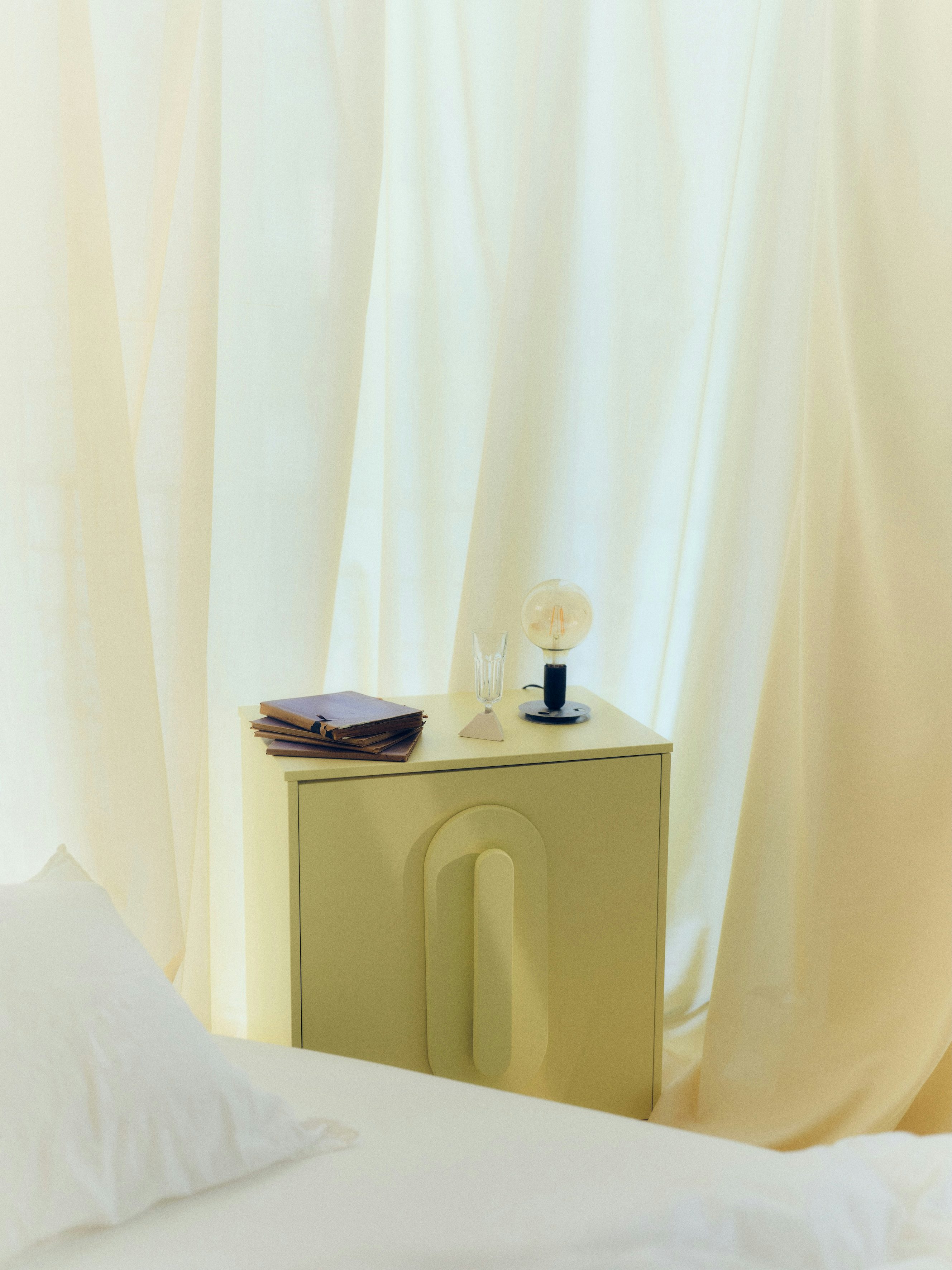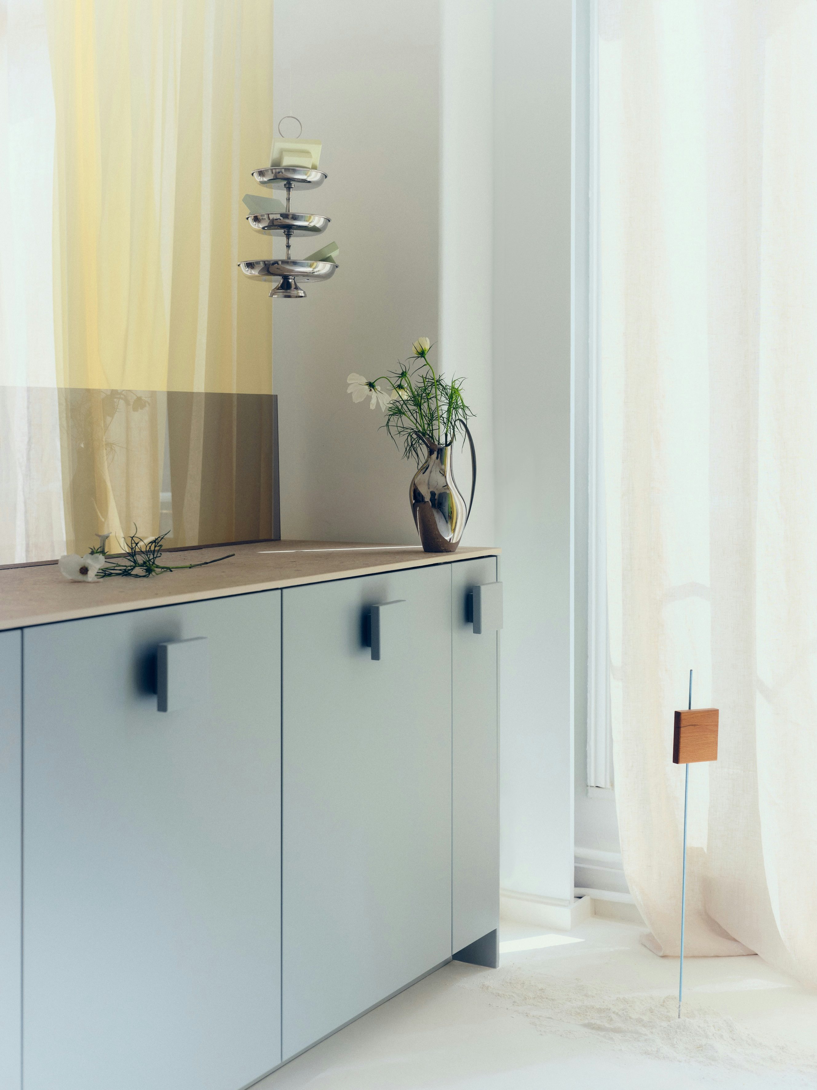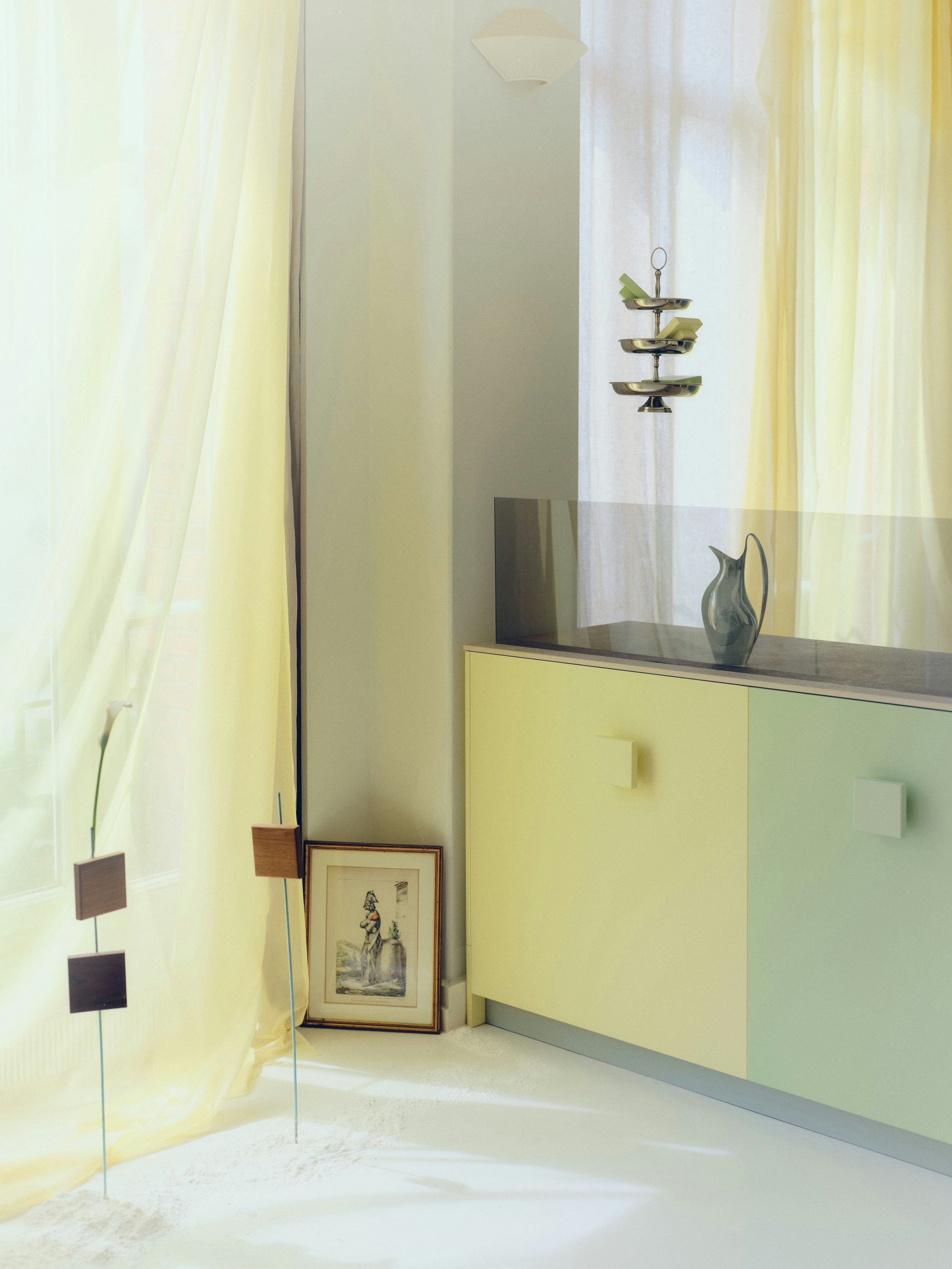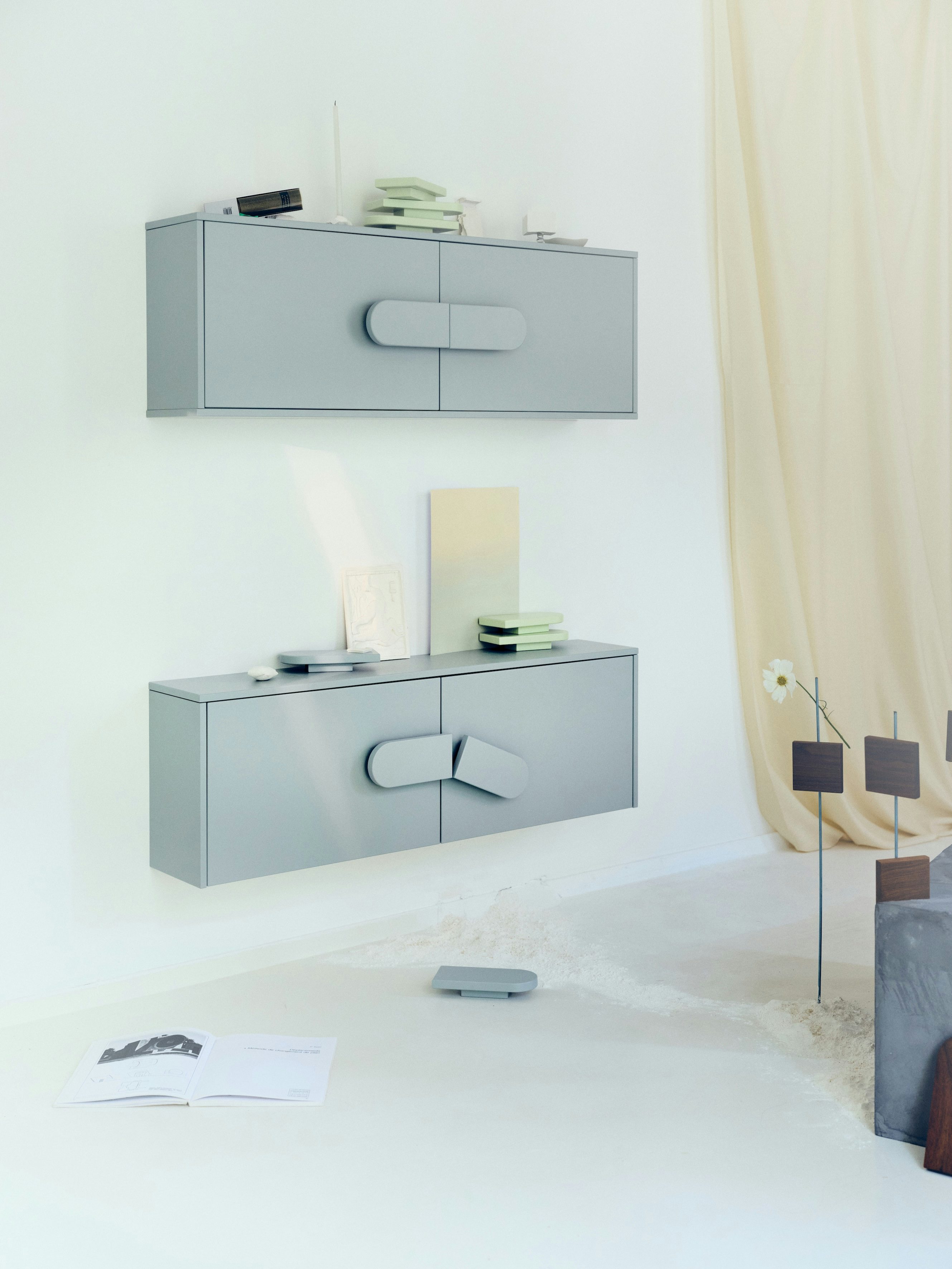 Gefertigt aus massivem Eichen- und Nussbaumholz und in zarten Farbtönen lackiert, vereinen die Griffe Handwerk, Langlebigkeit und poetische Farbnuancen. Verblasste Fassaden, sanftes Grün der Natur oder raues Grau von Zement dienen als Inspiration und erzeugen ein Spiel aus Erinnerung und Materialität. Für die Architektin sind Griffe keine bloßen Funktionselemente, sondern architektonische Aussagen: