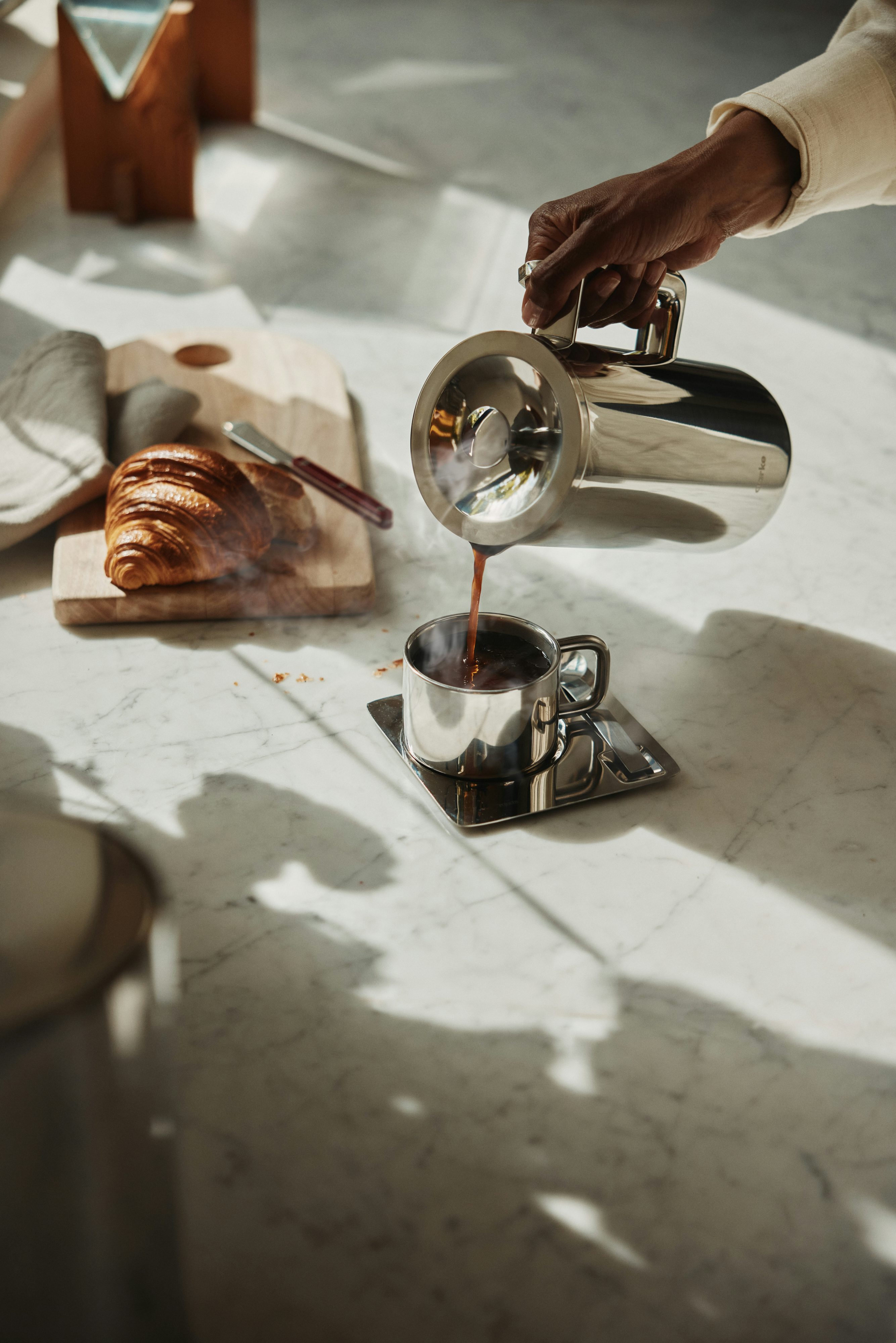 Jetzt erweitert das schwedische Label sein Coffee-Universum um eine French Press, die Funktion und Form in Perfektion verbindet. Gefertigt aus poliertem Edelstahl wirkt sie mit ihrer skulpturalen Silhouette wie ein ästhetisches Objekt. Doppelwandig Vakuum-isoliert hält sie den Kaffee bis zu drei Stunden heiß und reicht mit einem Fassungsvermögen von einem Liter für bis zu acht Tassen – ideal für ein Kaffeekränzchen unter Freunden.