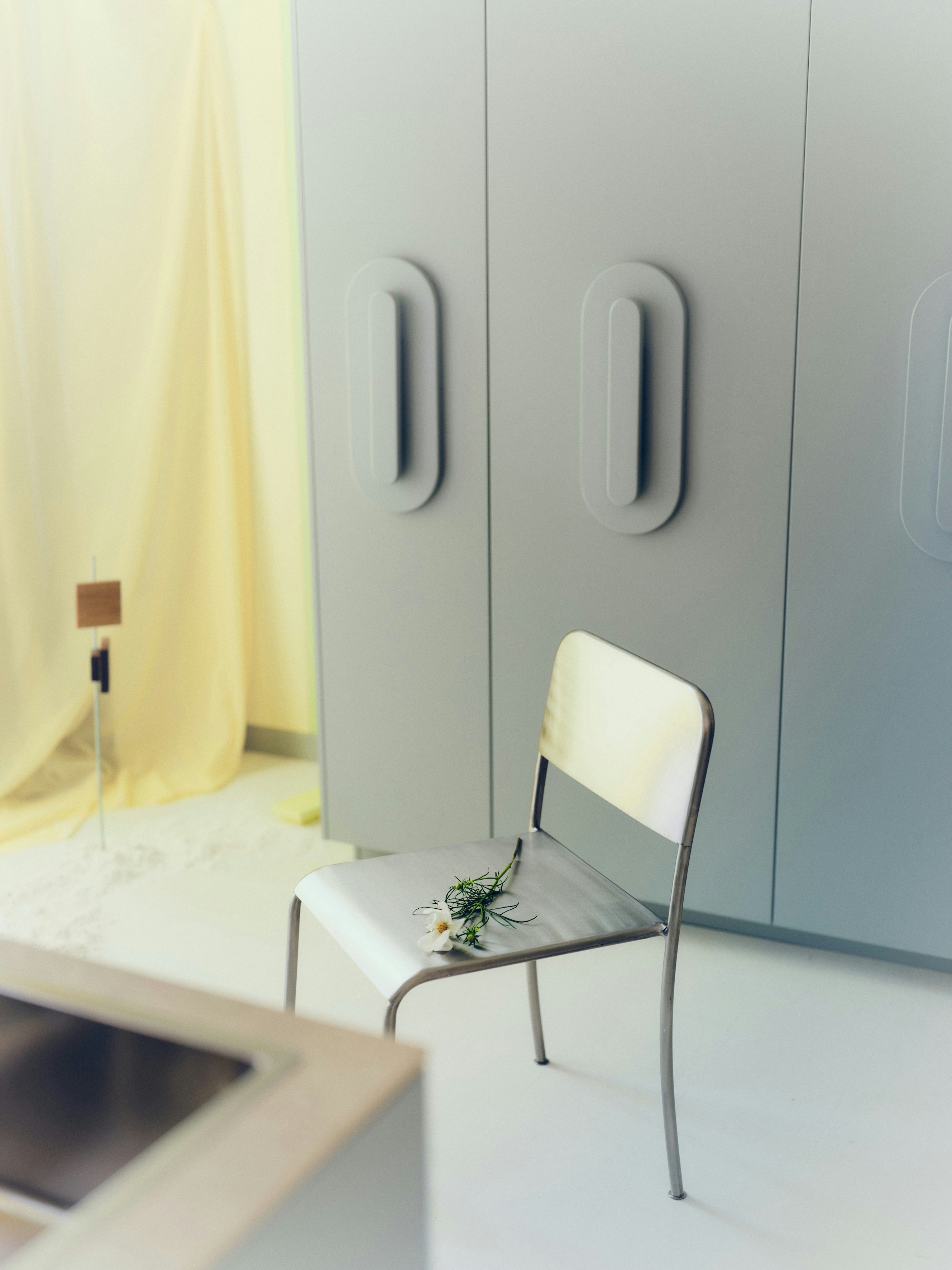 Die Stuhl-Komposition verfügt über eine gebogene Rückenlehne mit einem Rahmen aus geformtem Schichtholz, die von kantigen Beinen getragen werden. Millimetergenau gefügt, ist er eine stille Demonstration von Präzision und Handwerkskunst. Auch der runde Tisch spielt mit Balance und Proportionen: Seine Platte scheint über dem robusten Kreuzgestell zu schweben.
