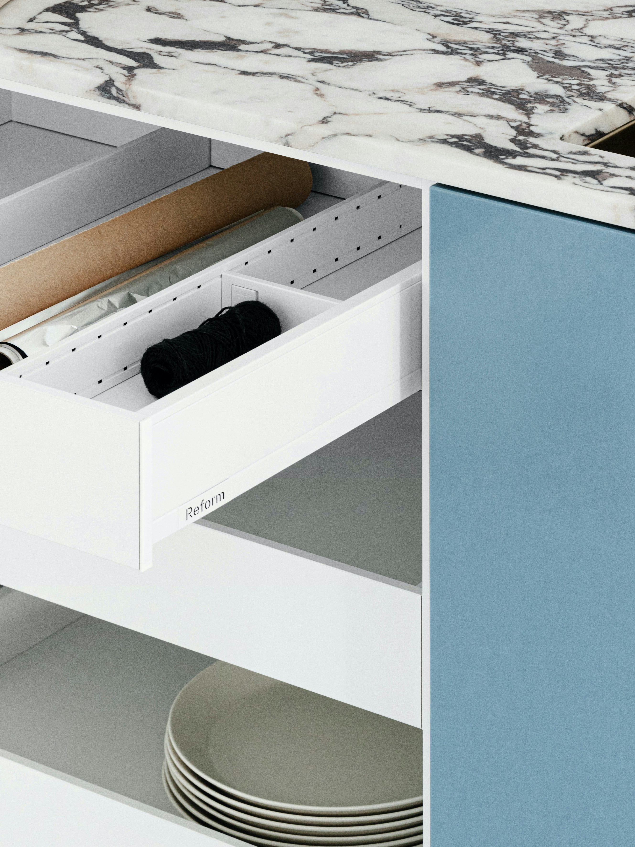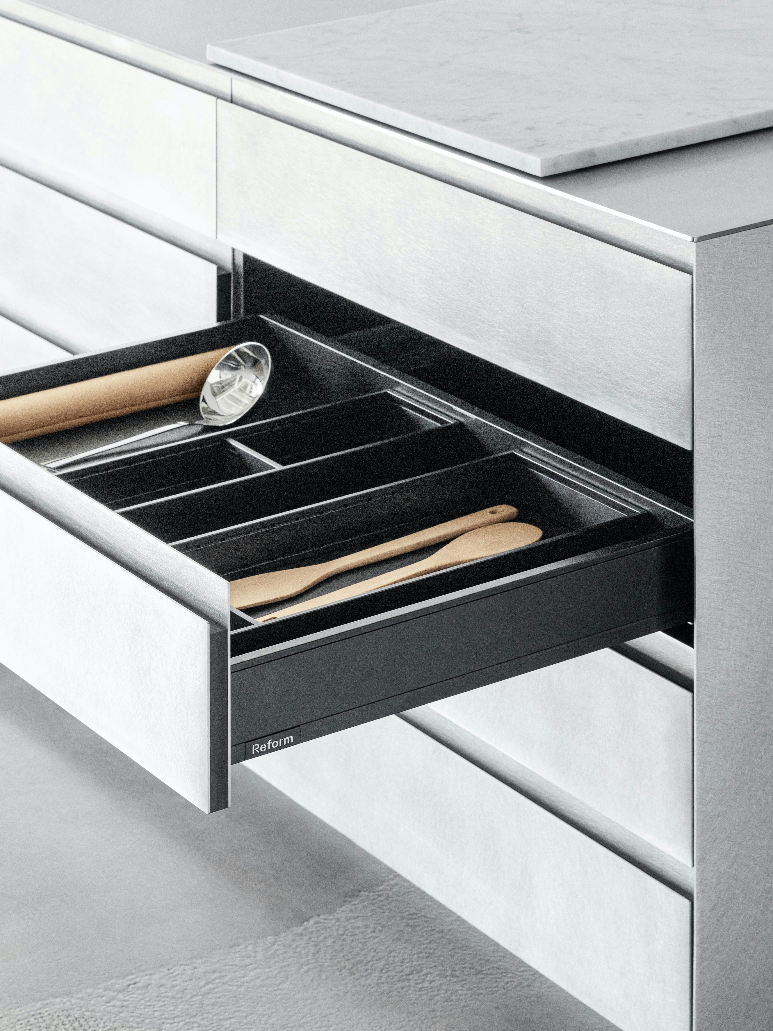 Und so starteten die beiden mit dem simplen, aber genialen Ansatz, Ikea-Küchen mit schönen Fronten und Arbeitsplatten zu upgraden. (Unseren Artikel mit den besten Ikea Hacks findet ihr hier). Die funktionellen Innenleben des schwedischen Möbelunternehmens blieben, die Designs kamen von Reform, die dafür mit vielen bekannten Architekt*innen und Designstudios zusammenarbeiteten.