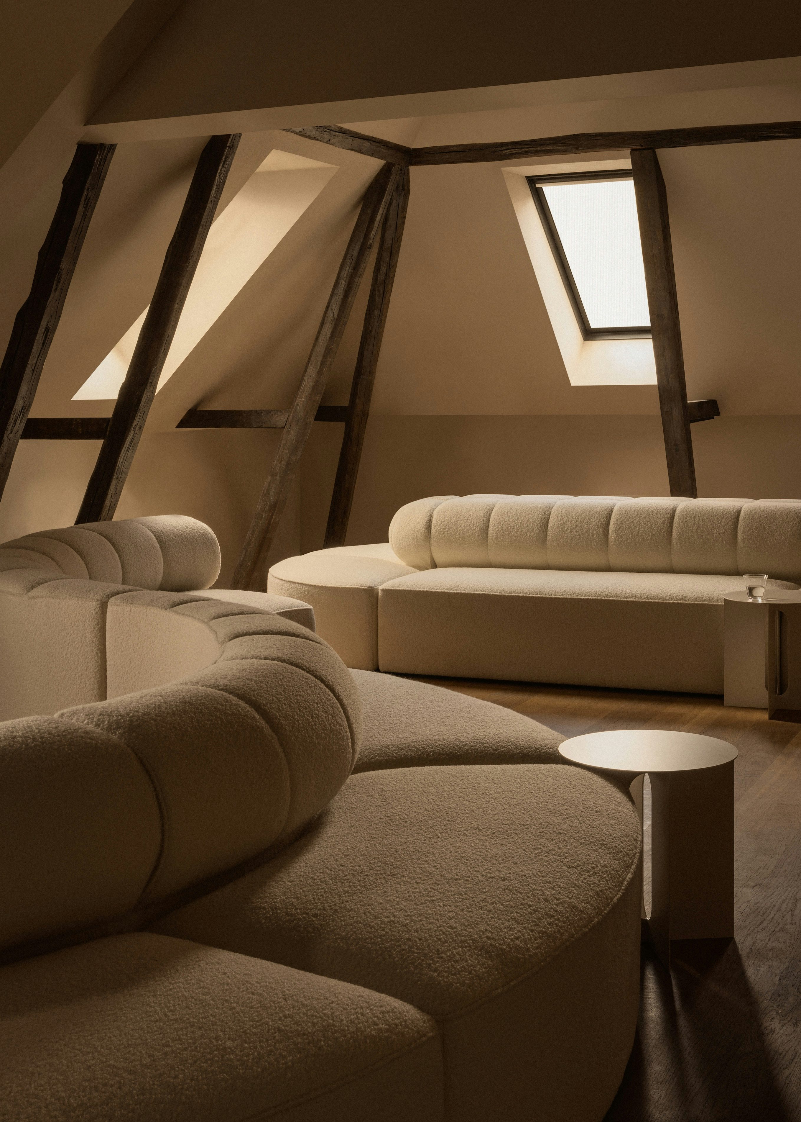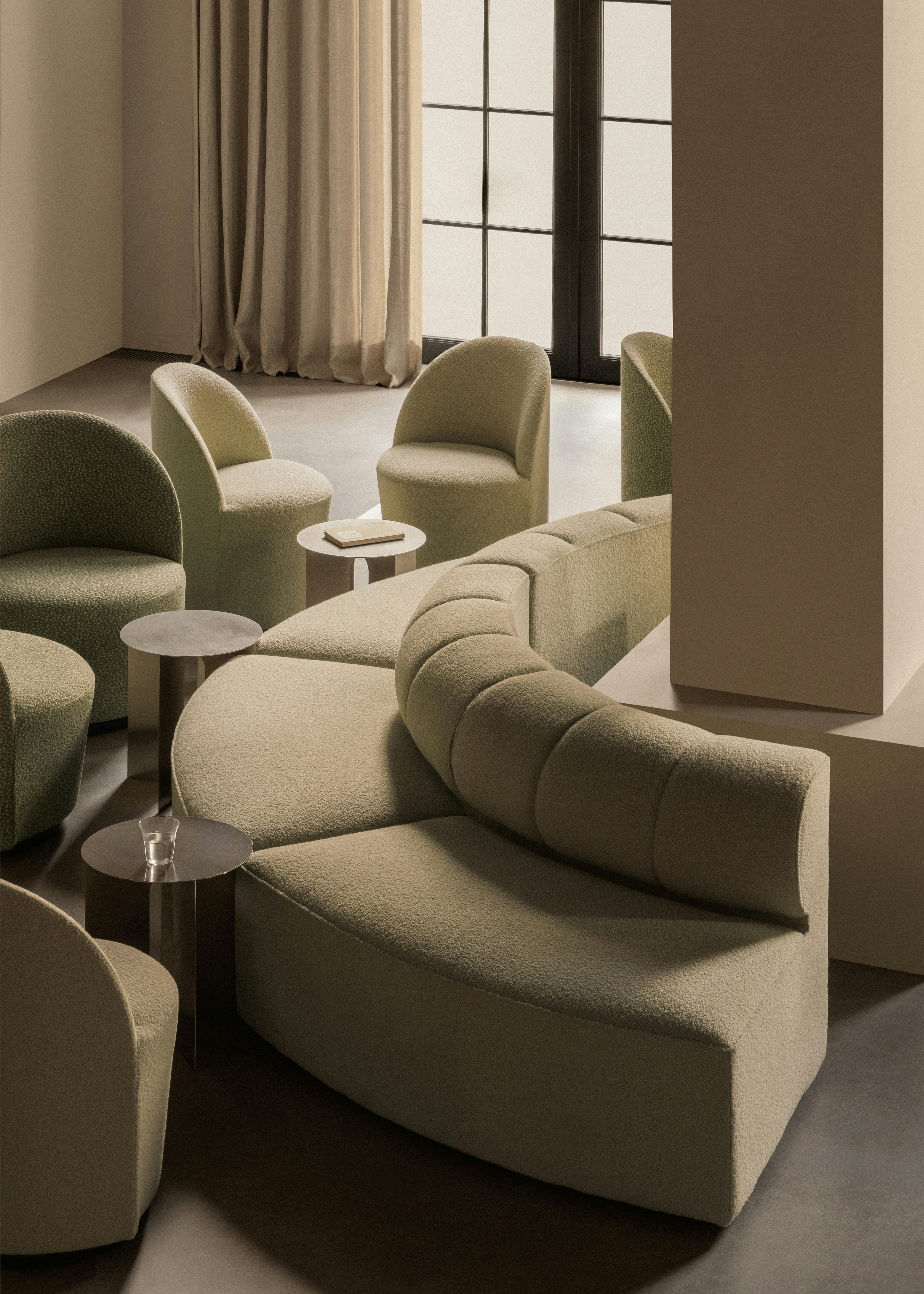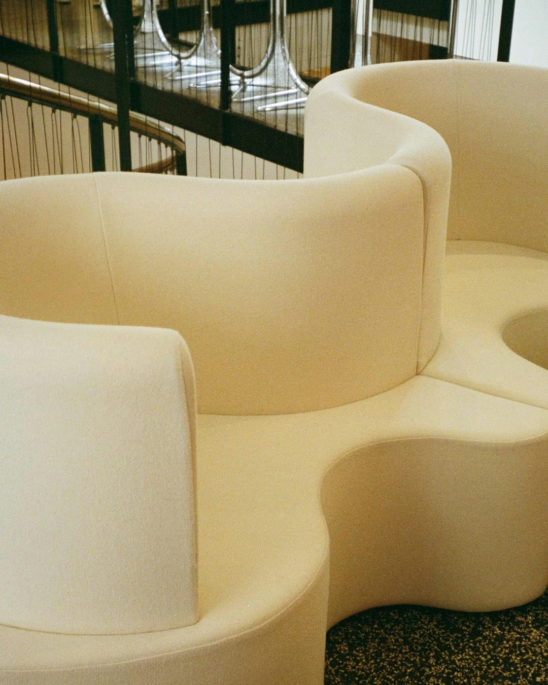 Weiter geht es mit soften Kurven und formschönen Möbeln bei Audo. Zusammen mit Note Design Studio haben sie das Audo House neu gestaltet – und sind dabei erstaunlich hell und „bunt“ geworden. Dabei führen sie zarte buttergelbe Töne, und warmes orangenes Samt ein. Neu ist dabei eben auch ein Modulsofa von Norm Architects, das dank seiner Vielseitigkeit immer wieder neu kombiniert werden kann. Nur eines braucht man dafür: Platz!