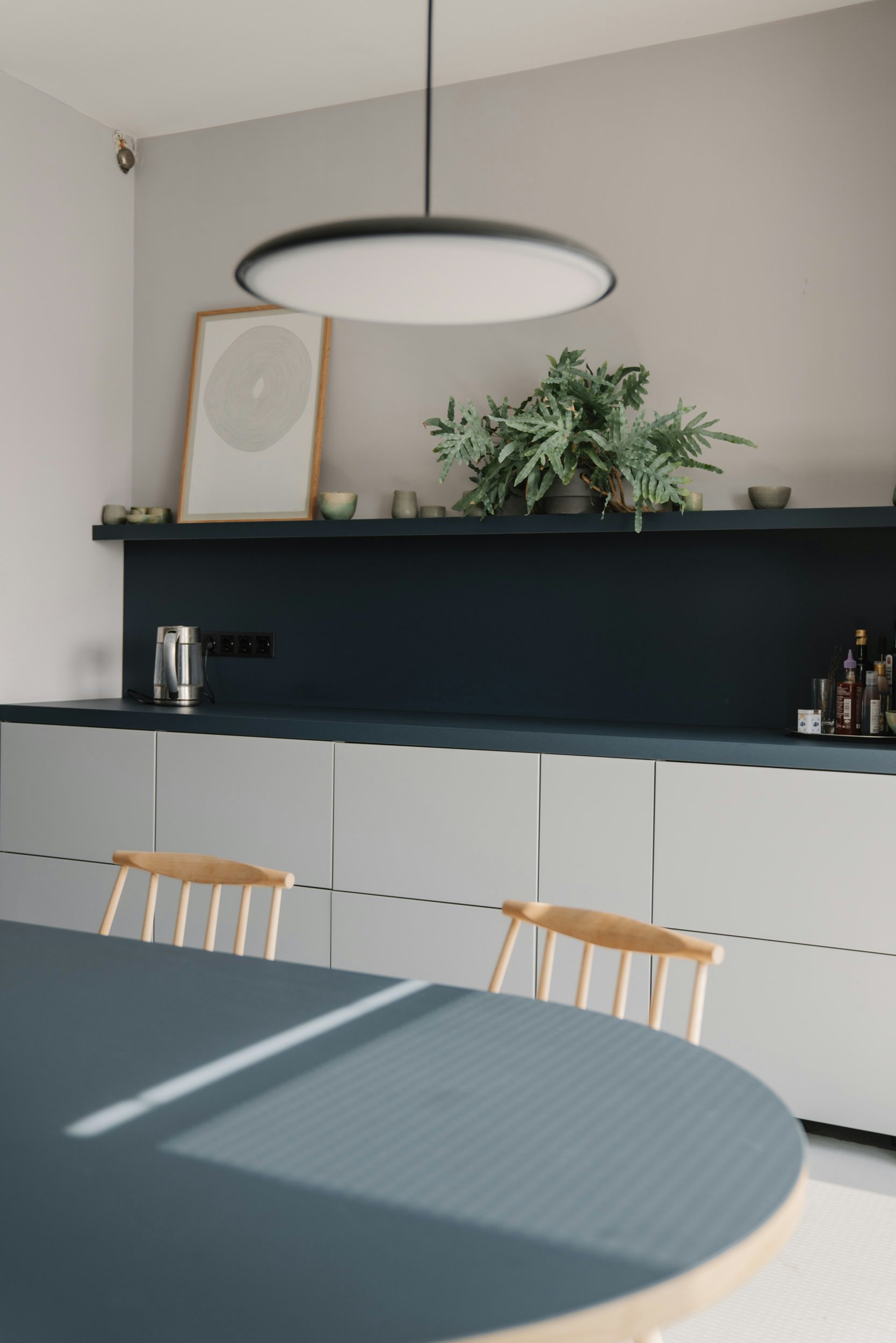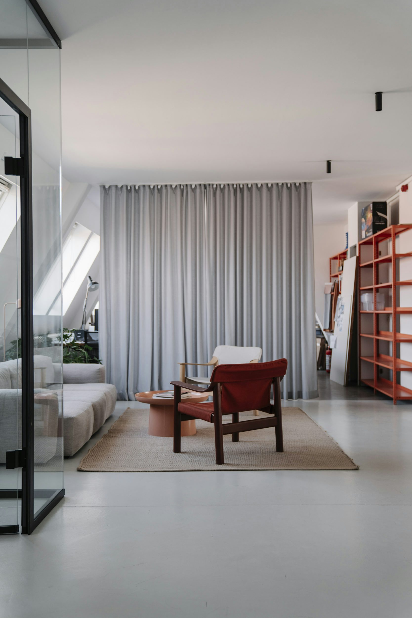 Ihr Atelier, das sie auch als Co-Working-Space vermieten, liegt im Dach eines alten Fabrikgeländes in einer Nebenstraße der Potsdamer Straße. Die beiden müssen fit sein, denn nach den vier Treppen (ich habe auch ein sehr schweres Made.com-Gastgeschenk getragen, aber es hat sich gelohnt, es hat PERFEKT in die Küche von LXSY gepasst), war ich ganz schön aus der Puste. Und beim Anblick ihres Office-Spaces ein klitzekleines bisschen neidisch. Denn im loftartigen Büro herrscht die perfekte Mischung aus konzentrierter Arbeitsatmosphäre an den Schreibtischen und kreativen Vibes in der blauen Küche und dem rot-rosa Lounge-Bereich mit Couch. Die beiden setzen Farben so gezielt und gekonnt ein, dass sie einen einzigen Raum ohne große raumteilende Elemente (die Ausnahme bilden zwei Vorhänge) perfekt gliedern. So würde ich auch gerne arbeiten ... Kim, Margit, steht das Angebot mit dem freien Schreibtisch noch?!