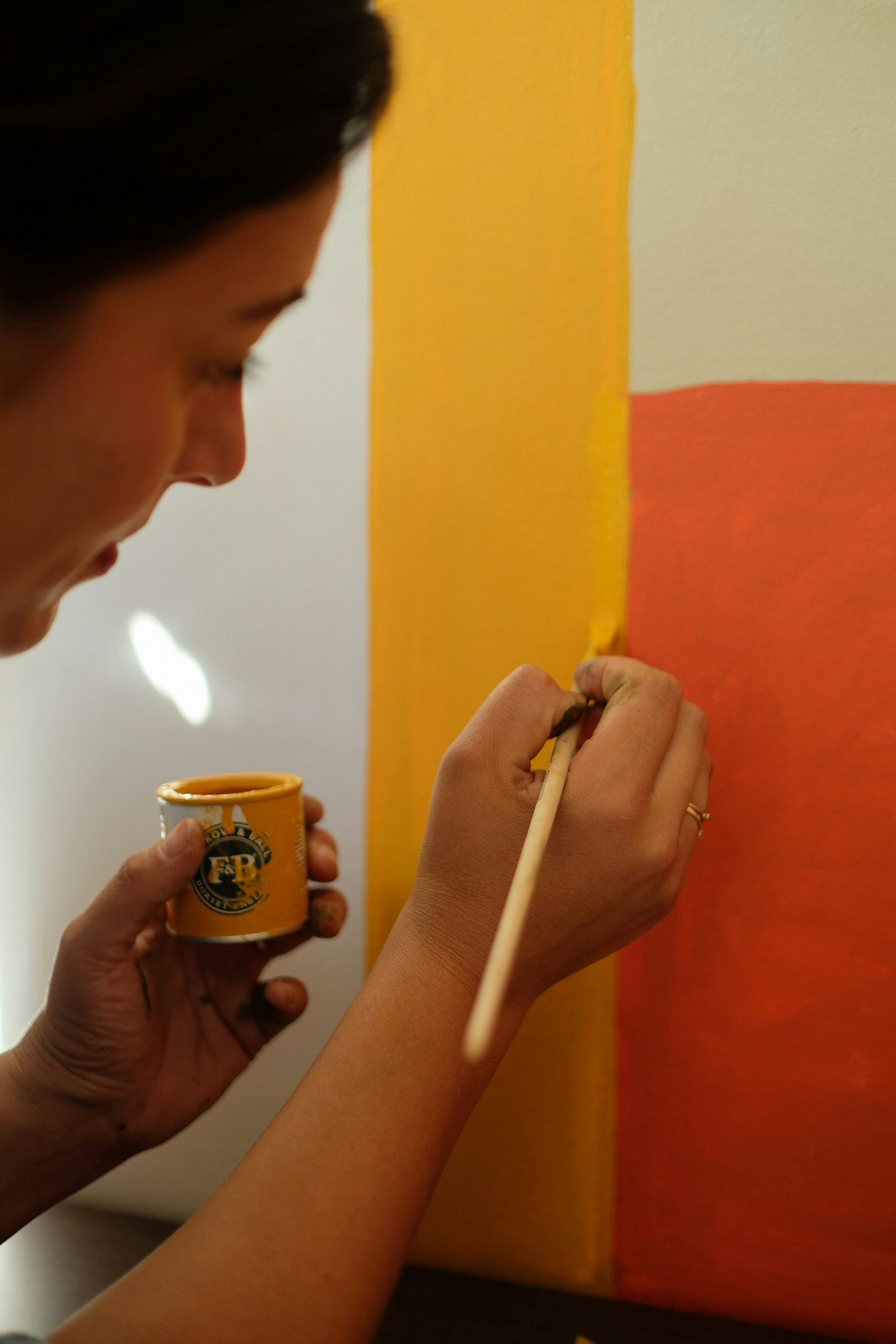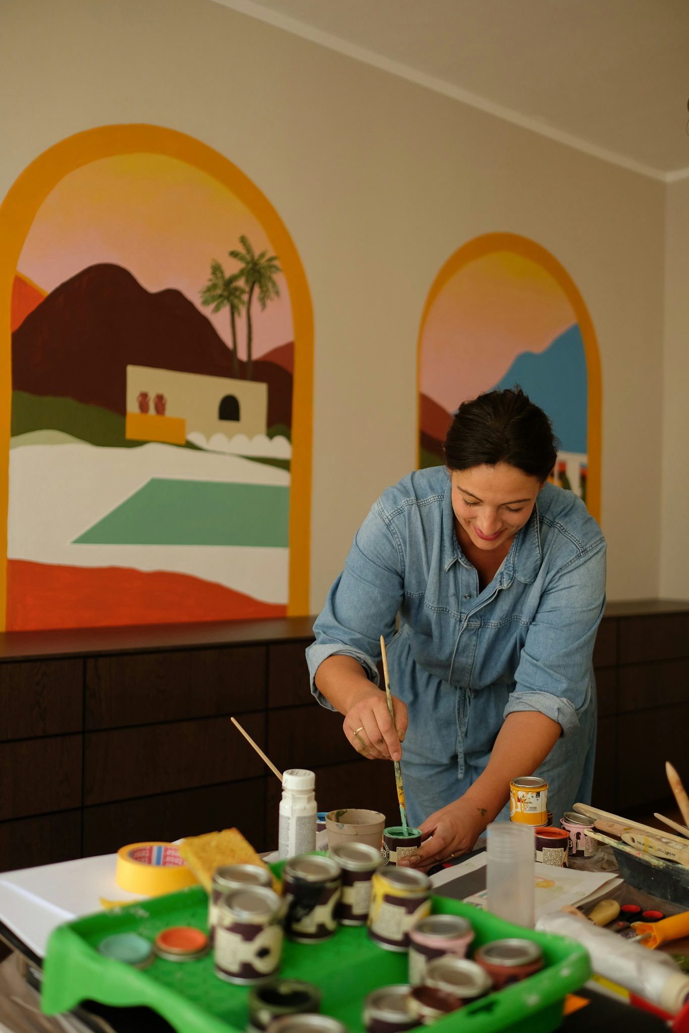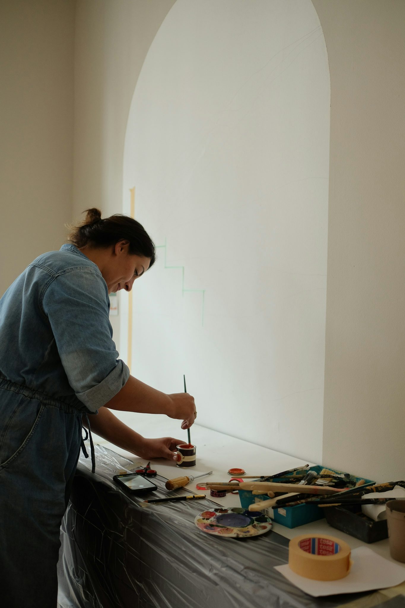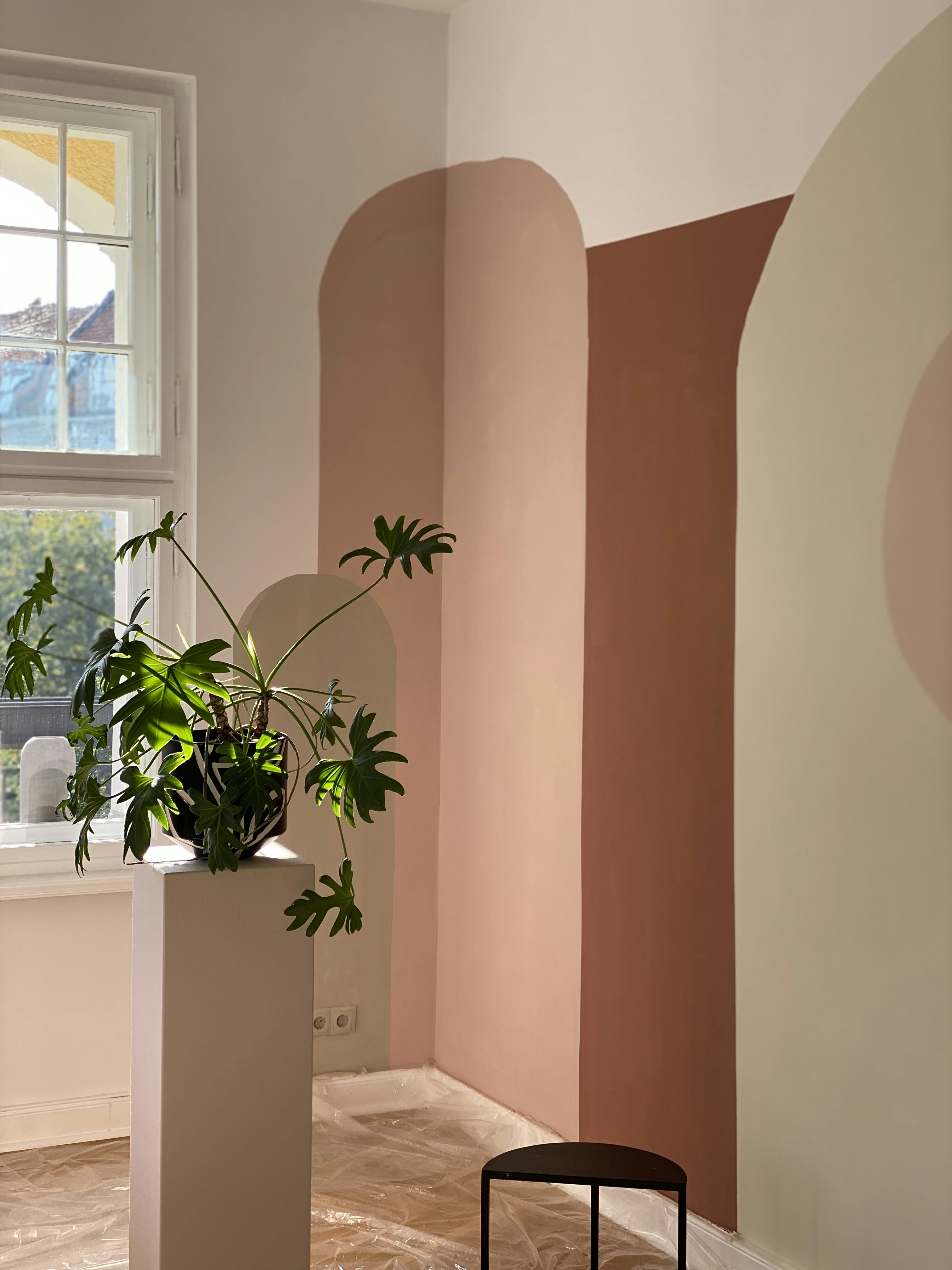 Ich streiche gerne Wände. Klar, das Abkleben nervt, das Saubermachen der Pinsel und Rollen auch, aber das Streichen an sich? So einfach und effektiv kann man kaum mit Möbeln die Gesamtwirkung eines Raumes verändern. Warum sind wir also nicht noch viel mutiger mit Farben? Das habe ich mich auch gefragt, als ich vor den drei großen, weißen Rundbögen in meinem senfgelb gestrichenen Arbeitszimmer stand, die nach zwei Jahren immer noch nicht mit den Regalen bestückt waren, wegen derer wir sie gemalt hatten. Dann sah ich Nina Sophie Gekelers Aufruf auf Instagram nach Kund*innen, die Lust auf eine Wandmalerei hatten. Und dachte mir: wieso eigentlich nicht?!