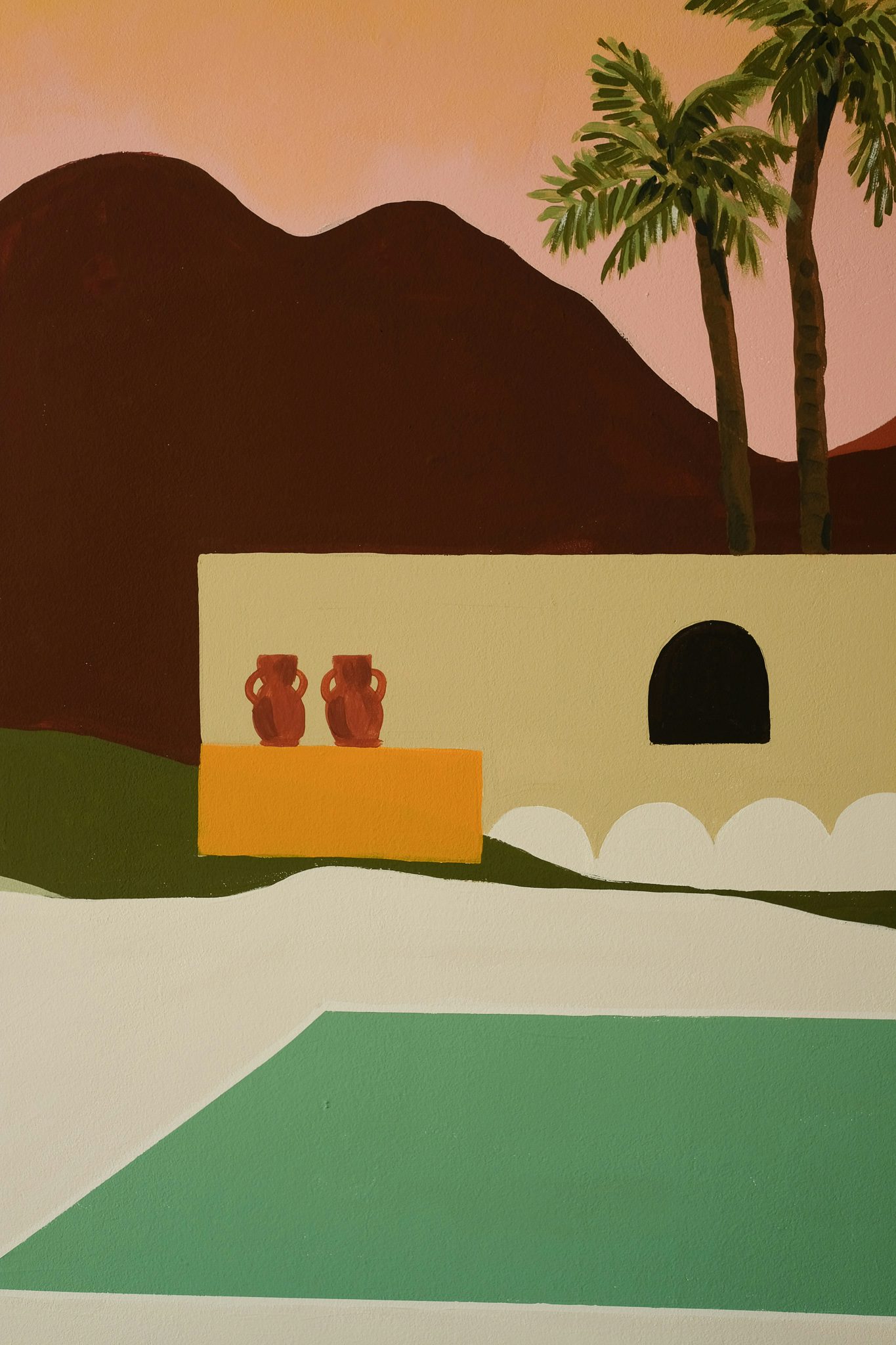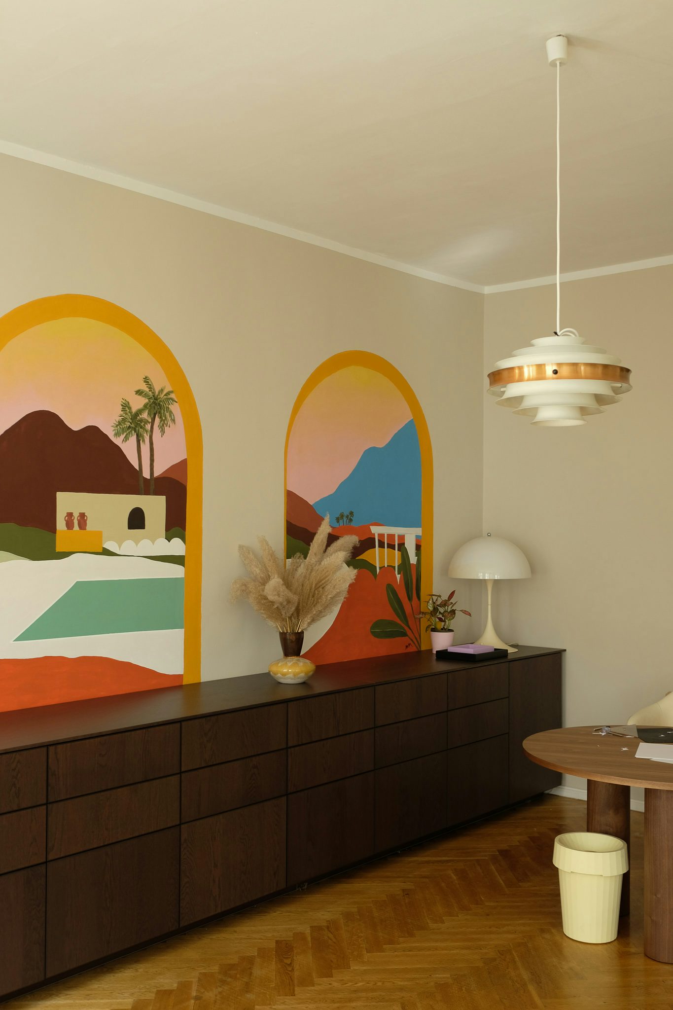 Springen wir in die 2020er-Jahre. Jetzt erblickt man sie wieder mehr, die Einzelstücke auf Wänden, aufwendig von Hand gemalt, manchmal modern, manchmal realistisch, manchmal komplett abstrakt. Dazu muss man nur aufmerksam ein paar Ausgaben der AD durchblättern und ein besonderes Augenmerk auf die Wände richten. Architektin Federica Gambigliani Zoccoli, Künstlerin Gabriela Benatar und Studios wie Pictalab haben sich auf die Handwerkskunst fokussiert – und natürlich auch die Berliner Künstlerin Nina Sophie Gekeler mit Maison Mural, die unser Wandbild gestaltet hat.