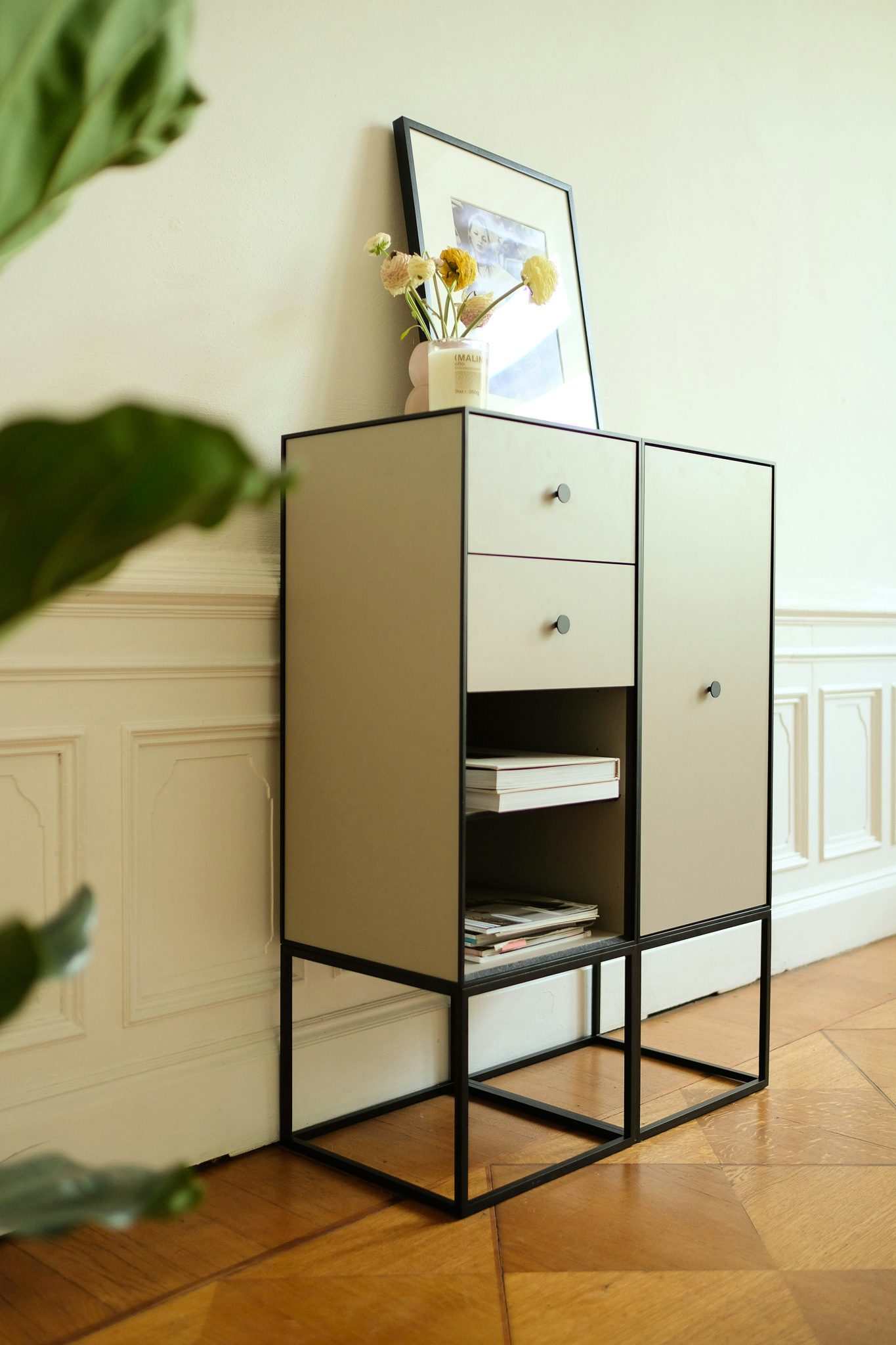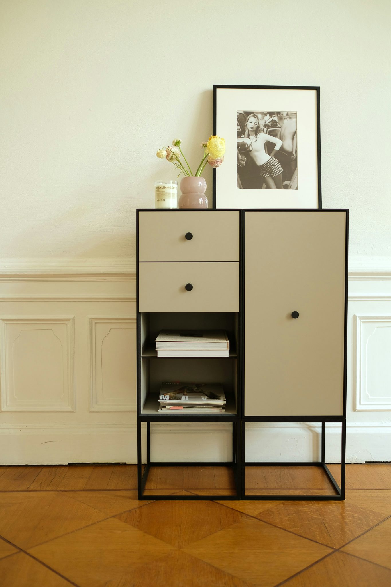 Wir haben uns im Office für zwei Elemente mit Schubladen und Einlegeböden und eines mit einer Tür entschieden. Der Grund: Wir wollen möglichst viele unschöne Dinge (da sind wieder die Aktenordner) möglichst schön verstecken – und trotz viel Stauraum gerne flexibel bleiben. Denn wir bauen unser Office aufgrund von Shootings und Videodrehs gefühlt täglich um, da ist es gut, dass die beiden Elemente so leicht sind und wir sie easy verschieben können.