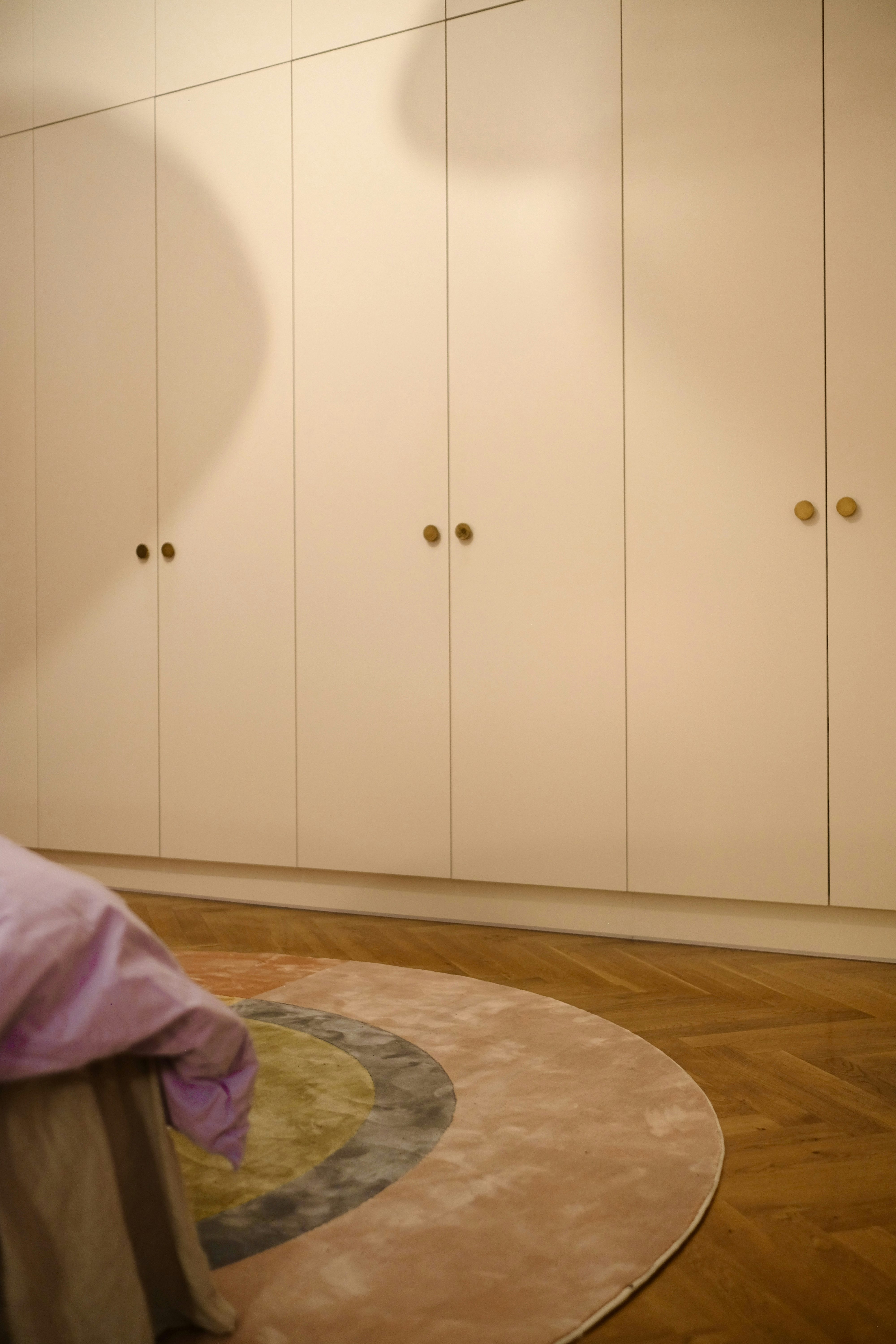 Bis auf ein größeres Bett und eine Kleiderstange zum Auslüften der Kleidung war unser Schlafzimmer also komplett! Na gut, ein Teppich fehlte noch. Denn der Boden ist kalt, im Schlafzimmer läuft man doch oft barfuß und wir wollten den Raum mit einem Teppich noch gemütlicher und weicher machen. Die Suche nach einem runden Exemplar mit einem Durchmesser von über zwei Metern gestaltete sich dann doch schwieriger als gedacht. Marokkanische Teppiche gibt es nicht in rund, ein Modell von Roche Bobois sollte in der Größe im fünfstelligen Bereich liegen, wir waren verzweifelt. Und dann trat Bold Monkey, ein niederländisches Inteorior Brand, mit dem Rainbow-Teppich auf die Bildfläche. Perfekter hätte es nicht passen können.