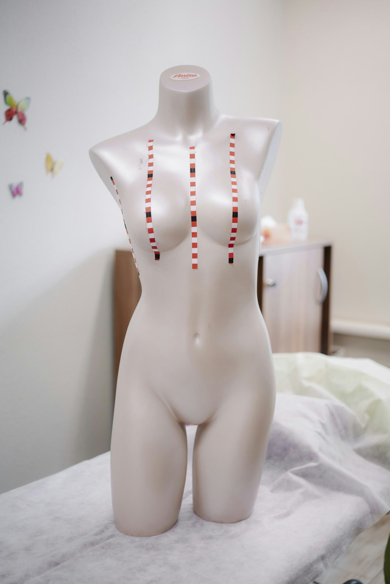 Danach folgt die gründliche Untersuchung im Liegen. Hier folgen wir den fünf Klebestreifen, die wir nach einer festen Vorlage auf den Oberkörper der Frauen kleben. Man untersucht von außen nach innen und von oben nach unten. Zentimeter für Zentimeter. Auf den Klebestreifen finden sich Markierungen in Braille, damit wir als Tastende eben auch sichergehen können, dass wir alle Bereiche abgedeckt haben. Die Streifen anzubringen und zu lesen, das lernen wir in der Ausbildung. Eine voll blinde Frau muss sie ja ebenfalls anbringen können. Das ist sehr komplex.