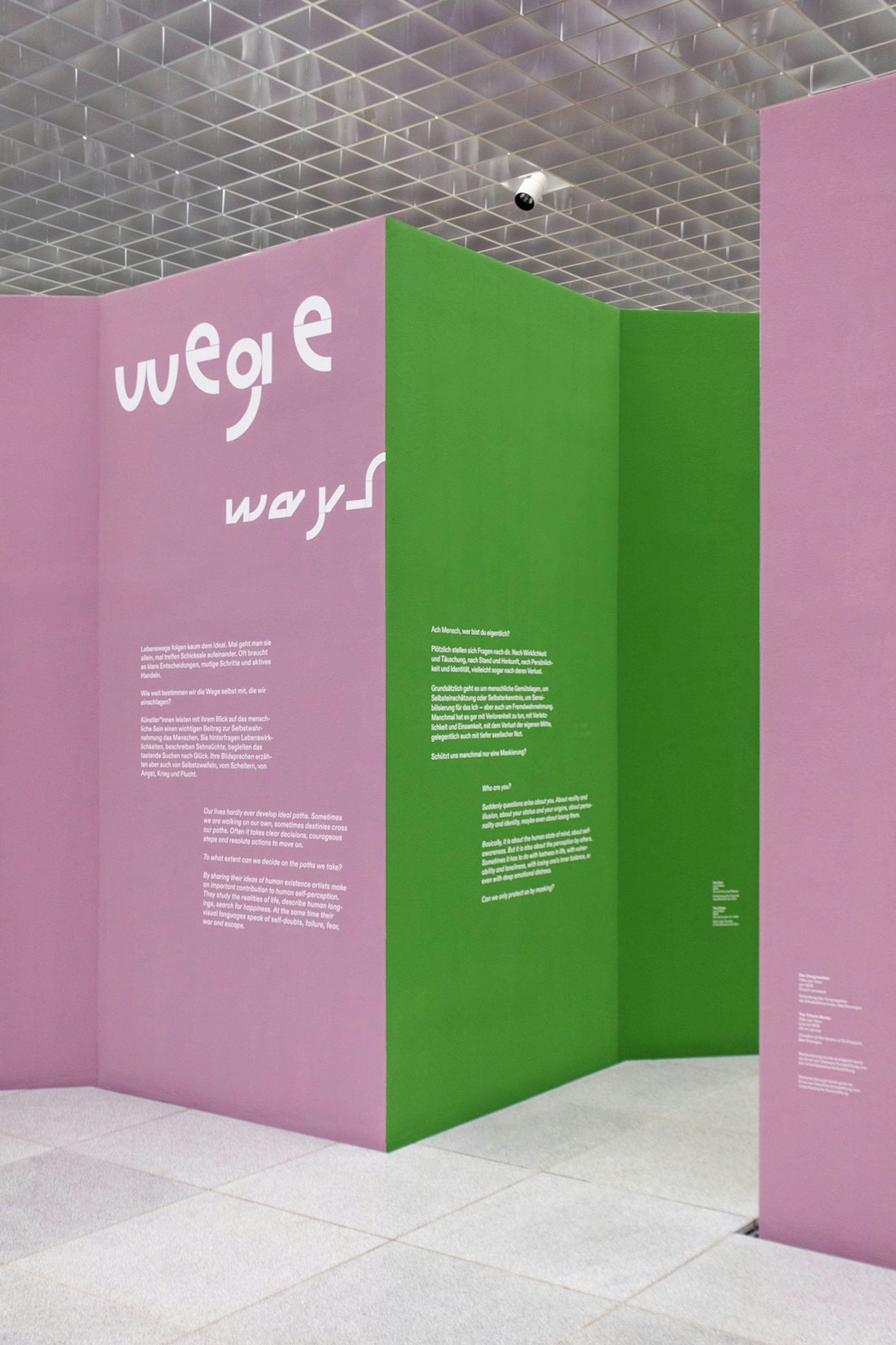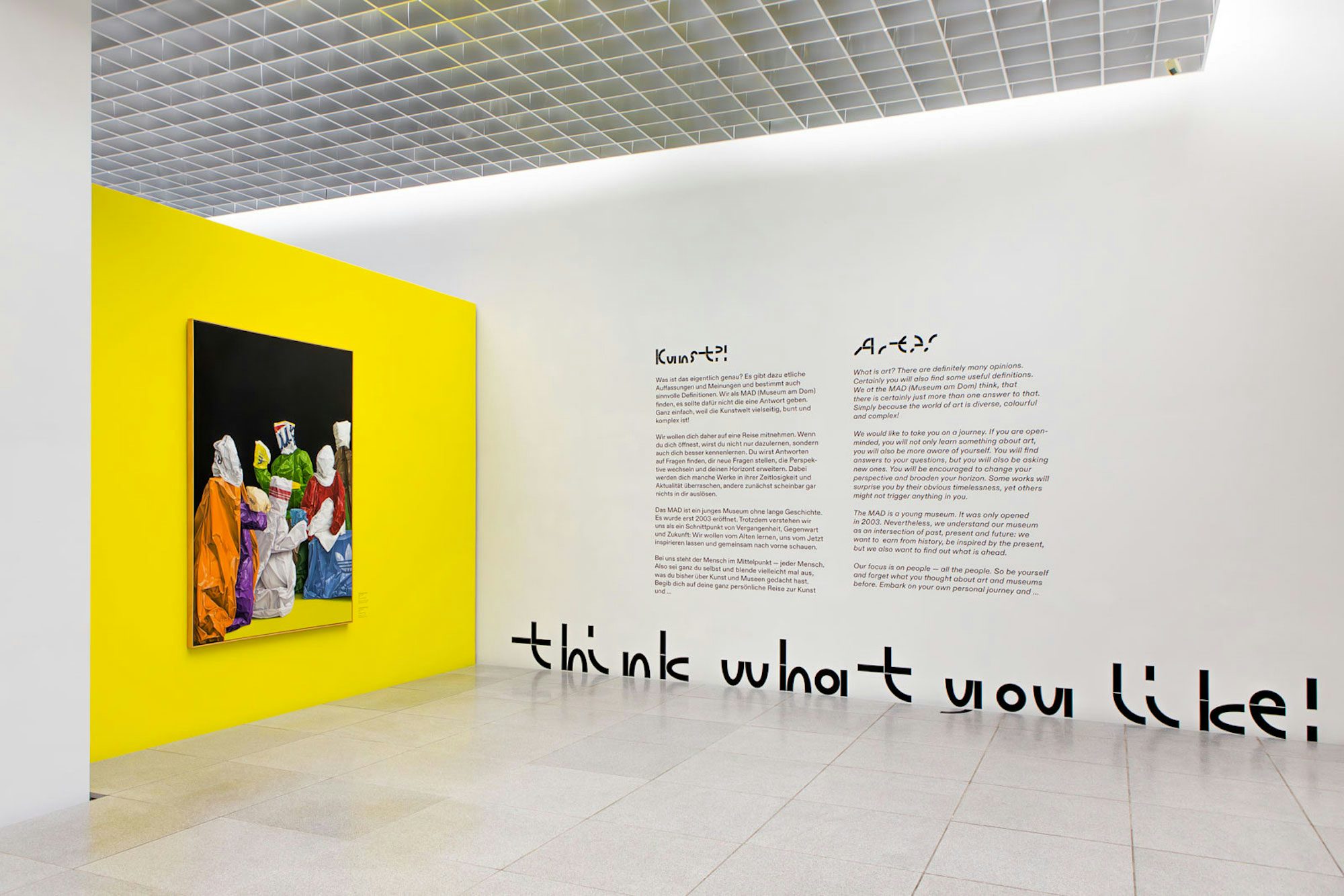 Wie bei allen Designprozessen ist es uns immer wichtig, ganzheitlich zu sein und mit einem guten Konzept Dinge zu erklären. Auch im MAD hatten wir viele Diskussionen, das prägnante Gelb auf der Wand hinter dem Leitobjekt gleich zum Beginn der Ausstellung wurde im Prozess zum Beispiel sehr stark hinterfragt. „Zu laut, lenkt vom Gemälde ab, ...“ Dabei ist die Wand der erste visuelle Kontaktpunkt für die Besucher*innen. Ziel muss es sein, nicht nur den Kunstwerken, sondern auch den Besucher*innen gerecht zu werden. Das unterstützt auch unser neu entwickelter Claim „Think what you like!“, der in sechs Meter Breite daneben steht.