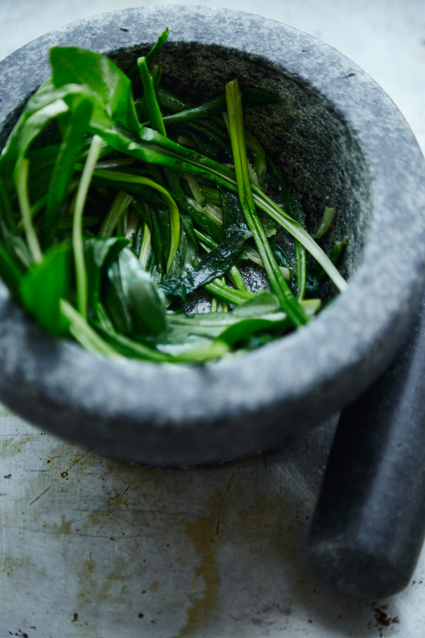 - Für die Bärlauchbutter den Bärlauch waschen, gut abtropfen und mit einem Mörser oder Zerhacker fein hacken. Mit den restlichen Zutaten vermischen und bei Raumtemperatur stehen lassen.