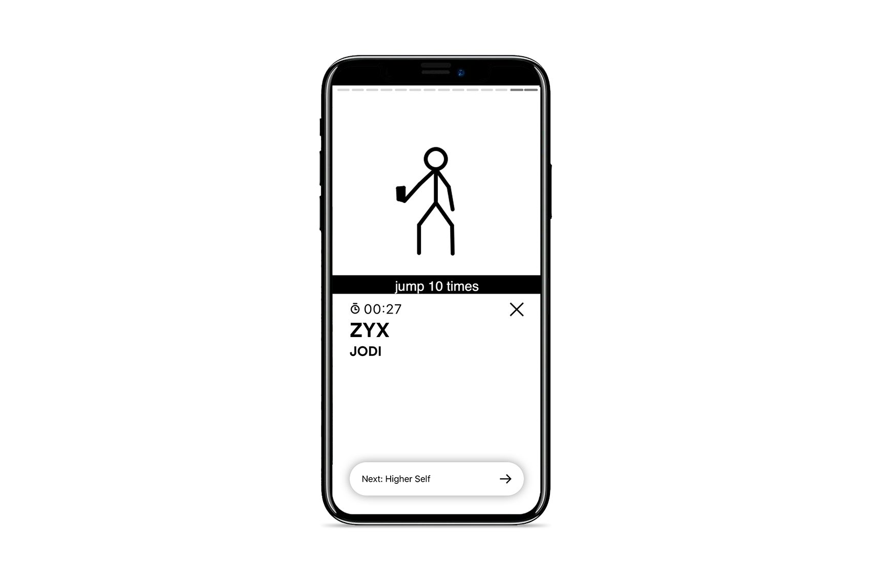 Deutlich strapaziöser für meinen Puls ist die Arbeit „ZYX” von JODI alias jodi.org. Für 30 Sekunden macht mir ein GIF-Männchen Fitnessübungen vor, die ich mit dem Smartphone in der Hand nachmachen soll. Ich hüpfe, ich drehe mich, ich zappele munter über das Parkett. Meine Nachbar*innen sind vermutlich weniger begeistert, ich komme aber ziemlich ins Schwitzen.