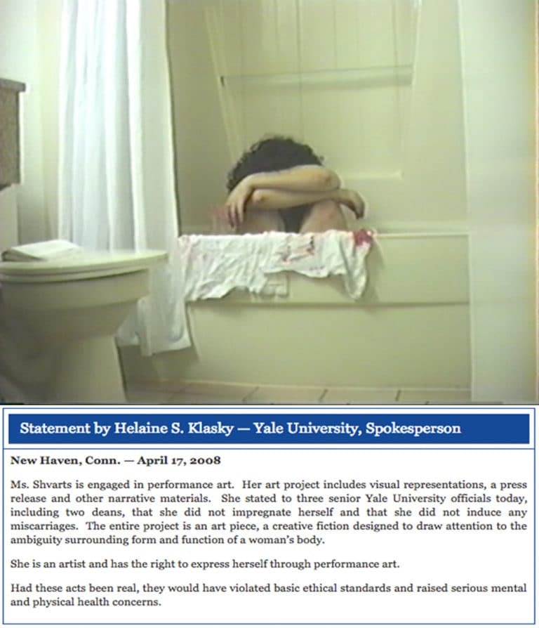 Eine der kontroversesten Performances zum Thema Abtreibung stammt wohl von der amerikanischen Künstlerin Aliza Shvarts. Ihre erste große Arbeit Untitled (Major Thesis) ist hauptsächlich unter dem Namen Yale Student Abortion Art Controversy bekannt und wurde von einer heftigen internationalen Debatte um das Selbstbestimmungsrecht begleitet. Im Jahr 2008, Shvarts war zu der Zeit 22 Jahre alt, veröffentlichte die damalige Studentin Videos einer Performance. Sie hatte sich über mehrere Monate hinweg mit gespendetem Sperma befruchten lassen und führte dann, unwissend, ob sie schwanger war oder nicht, eine durch pflanzliche Medikamente herbeigeführte Fehlgeburt herbei. Bei dieser Tätigkeit und den darauf folgenden Blutungen filmte sie sich und machte so ihren Körper zum Mittelpunkt der Performance. Was folgte, war eine Welle von Entrüstung, Einschüchterungsversuche seitens der Universität Yale und Protesten von Abtreibungsgegner*innen, aber auch Pro-Choice Aktivist*innen. Die Universität fühlte sich zusätzlich genötigt, eine offizielle Erklärung abzugeben, in der sie die Performance als Fiktion entlarvte und im Namen der Kunstfreiheit verteidigte. Hier können wohl vor allem die Reaktionen von außen als wichtiger Teil des Kunstwerks gesehen werden, die der Aktion erst ihre entscheidende Bedeutung geben.