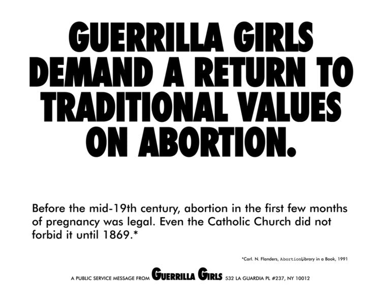 Im Jahr 1992 einen Rückschritt zu traditionelleren Abtreibungsgesetzen fordern? Dieses Plakat stammt ausgerechnet von der progressiven Künstlerinnengruppe Guerrilla Girls. Die Erklärung folgt natürlich prompt im Kleingedruckten: Bis ins 19. Jahrhundert herrschten an vielen Orten der Welt tatsächlich verhältnismäßig lockere Gesetze gegen Schwangerschaftsabbrüche. So mussten die betroffenen Frauen etwa eine Geldstrafe zahlen. Dies galt allerdings nicht überall und die Todesstrafe oder mehrere Jahre im Zuchthaus waren übliche Alternativen. Die kampagnenartige Aufmachung des Plakats, mit dicken Lettern und provokanten Sprüchen, ist typisch für die 1985 gegründete Guerrilla-Gruppierung, die mit ihren Aktionen häufig Rassismus oder Sexismus in der Gesellschaft thematisiert.