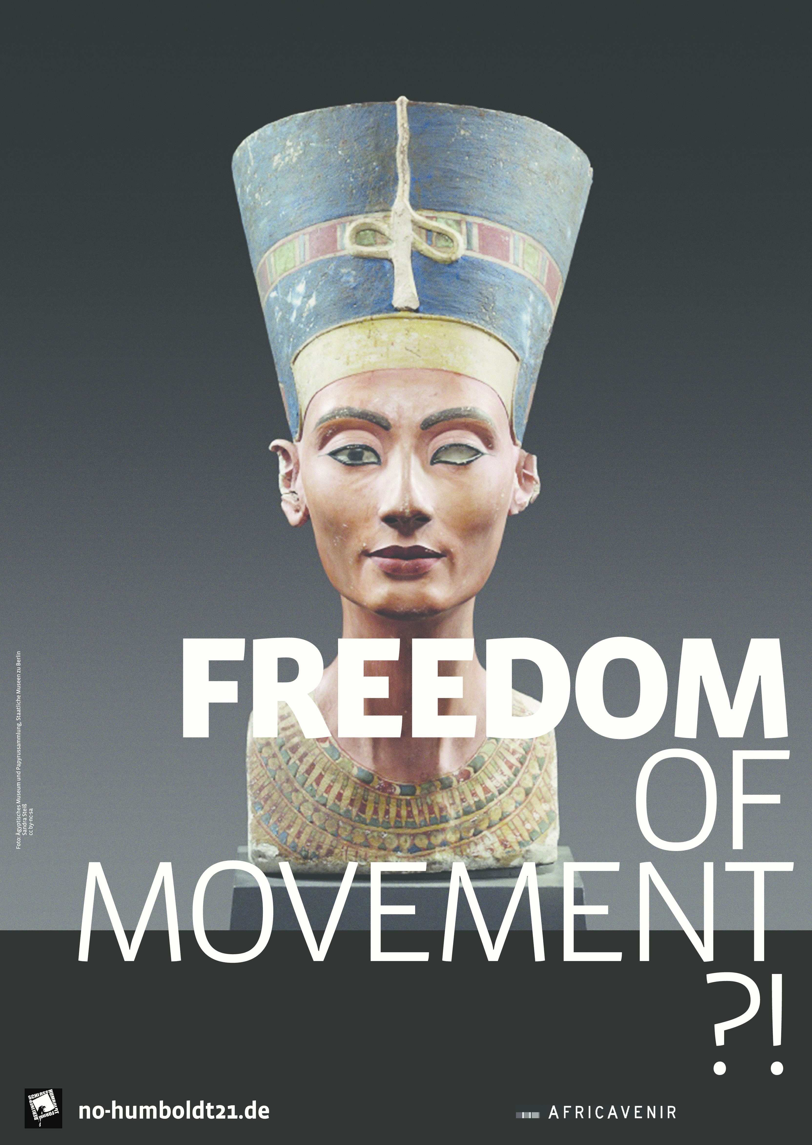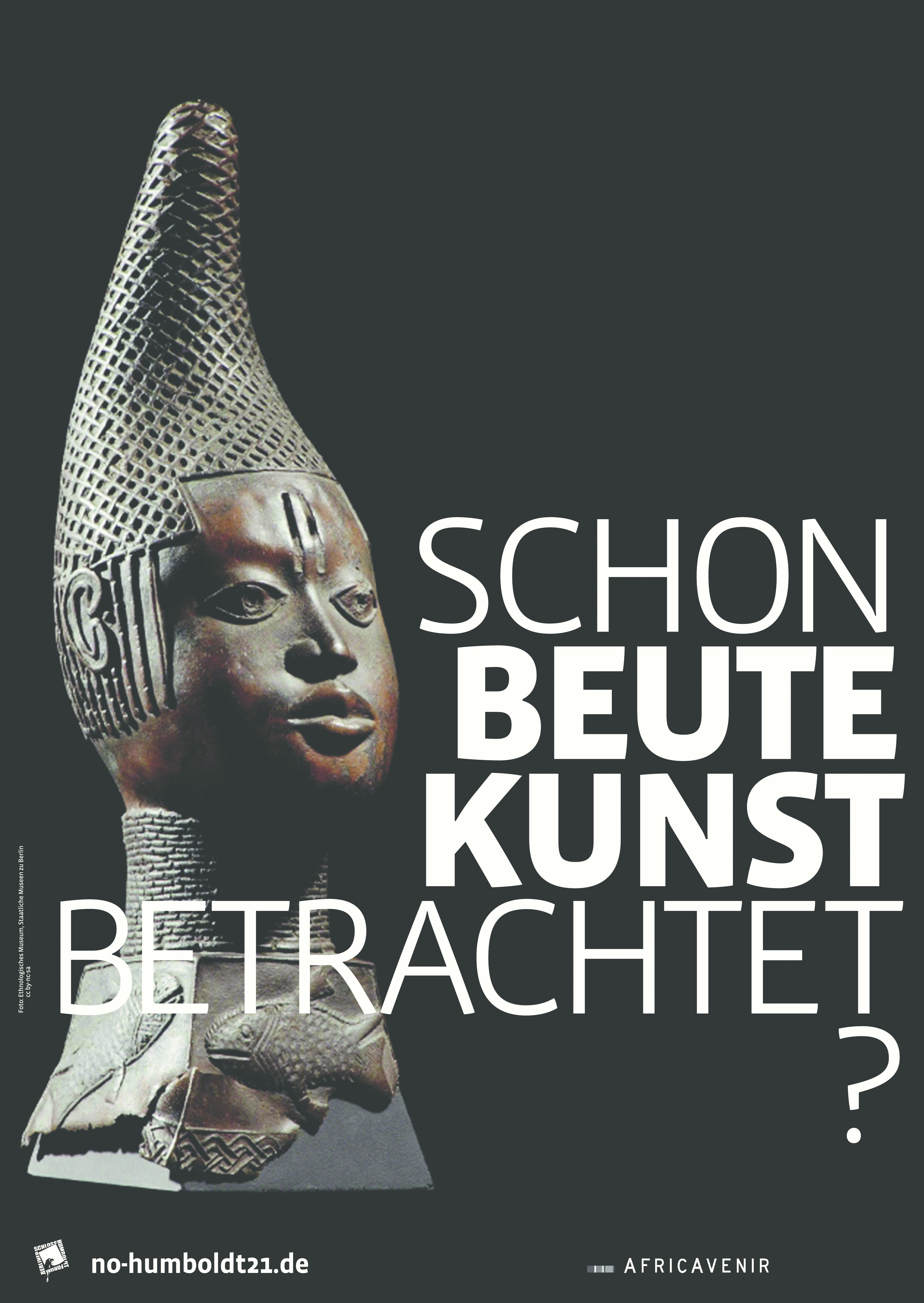 Die wichtige Debatte zum Thema Kolonialkunst findet mittlerweile nicht nur in Frankreich, sondern auch in Deutschland, Großbritannien und vielen weiteren Ländern statt. Das in Berlin gebaute Humboldt Forum in wird laut Bericht ganze 75.000 Werke ausstellen, deren Rückgabe gefordert wird. Eine Organisation, die das Konzept des Humboldt Forums stark kritisiert, ist AfricAvenir International . Die von ihr entwickelte Posterkampagne kritisiert die geplante Präsentation von Kolonialkunst im Berliner Schloss, indem sie besonders umstrittene Kunstwerke abbildet und auf deren Herkunft aufmerksam macht: