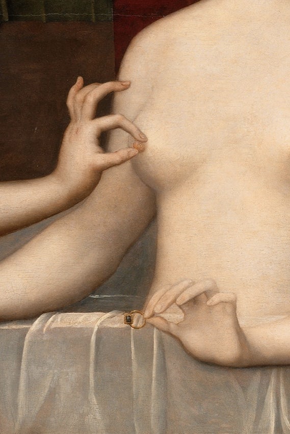 Heute wird angenommen, dass das Gemälde eine ganz andere Botschaft vermitteln sollte. Denn der Ring in Gabrielles Hand ist dort nicht zufällig, sondern verweist auf König Heinrich. Es ist sein Krönungsring. Historiker*innen glauben, dass wir hier eine bildliche Ankündigung von Gabrielles Schwangerschaft sehen. Verkündet wird diese durch den Nippel-Zwicker, die Brust ist ein Zeichen für Fruchtbarkeit. Im Hintergrund sehen wir eine nähende Amme, die Kleidung für das Neugeborene herstellen könnte – ein weiteres Symbol, das für die Baby-These spricht. Da Heinrichs Ehe bisher kinderlos geblieben war, ist dieses Gemälde von großer Bedeutung: Gabrielles Kind könnte Thronfolger werden!
