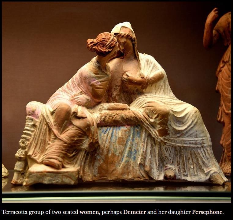 Das obige Bild ist ein gutes Beispiel für eine ziemlich verwirrende Beweislage. Die kleine Terrakotta-Plastik stammt aus Griechenland und befindet sich heute im British Museum in London. Es ist nicht völlig abwegig, dass es sich hier um Demeter und ihre Persephone handelt. Aber obwohl Mutter und Tochter der Sage nach ein ziemlich enges Verhältnis pflegten, ist die Darstellung ungewöhnlich intim: Beide Frauen scheinen im Kuss innezuhalten, sie sitzen auf einem Bett und eine Brust ist entblößt. Viele mythologische Mutter-Tochter-Beziehungen beflügelten die Fantasie der Künstler so stark, dass sie sie kurzerhand zu Geliebten umgestalteten. Aber ist das hier der Fall – oder handelt es sich doch um Queer Erasure?