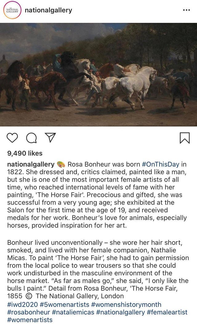 Instagram-Post der National Gallery, in der Rosa Bonheurs Lebensgefährtin Nathalie Micas als „female companion“ bezeichnet wird.