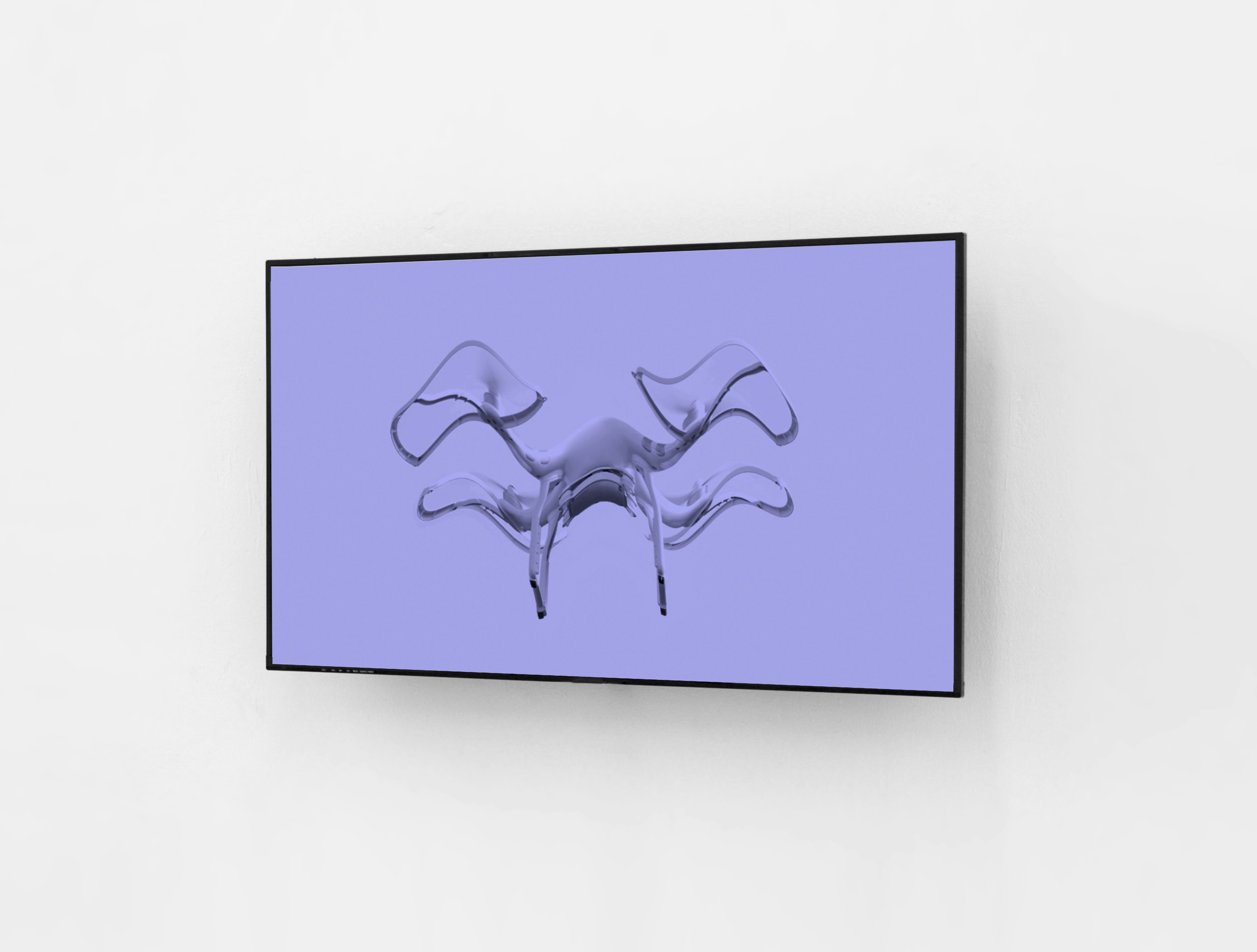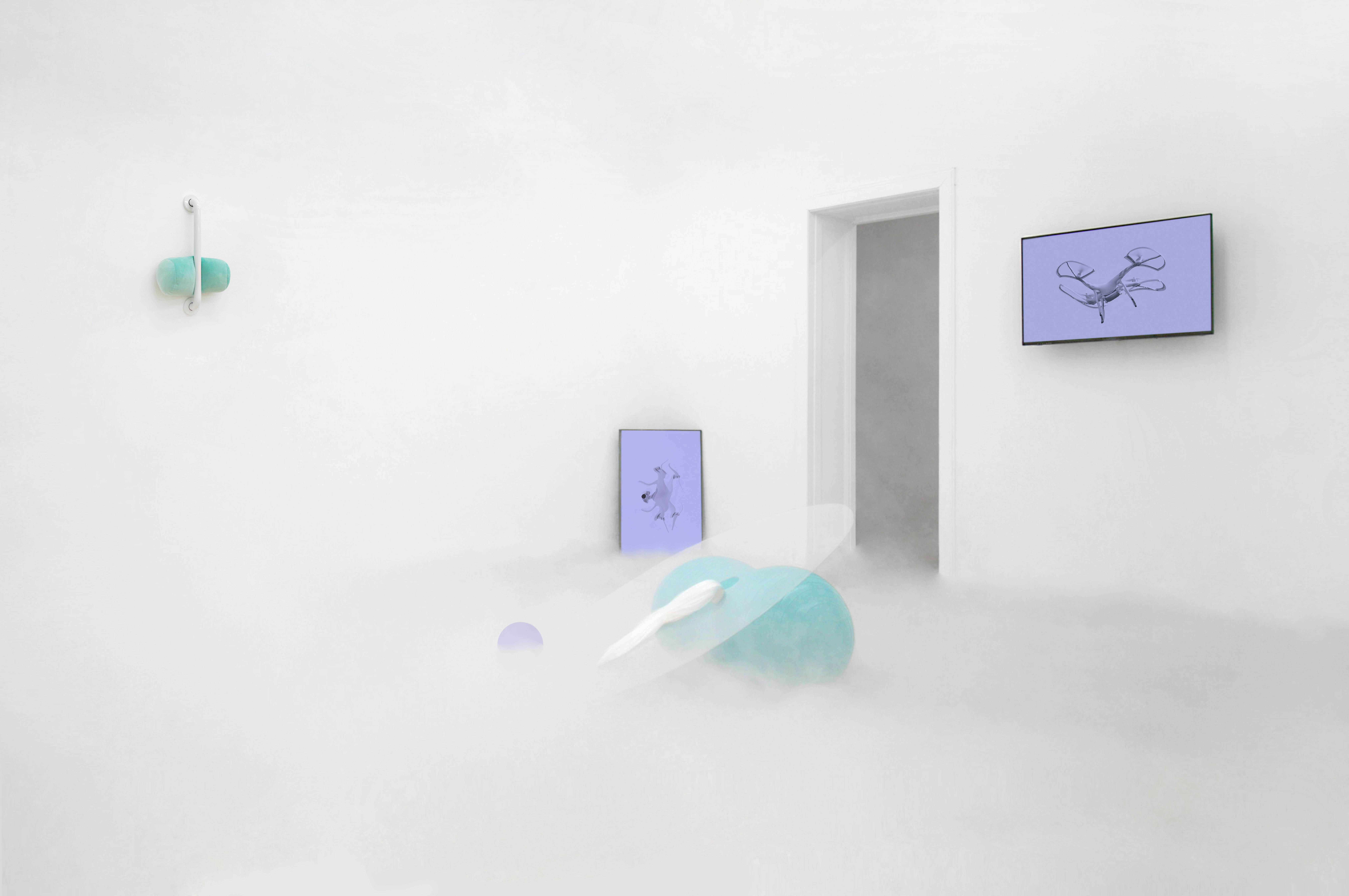 Was sehe ich eigentlich vor mir? Es handelt sich um eine raumfüllende Installation, die Wände sind weiß gestrichen. Zuerst springen mir die beiden Handtuchhalter ins Auge, die an zwei gegenüberliegenden Wänden angebracht sind. An einem von beiden hängt ein Synthetikhandtuch, hinter dem anderen ist ein türkises Nackenkissen eingequetscht. In der Mitte des Raumes befindet sich eine Skulptur aus einem aufgeblasenen Gymnastikball (Stichwort Schwangerschaftssport) und einer Plexiglasplatte. An der Konstruktion ist ein platinblonder Kunsthaarzopf befestigt. An der Wand mir gegenüber befinden sich zwei Fernsehbildschirme, auf denen sich zwei Drohnen psychedelisch verformen. Eine von ihnen spricht mit leiernder Stimme auf Englisch mit mir. Durch die Verzerrung erinnert sie mich an einen winkenden Kraken.