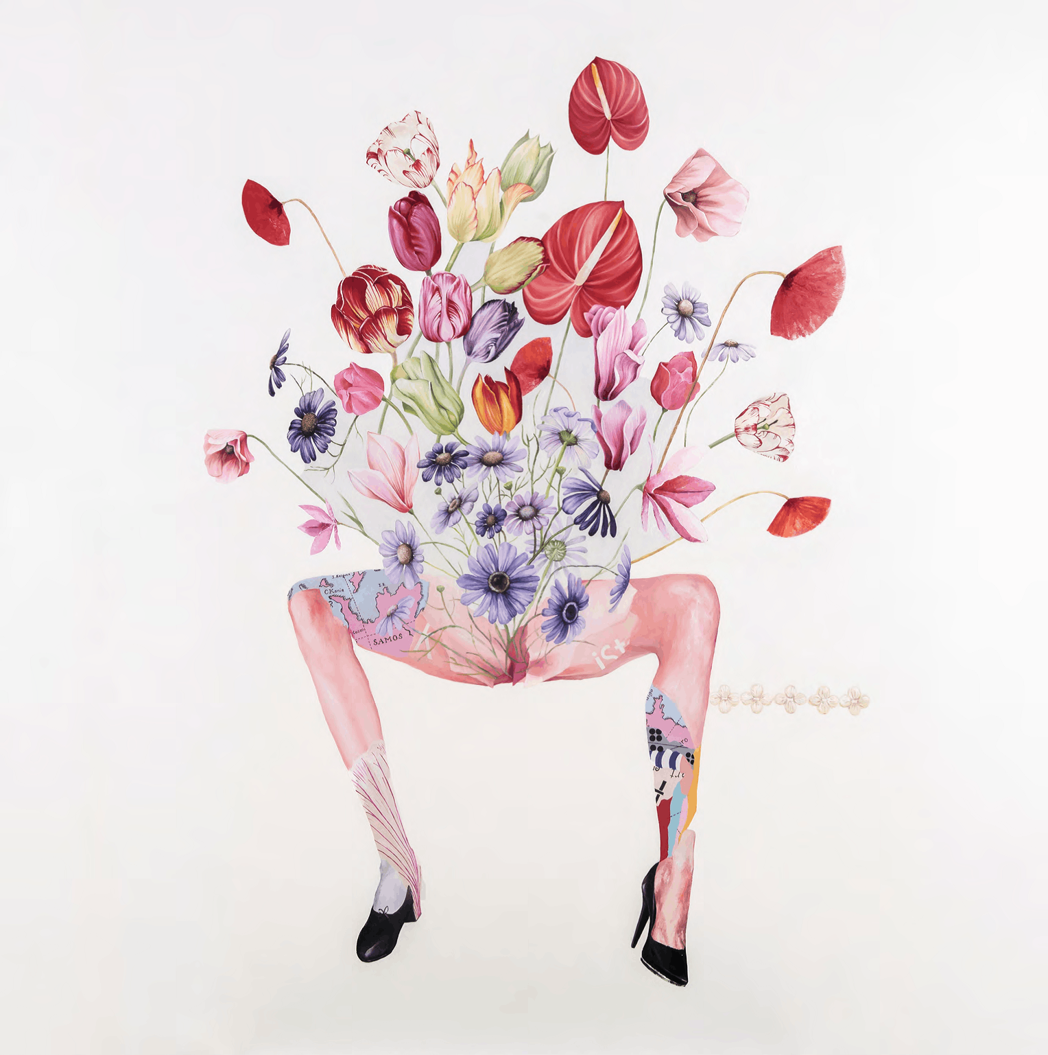 Das Motiv kommt auch in meiner Arbeit „Family Tree“ vor, die einen Stammbaum darstellt. Hier werden die ganzen Lasten und Erinnerungen der vergangenen Generationen dargestellt, die man so mit sich herumträgt. Sie zerren quasi an unserem Skelett, an unserer Haltung. Manchmal macht die Vergangenheit uns krank, manchmal sie uns aber auch aufblühen – das ist der Grund für die Blumen. Blumen sind ja auch ein Symbol der Heilung.