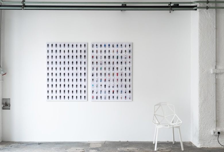 Für seine 2018 entstandene Fotoserie „Selbstportrait“ hat Simon Freund 100 Menschen abgelichtet, die seine charakteristische Kleidung tragen: Mütze, Pulli, all black everything. Im Gegenzug ist er in die Klamotten aller 100 Fotografierten geschlüpft und hat sich ebenso fotografieren lassen: In Strumpfhosen, Baggy Pants und High Heels. Entstanden sind Aufnahmen von uniform wirkenden Abbildern seiner selbst, die gleichzeitig eine starke Diversität vermitteln.
