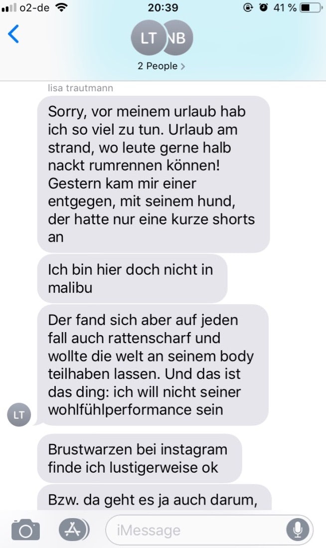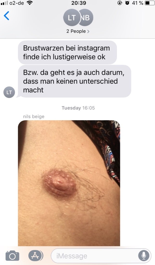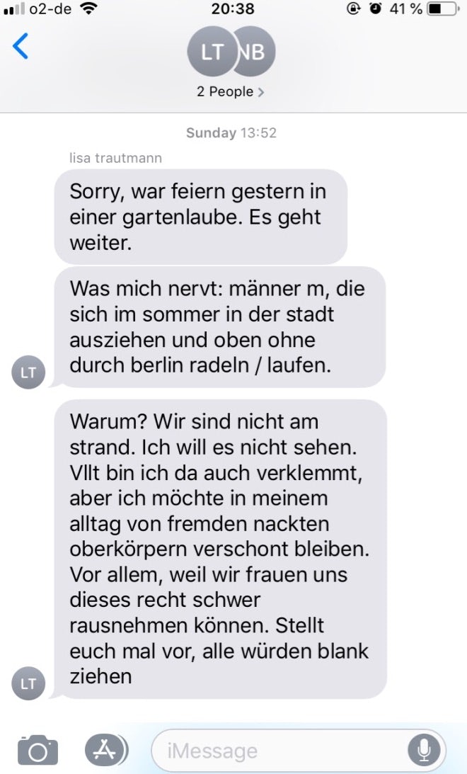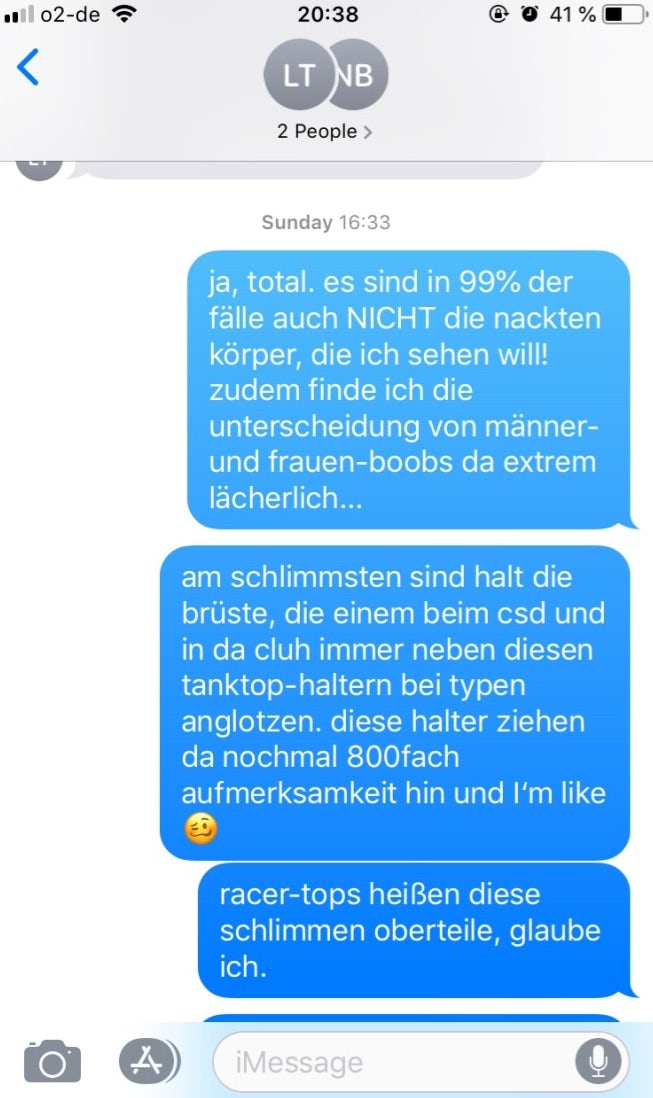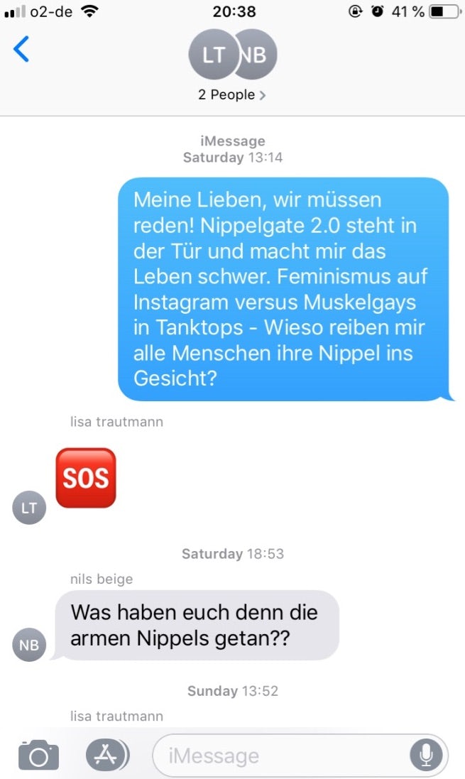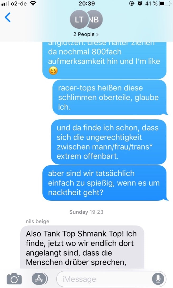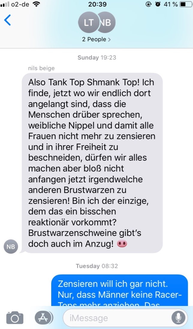 Doch Team Beige ist here to help. In einem Old-School-Chat auf iMessage diskutierten Felix, Lisa und Nils über die Zukunft der Brust. Es ging um eine persönliche Vendetta gegen Racer-Tops, verklemmte Deutsche und solicited Nip-Pics.