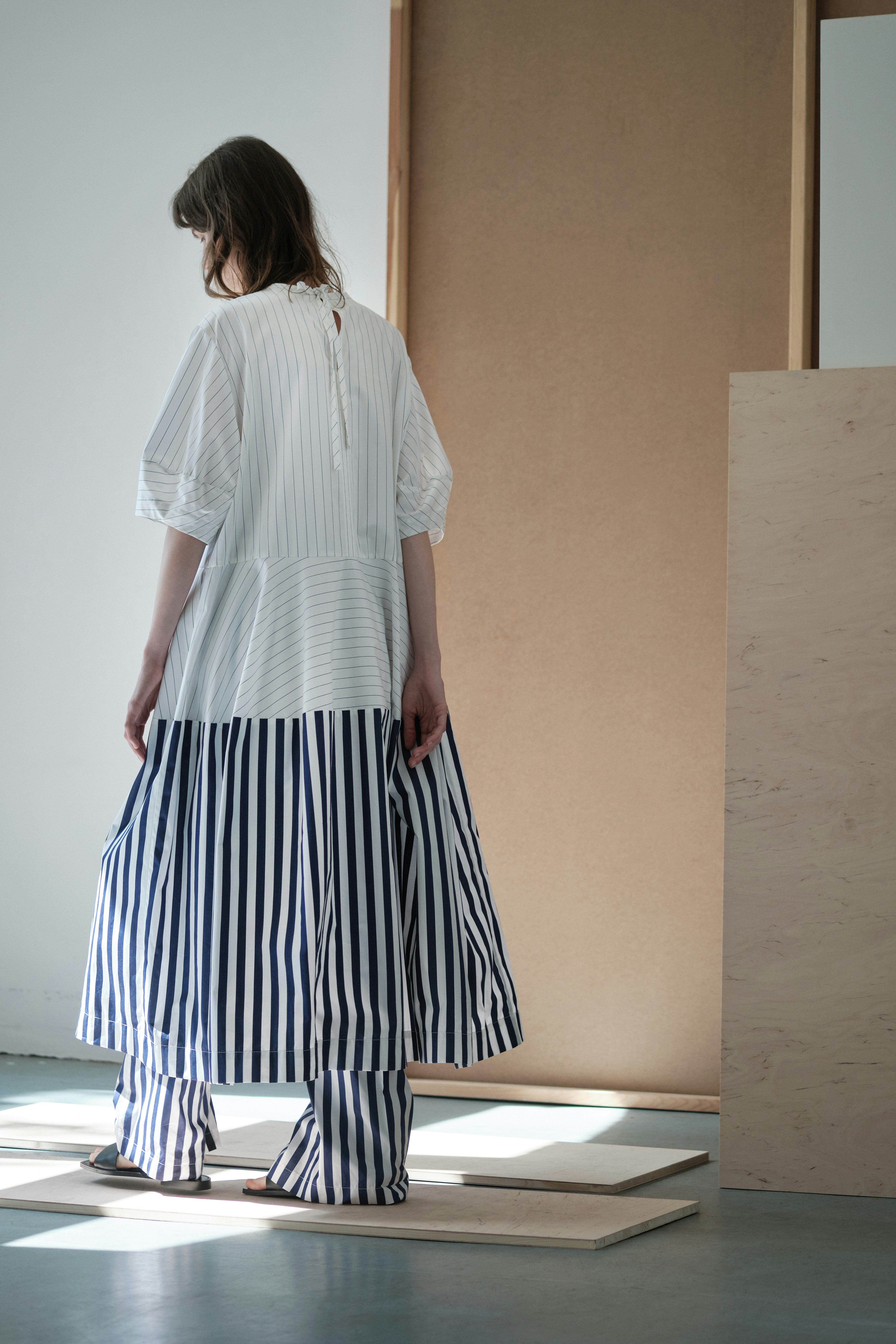Das ist schwierig für mich zu beantworten. Ich habe mich nicht hingesetzt und den Markt nach einer Nische analysiert. Ich mache das, was meine Ästhetik ist und was ich gut finde – und das habe ich im Laufe der Jahre und des Studiums entwickelt. Durch ganz viel Ausprobieren. Ich habe 2010 angefangen zu studieren und in den letzten Jahren immer wieder in meiner Uni unterrichtet. Ich muss sagen, dass ich sehr froh bin, dass ich damals studiert habe und nicht heute, wo es Instagram gibt. Was ich bei aktuellen Studenten sehe, die sich alles auf Instagram anschauen, was die für Kollektionen machen, das sieht aus wie Kenzo, Vetements oder Co. Das, was ich in den ersten Semestern gemacht habe, hatte nichts mit Mode zu tun. Ich habe alles ausprobiert, egal ob Schnitte oder Materialien. Das konnte man nicht tragen. Dazu noch Kunstkurse und dann findet man schon langsam seinen Stil.