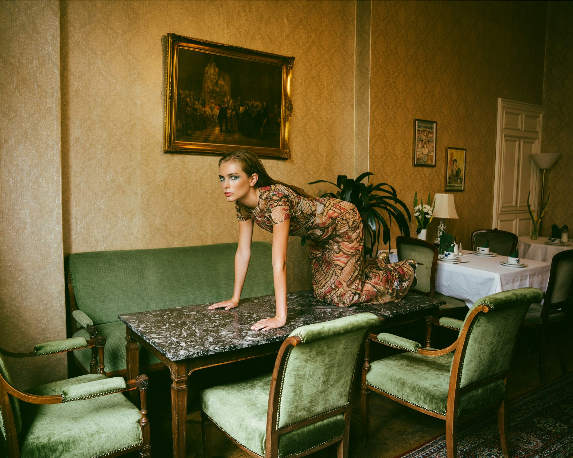 Viel Tüll und Seide und Gefieder – gegen den drohenden Winterblues kann es erstaunlich wirksam sein, sich mit dem Feinsten einzukleiden, was die eigene Garderobe hergibt und im wahrsten Sinne des Wortes auf dem Tisch zu tanzen. Hängende Schultern, trübe Gedanken? Nein: Staatsbankett – imaginär. Wichtigster Gast? Ich! Letzte*r an der Bar? Ebenfalls ich. Alleinsein ist auch nur eine Form der sehr geschlossenen Gesellschaft.