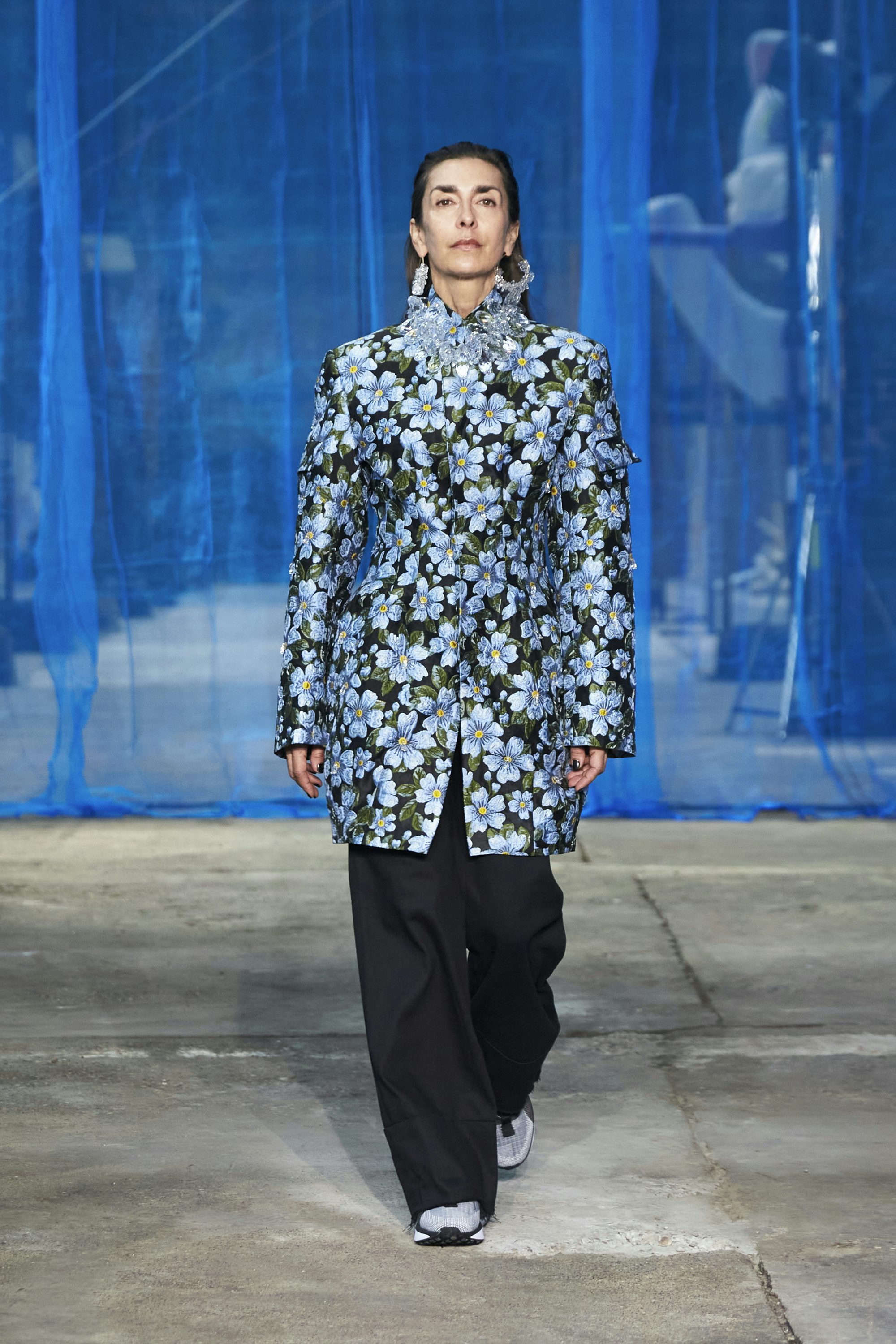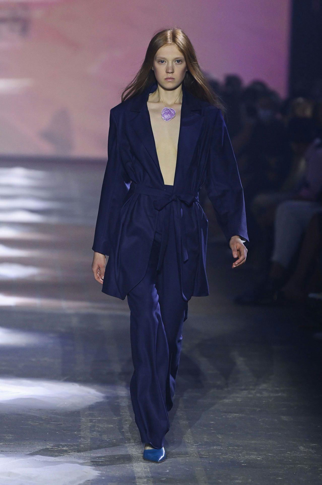 Der Ort, der mit dem wunderschönen Set-Design repräsentiert wurde, war Ibiza. Ein Ort der Träume und Inspiration für Christina und Sebastian – und ja, ihre Kollektion war ein legerer Mix aus Hamburger Business Attire und balearischer Lässigkeit. Florale Halsketten und Armbänder trafen auf Power Suits und lange Mäntel, neben Naturtönen dominierte vor allem ein knalliges Blau.