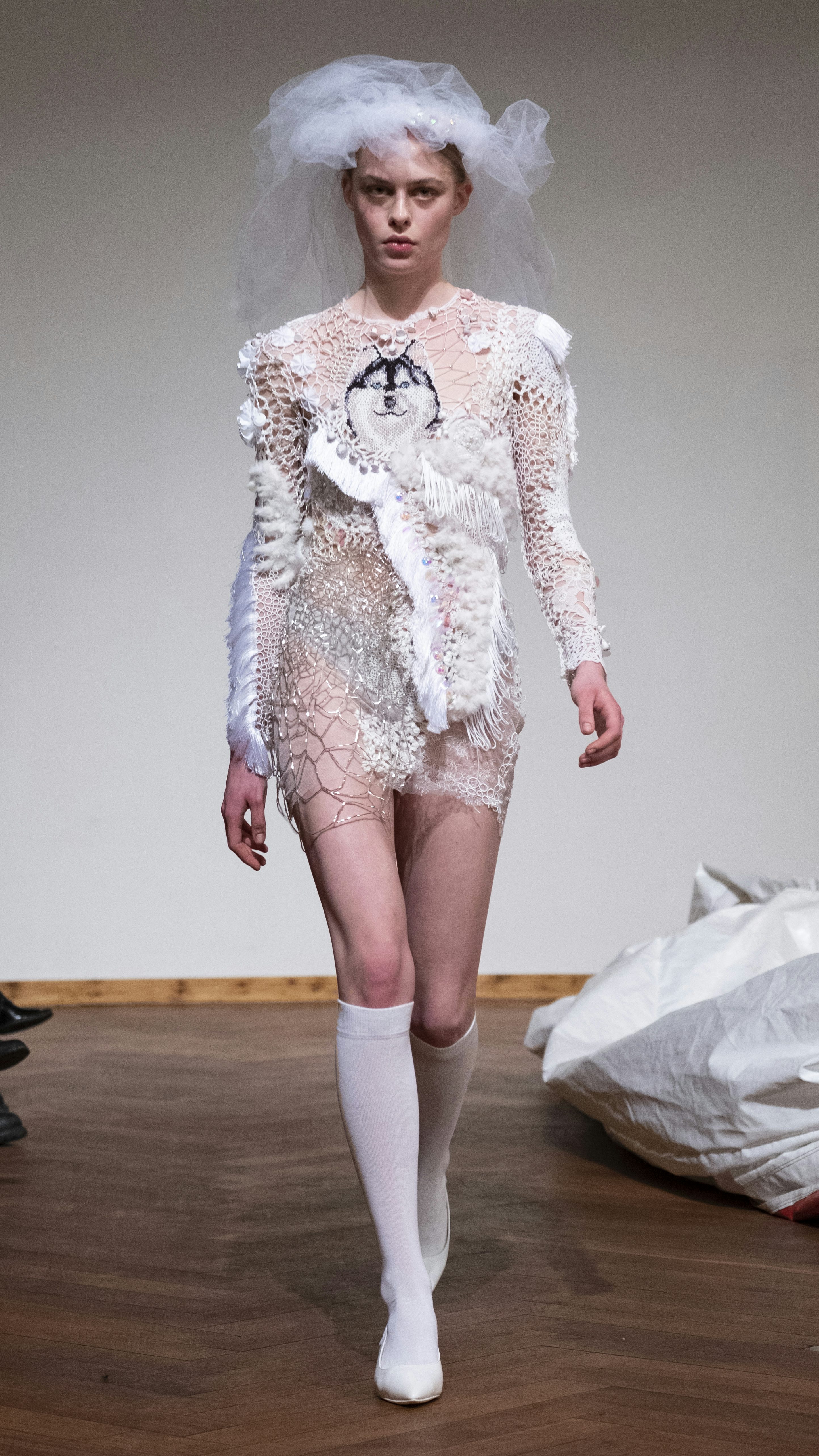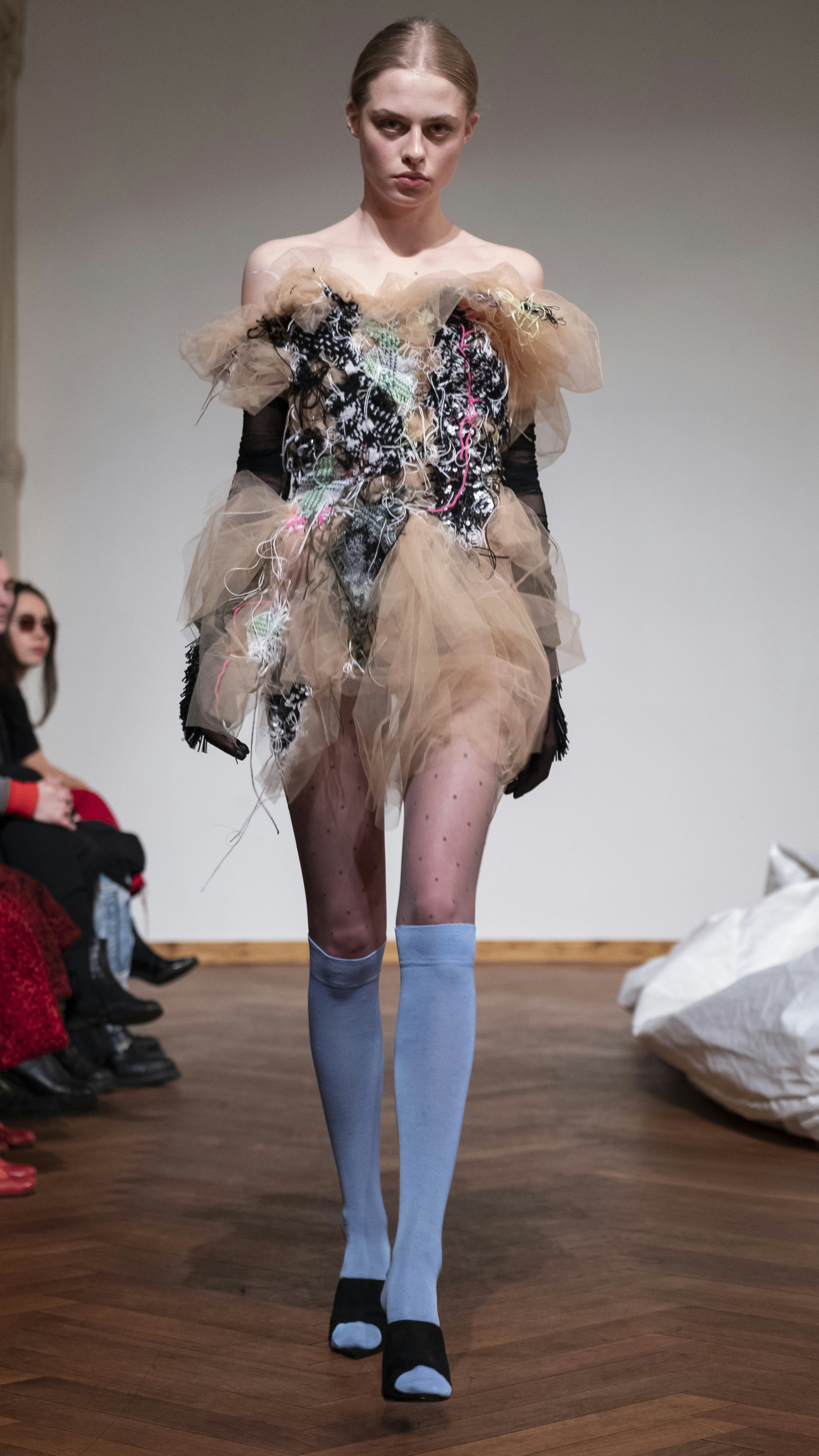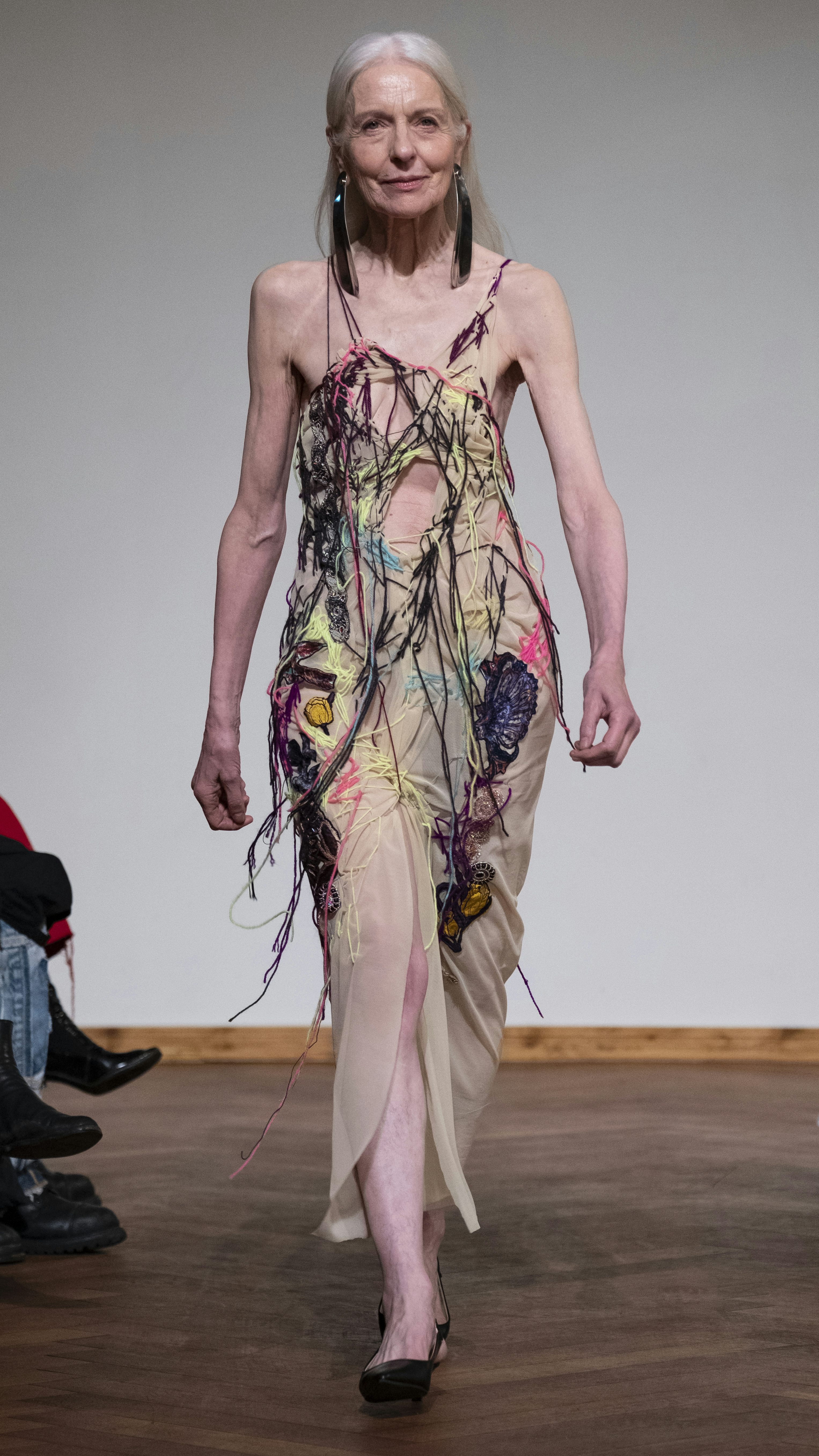 Bei Lou de Bétoly wurde das Défilée gar zur Performance. Eine in sich zusammen gesunkene Hüpfburg bildete das Zentrum der Show in der altehrwürdigen Villa Elisabeth in Mitte. Die Models schritten selbstbewusst durch den mit einer Galerie gesäumten Lichthof, gekleidet in dekonstruierten Denim-Ensembles, patchworkartig zusammengefügten Materialien, die unterschiedlicher nicht sein könnten. Löchriger Strick, verwoben mit Angora und Plastik. „Ethno-Dada“ nennt es die Designerin Odély Teboul und ich finde, dieser Begriff trifft den Nagel auf den Kopf. Gleichzeitig hinterfragt Lou de Bétoly unseren Schönheitsbegriff, indem sie Models jeden Alters und mit ordentlich Botox im Gesicht über den Laufsteg schickt. Einzig: Sie sind alle wirklich sehr dünn, diese Models. Hier wurde eine Chance vertan, der Thematik noch eine weitere Ebene zu geben.