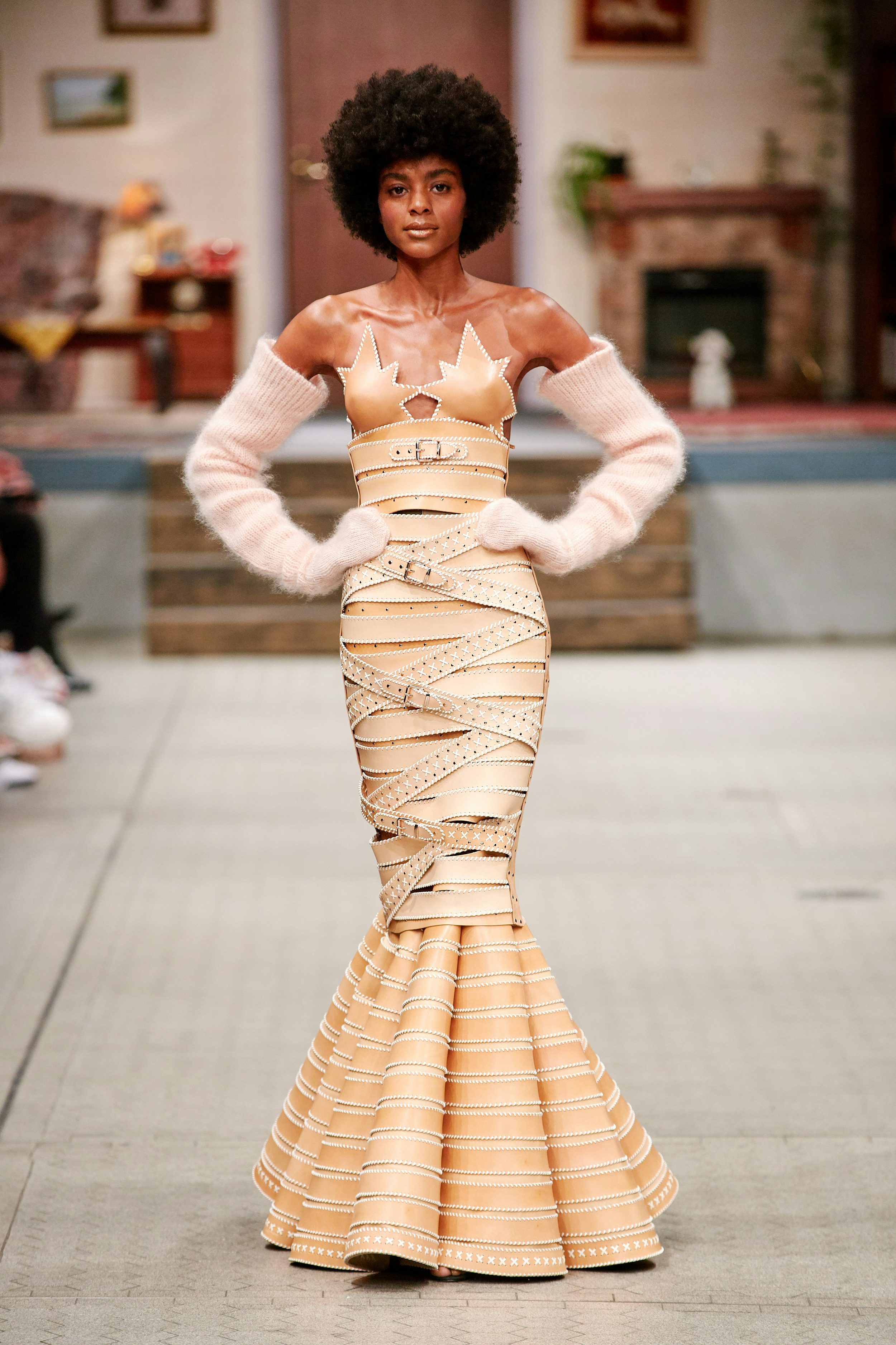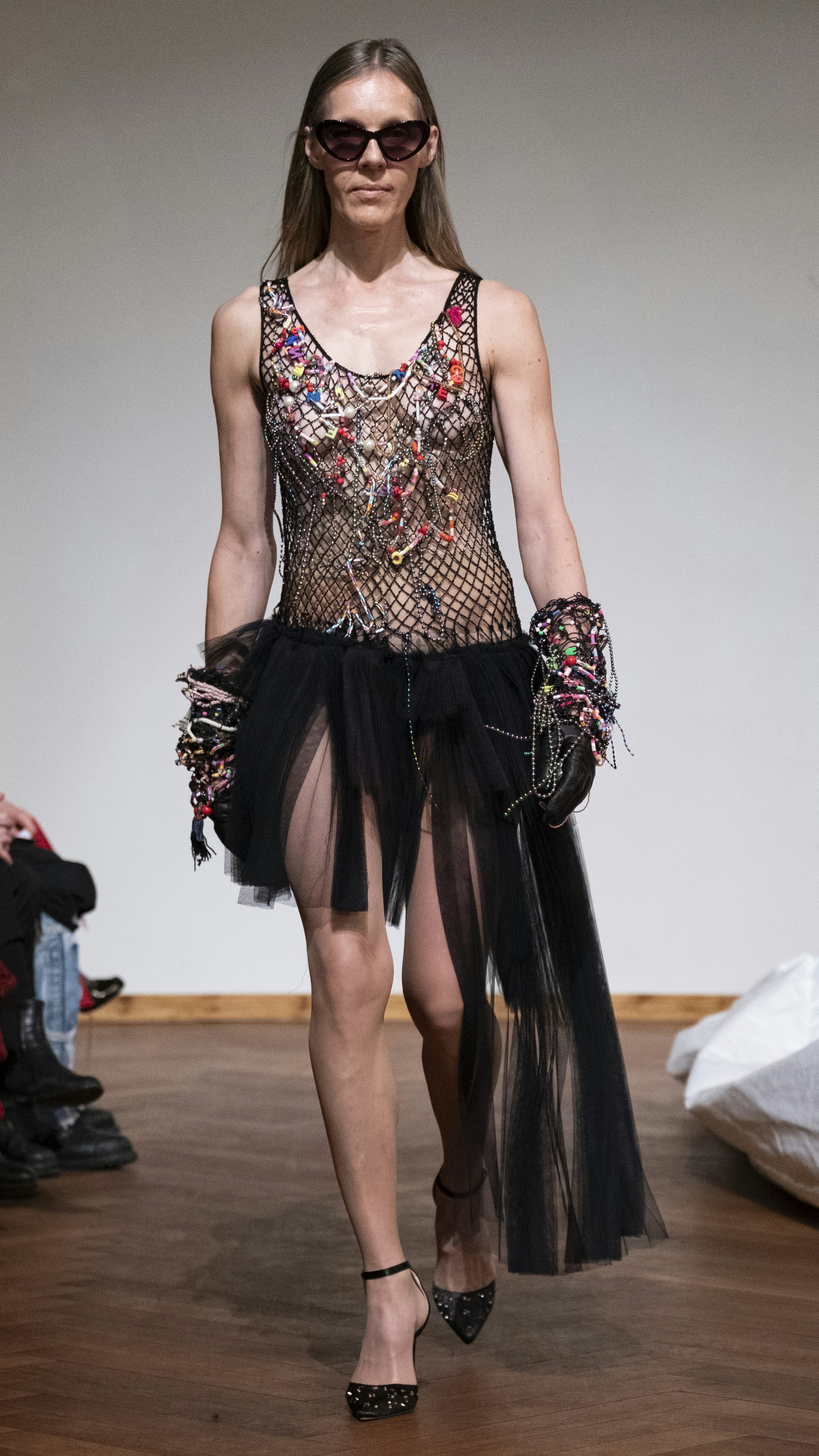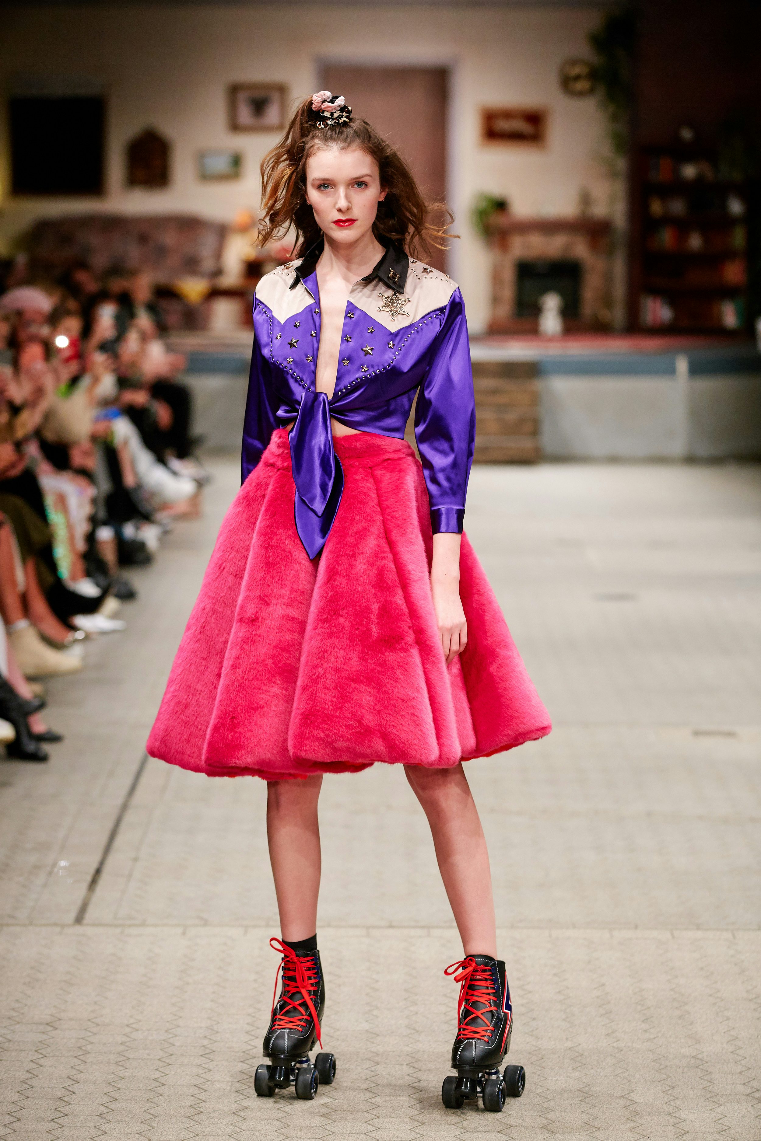 Ein bisschen Nineties, ein bisschen Cowboy, ein bisschen Wonder Woman, ein bisschen Folklore. Und ein Setting, das wohl ein DDR-Wohnzimmer darstellen soll. Marina Hoermanseder wollte alles auf einmal und hinterließ mich komplett Farb-, Struktur-, Material- und Stil-übersättigt – und ratlos. Die perfekt verarbeiteten Showpieces haben auch diesmal nicht gefehlt – doch ist von dem originellen Handwerk, das der Designerin zu internationalem Ruhm verholfen hat, diesmal wenig übrig geblieben. Über Geschmack lässt sich nicht streiten, das ist mir bewusst, dennoch hat mir hier schlicht ein roter Faden gefehlt, der diese Kollektion stimmig und in sich geschlossen zu Ende erzählt.