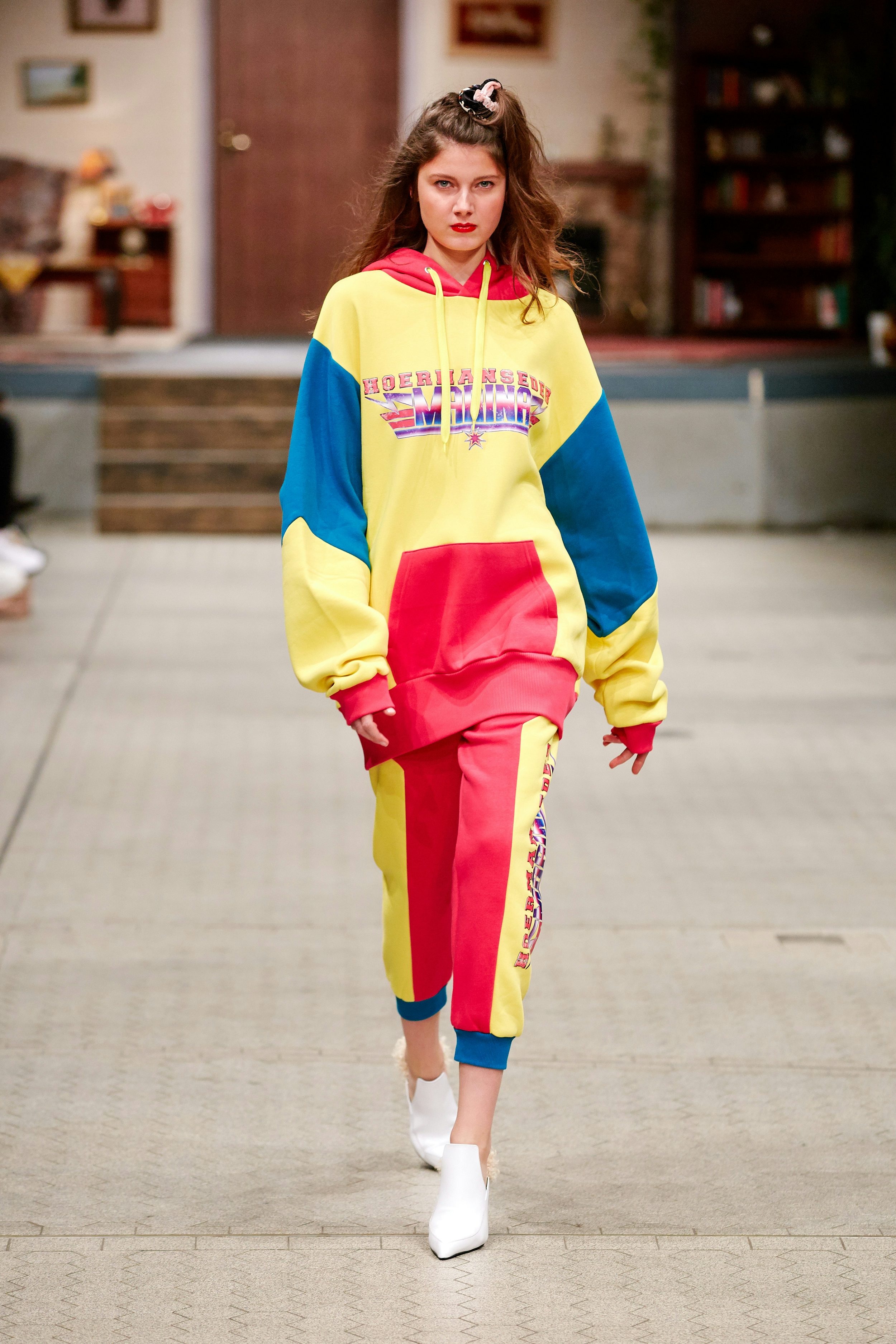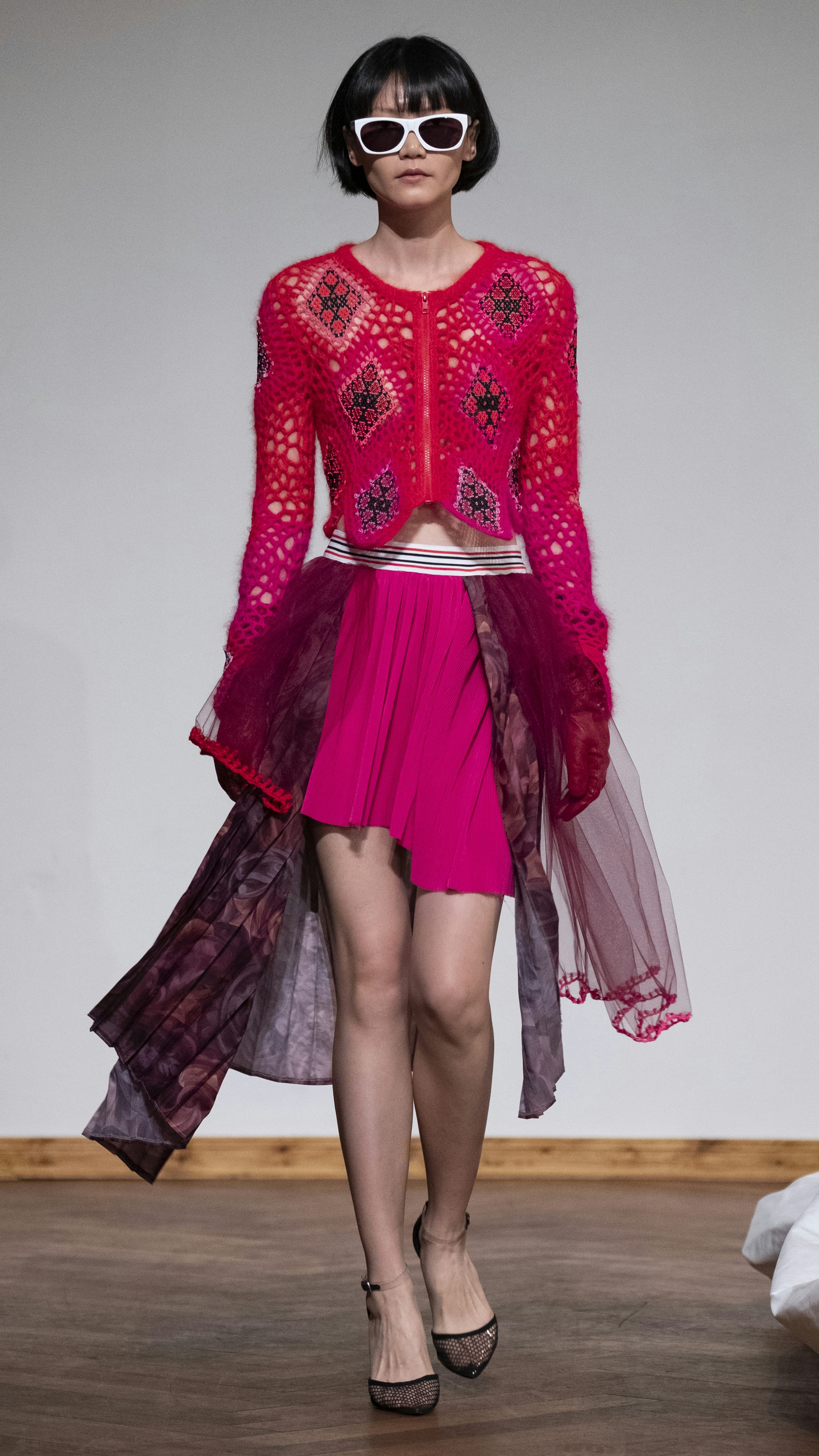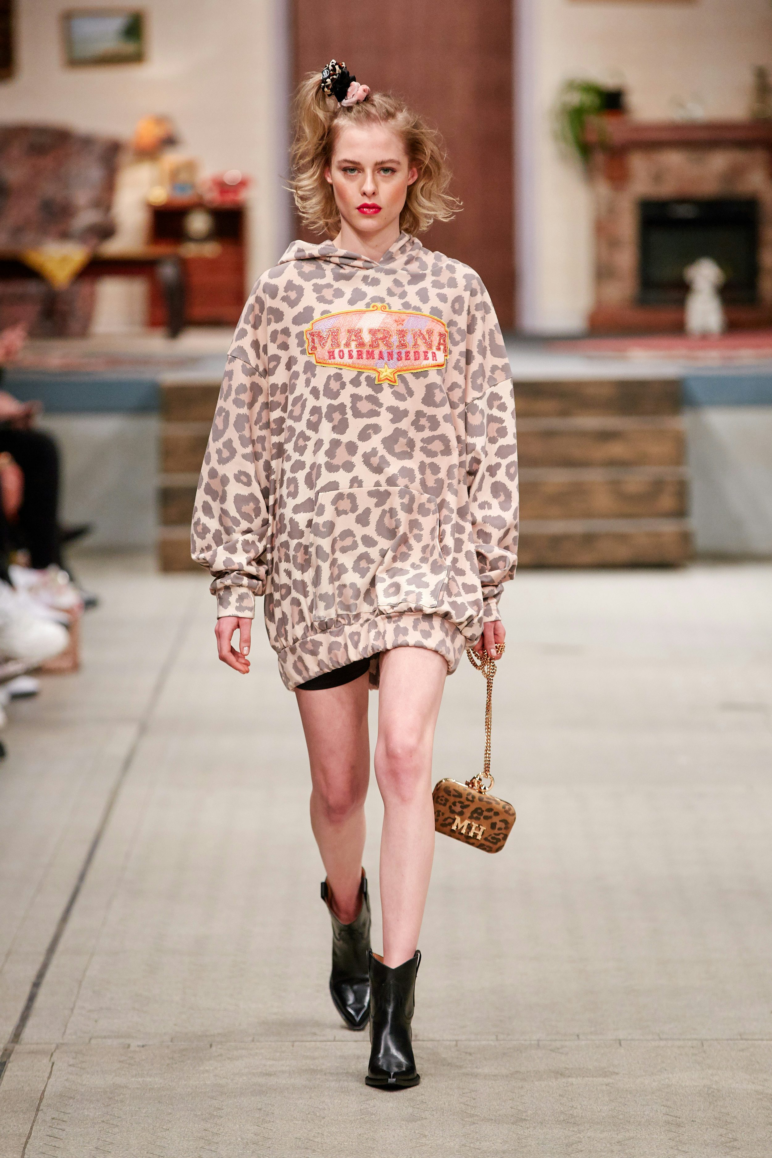 Ein bisschen Nineties, ein bisschen Cowboy, ein bisschen Wonder Woman, ein bisschen Folklore. Und ein Setting, das wohl ein DDR-Wohnzimmer darstellen soll. Marina Hoermanseder wollte alles auf einmal und hinterließ mich komplett Farb-, Struktur-, Material- und Stil-übersättigt – und ratlos. Die perfekt verarbeiteten Showpieces haben auch diesmal nicht gefehlt – doch ist von dem originellen Handwerk, das der Designerin zu internationalem Ruhm verholfen hat, diesmal wenig übrig geblieben. Über Geschmack lässt sich nicht streiten, das ist mir bewusst, dennoch hat mir hier schlicht ein roter Faden gefehlt, der diese Kollektion stimmig und in sich geschlossen zu Ende erzählt.