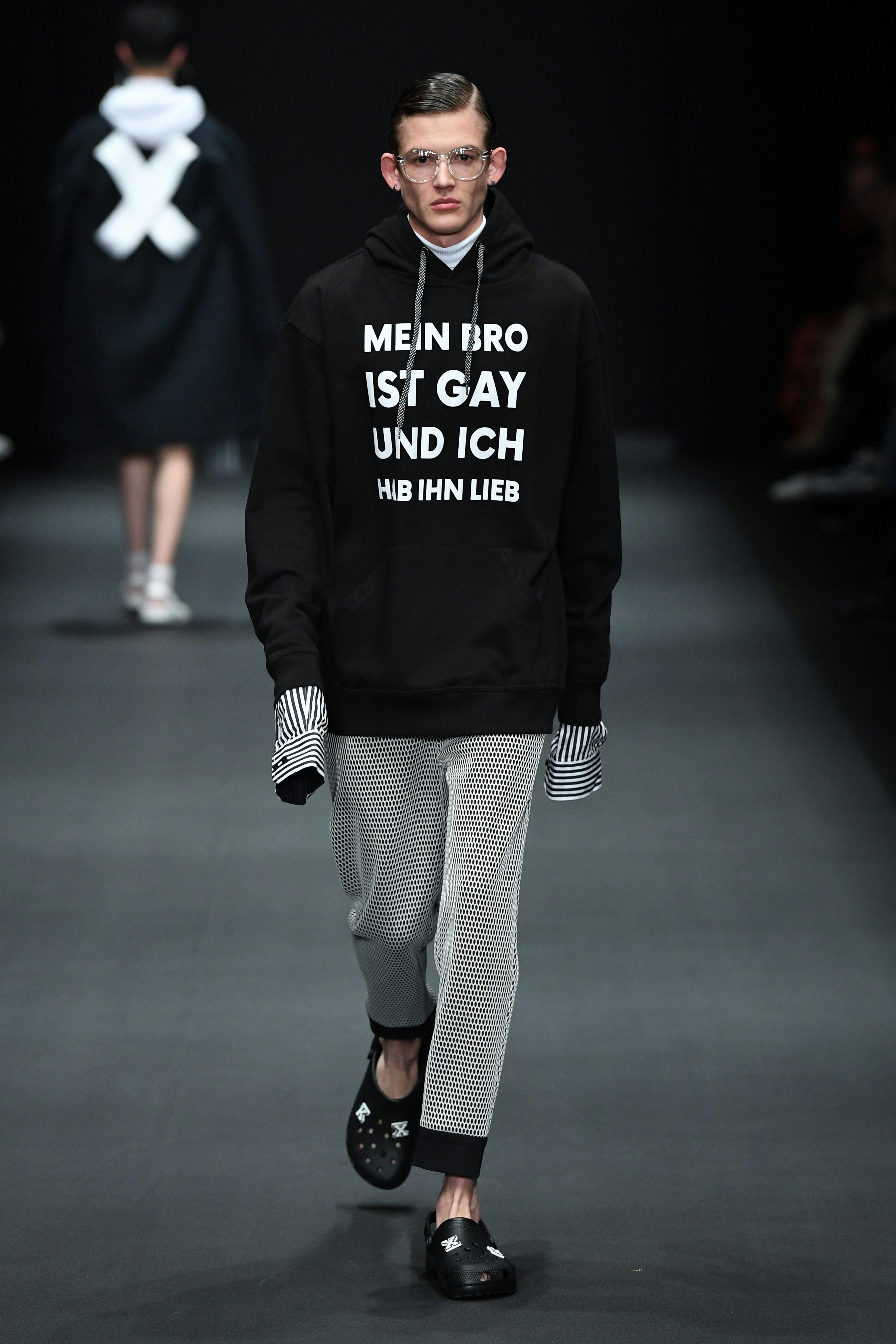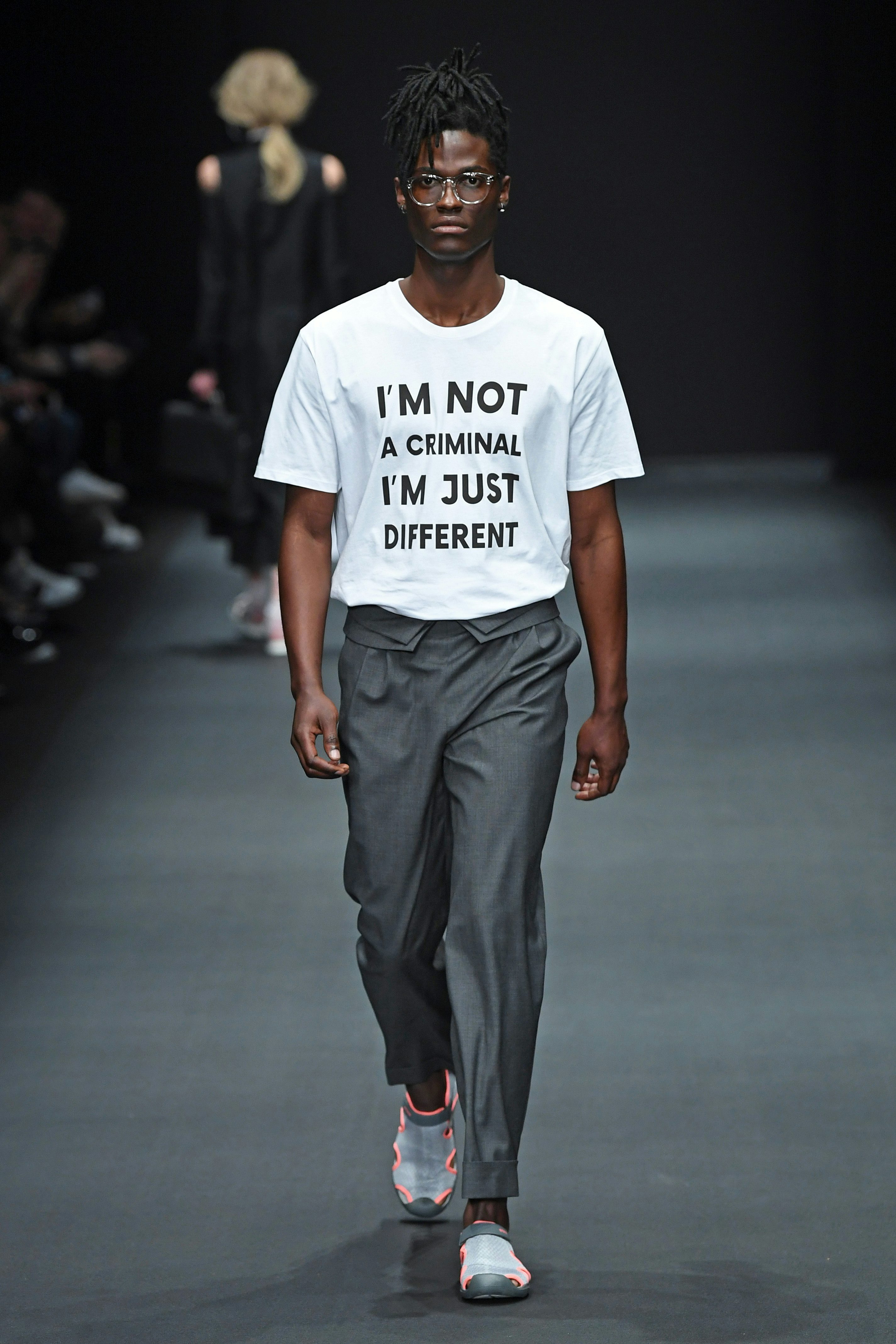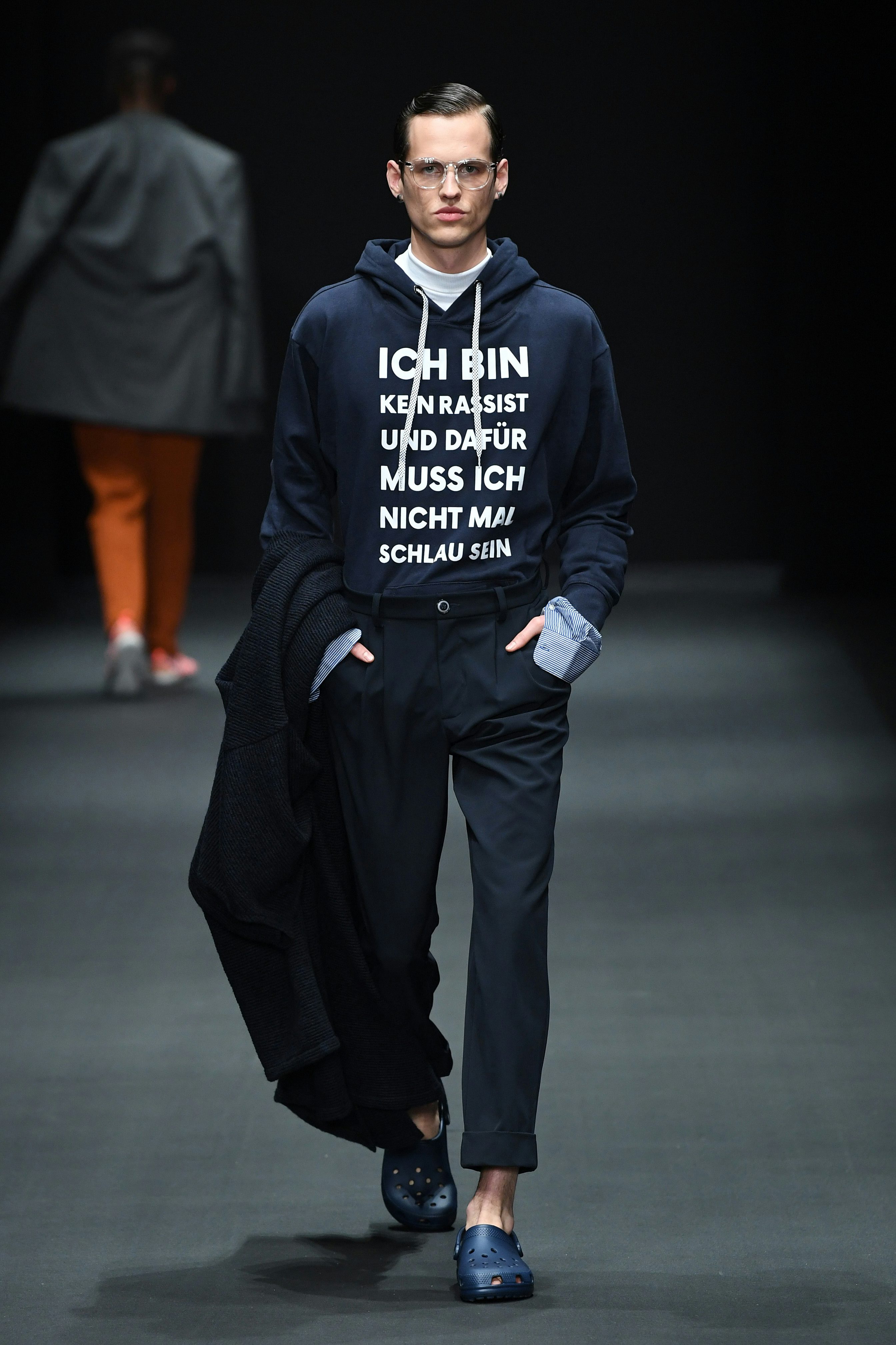 Es gab sie, diese Fremdschäm-Momente während der Fashion Week. Momente, in denen ich mich plötzlich sehr unwohl gefühlt habe oder ein großes Fragezeichen über meinem Kopf schwebte. Da waren zum einen die Statement-T-Shirts bei Kilian Kerner, der sich jetzt KXXK nennt und auf der Fashion Week sein Comeback feierte, die ein ganz klarer Fall für „gut gemeint heißt nicht gut gemacht“ waren. Ein schwarzes Model indirekt als „anders“ zu bezeichnen ist schon sehr problematisch. Immerhin weist der Druck aber darauf hin, dass der Träger des T-Shirts nicht kriminell ist. Ich vermute, dass hier auf das Thema Geflüchtete angespielt wird. Das Statement trägt zu Toleranz und einem Miteinander auf Augenhöhe leider nichts bei.