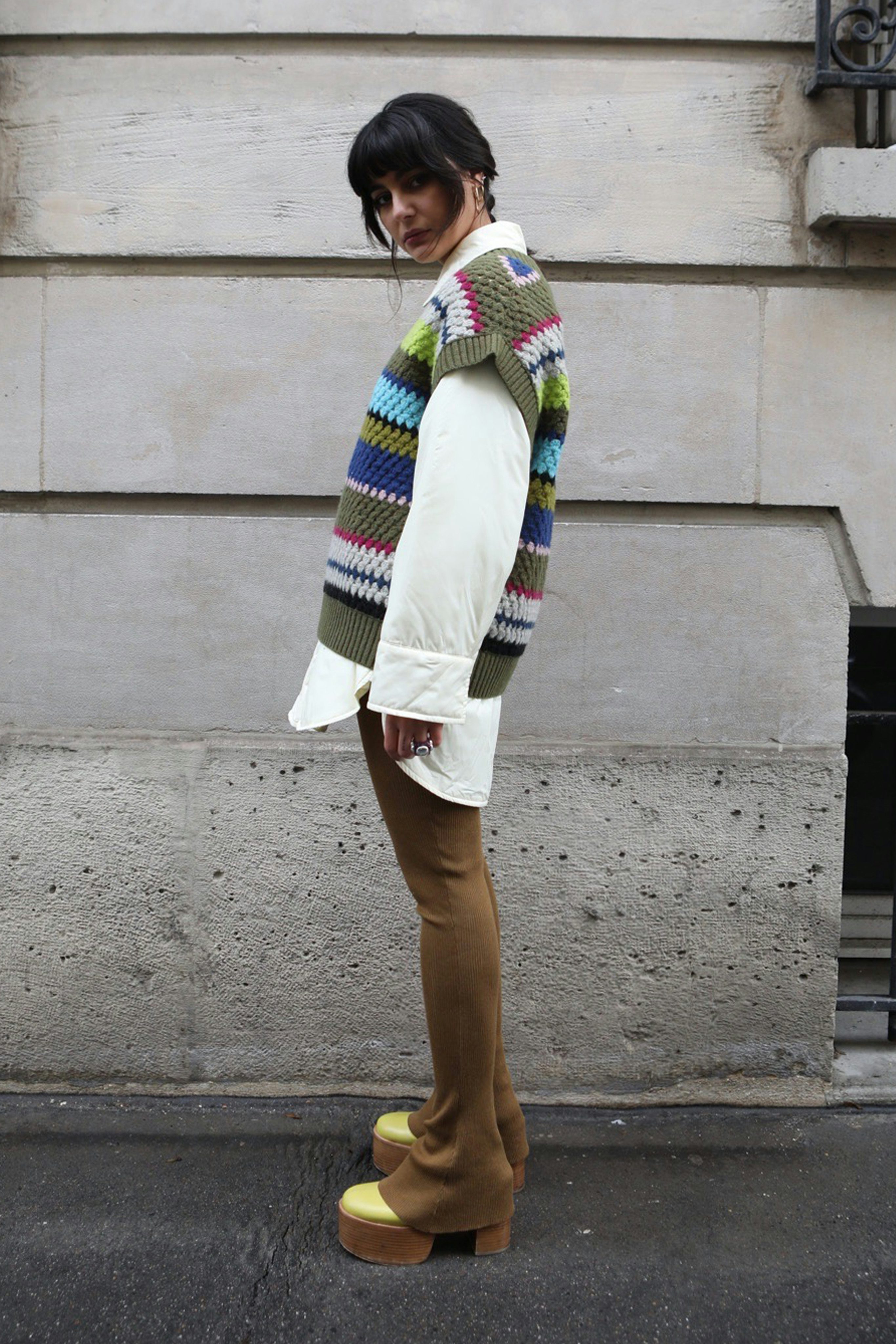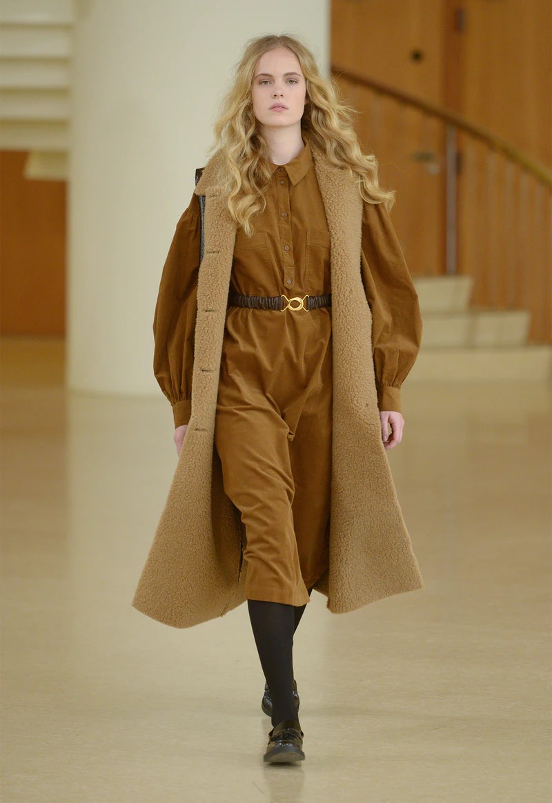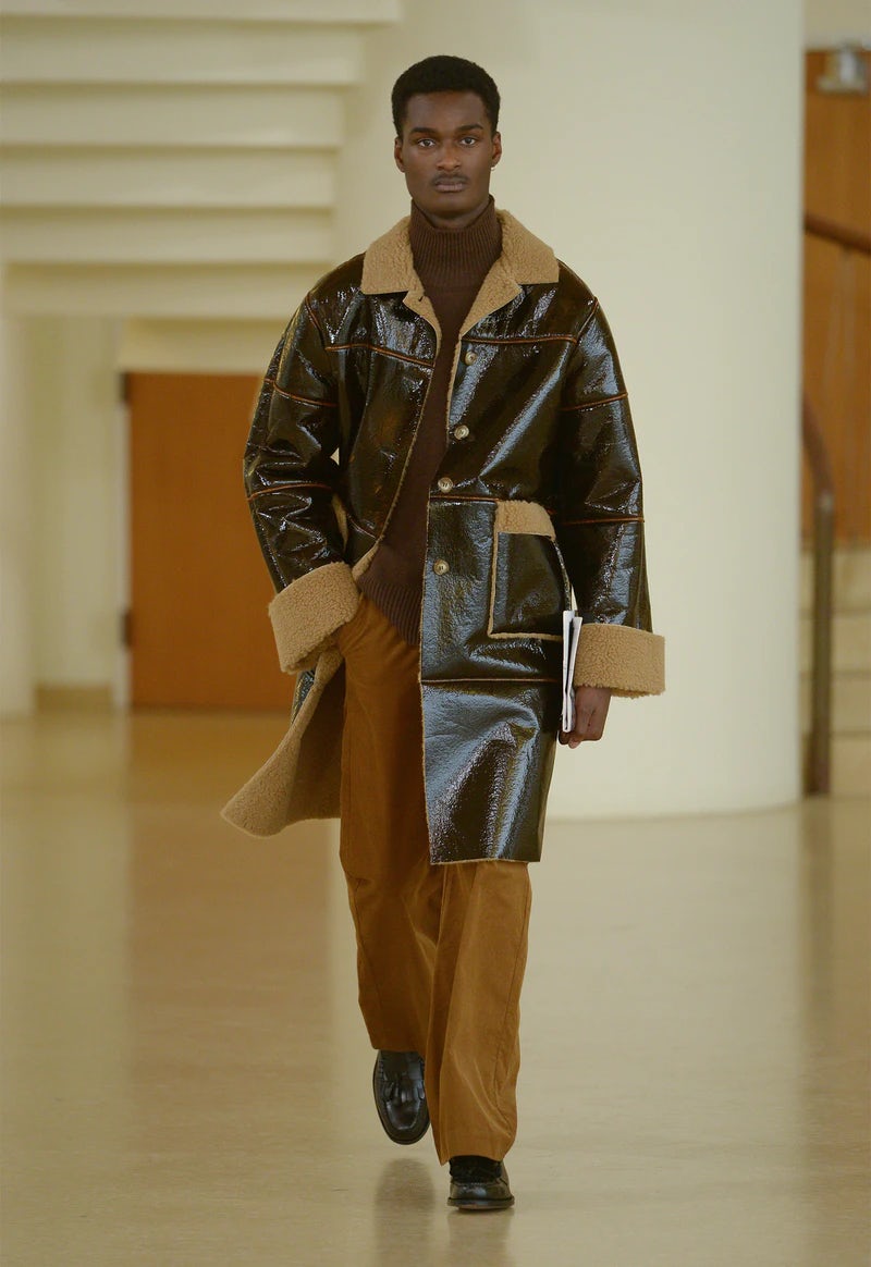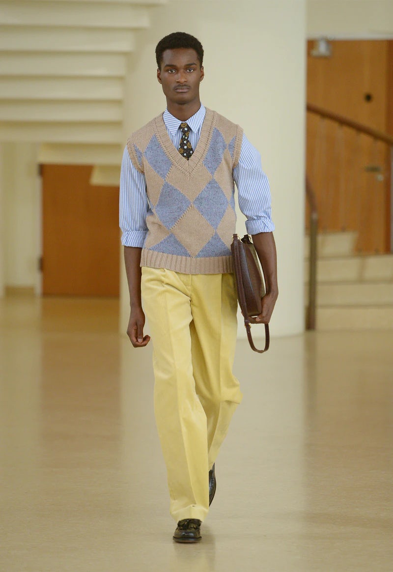 Die Vibes, die die Mode dabei versprühte, waren ganz klar an die Siebziger, eben das Jahrzehnt für das das Brand steht, angelehnt. Warme Karamelltöne trafen auf lässige Ledermäntel, Allover-Prints, Midi-Längen und die coole Spießigkeit von Pullunder, Hemdblusenkleidern und Argyle-Mustern wurden mir wieder erneut ins Gedächtnis gerufen.