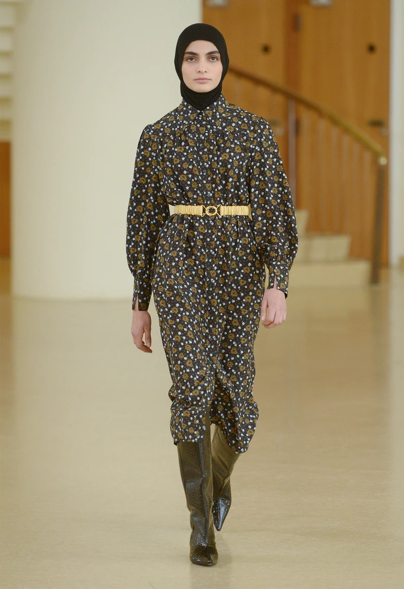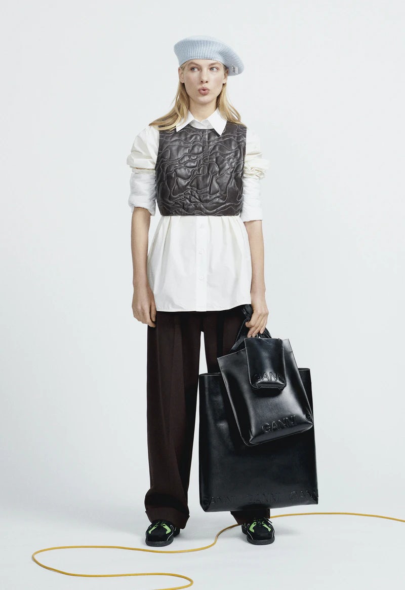 Und wie sieht sie nun aus, die Mode, die uns in ungewissen Zeiten Halt geben soll? Die Optimismus schenkt? Eines ist schon mal klar, sie besteht aus ganz viel GANNI-Classics, arbeitet mit viel Leder und Quiltmustern, knallt mit 90s-Neongrün und ist doch mit großen Rosenprints und Paisley-Muster auf ironische Art und Weise romantisch. Übergroße Hemden, Kleider, Weste und Blusen lassen Platz für Fantasie – und ein Foodbaby! So mag ich das!