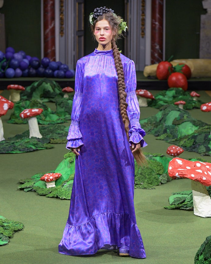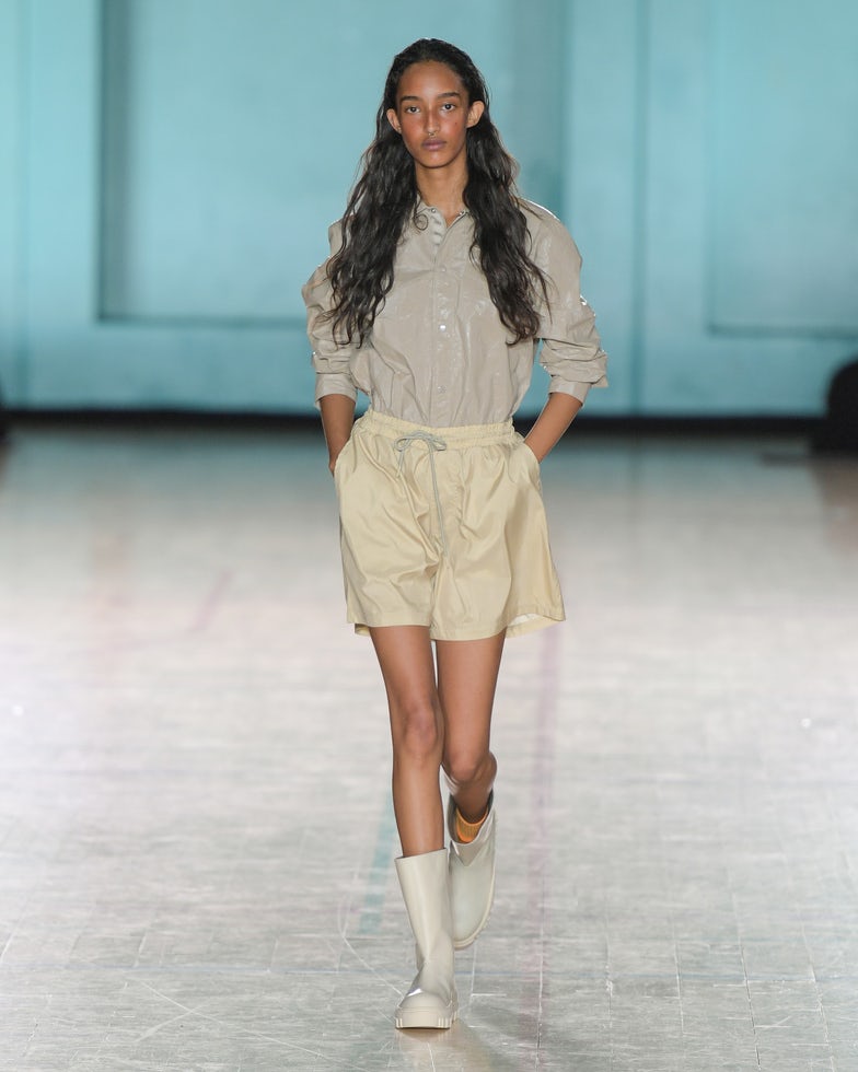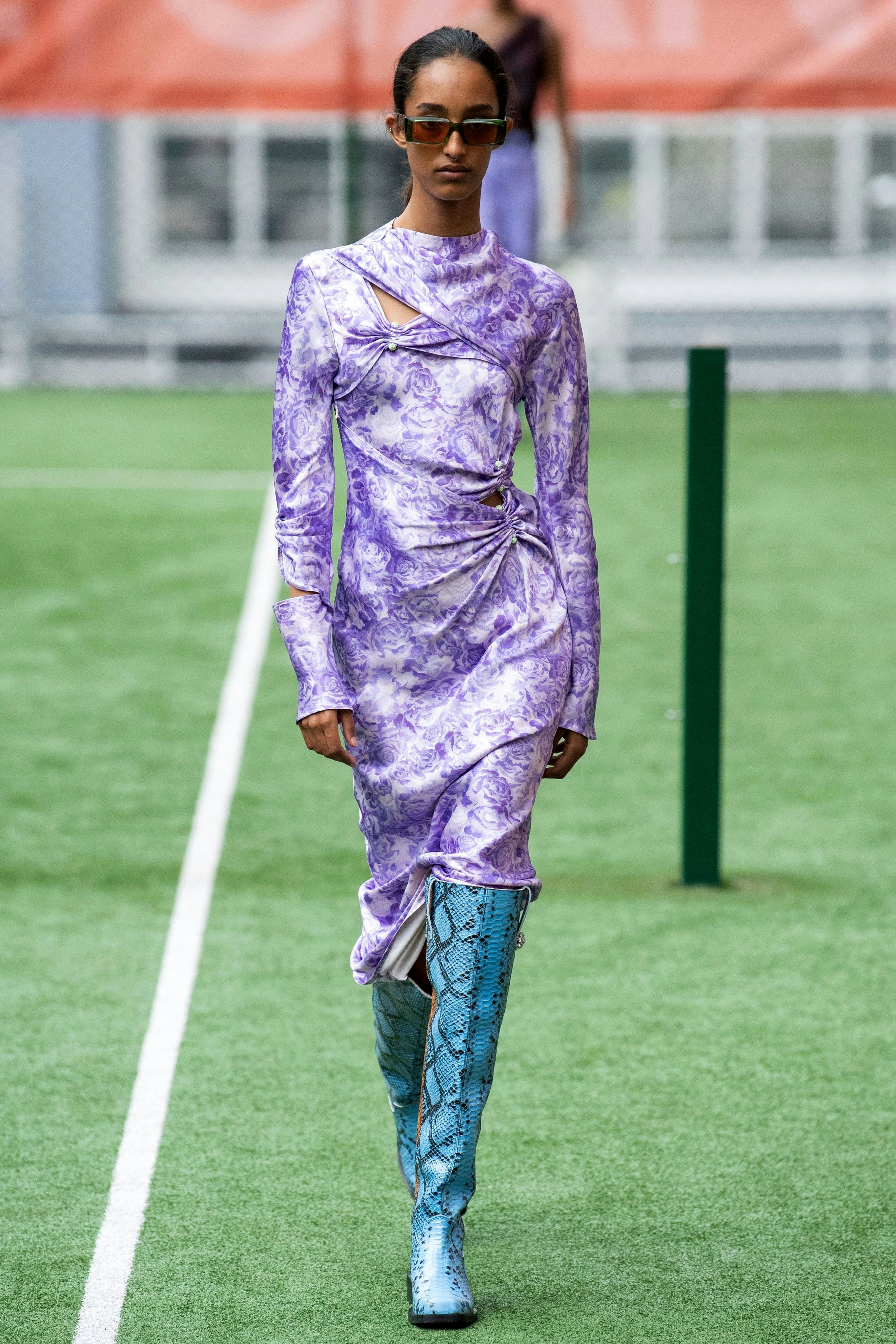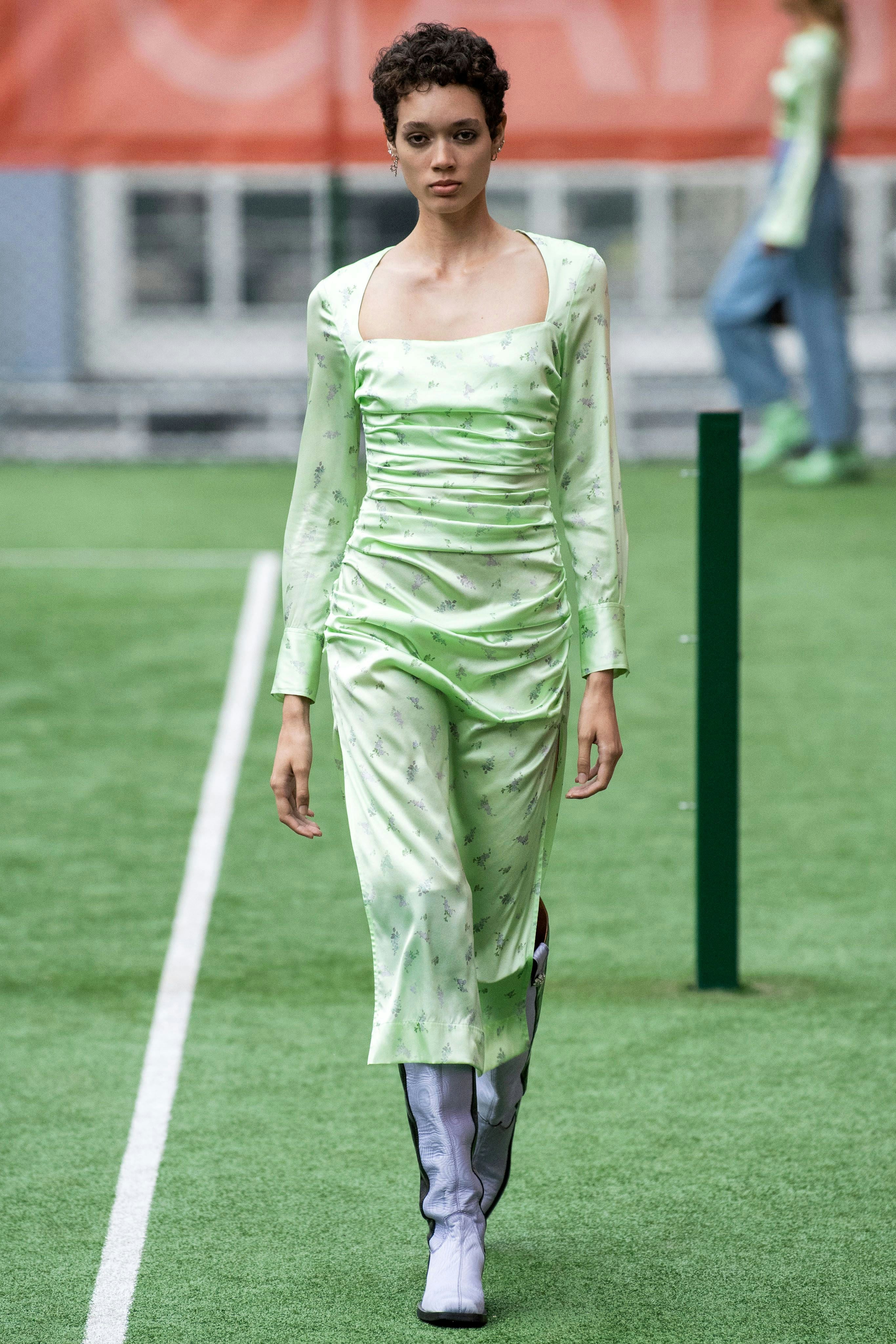 The word on everybody’s lips: Ganni. Ich bin erstaunt, wie viele Einflüsse sich in dieser Kollektion erkennen lassen. Das pastellgrüne glänzende Kleid weckt bei mir direkt Flashbacks von Pradas legendärer SS96-Show voller Ugly-made-chic-Teile. Das drapierte Gegenstück in Lila verarbeitet Omas gut erhaltene Gardine und kombiniert sie mit Perlen und blauen Cowboy-Boots aus Schlangenleder. Das plus der Kunstrasen, auf dem die Show stattfand: Eine GmbH-Vision, für die ich 100 % hier bin. Auch Look Nummer 3, eine Mischung aus Nylon-Clubwear, Strandschuhen und Strickliesel, finde ich außerordentlich ästhetisch. Remix-Kultur at its finest.